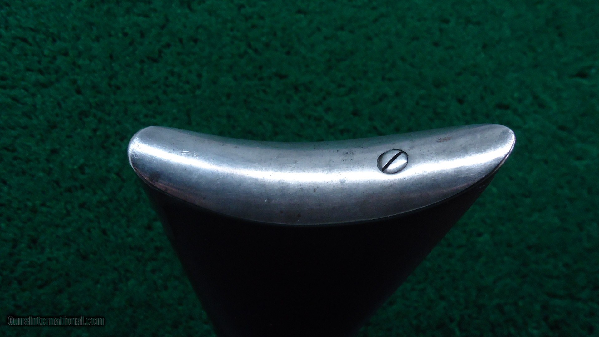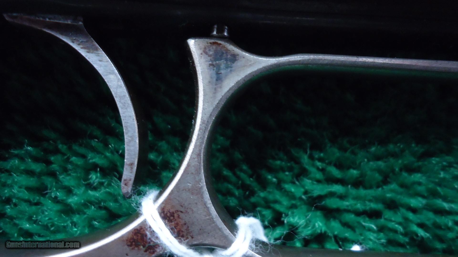 Description: Standard 26 inch octagon barrel chambered in 32-40 caliber with a bright shiny excellent bore. Full length magazine tube. Original sights include a German silver blade front and buckhorn sporting rear. About 60-70% original blue remain on the barrel and mag tube. Sharp markings. Receiver retains most thinning blue with the balance turning gray at the carry point. Faint case colors on the hammer and lever. Some good nitre blue on the loading gate. Re-oiled walnut stocks look and fit good with only minor handling mars. With the crisp action and excellent bore this should be a very good shooter. A good old honest Winchester from 1907. Leroy Merz Antique Firearms specializes in antique and vintage Winchesters and other fine American firearms. Since 1965 Mr. Merz has taken part in the world of firearms and has been a contributor to many well known reference books. We have hundreds of additional guns in every price range at our home online. Search for Merz Antiques in google. SOLD Curio/Relic: Yes Rifle Caliber: .32-40 Winchester |