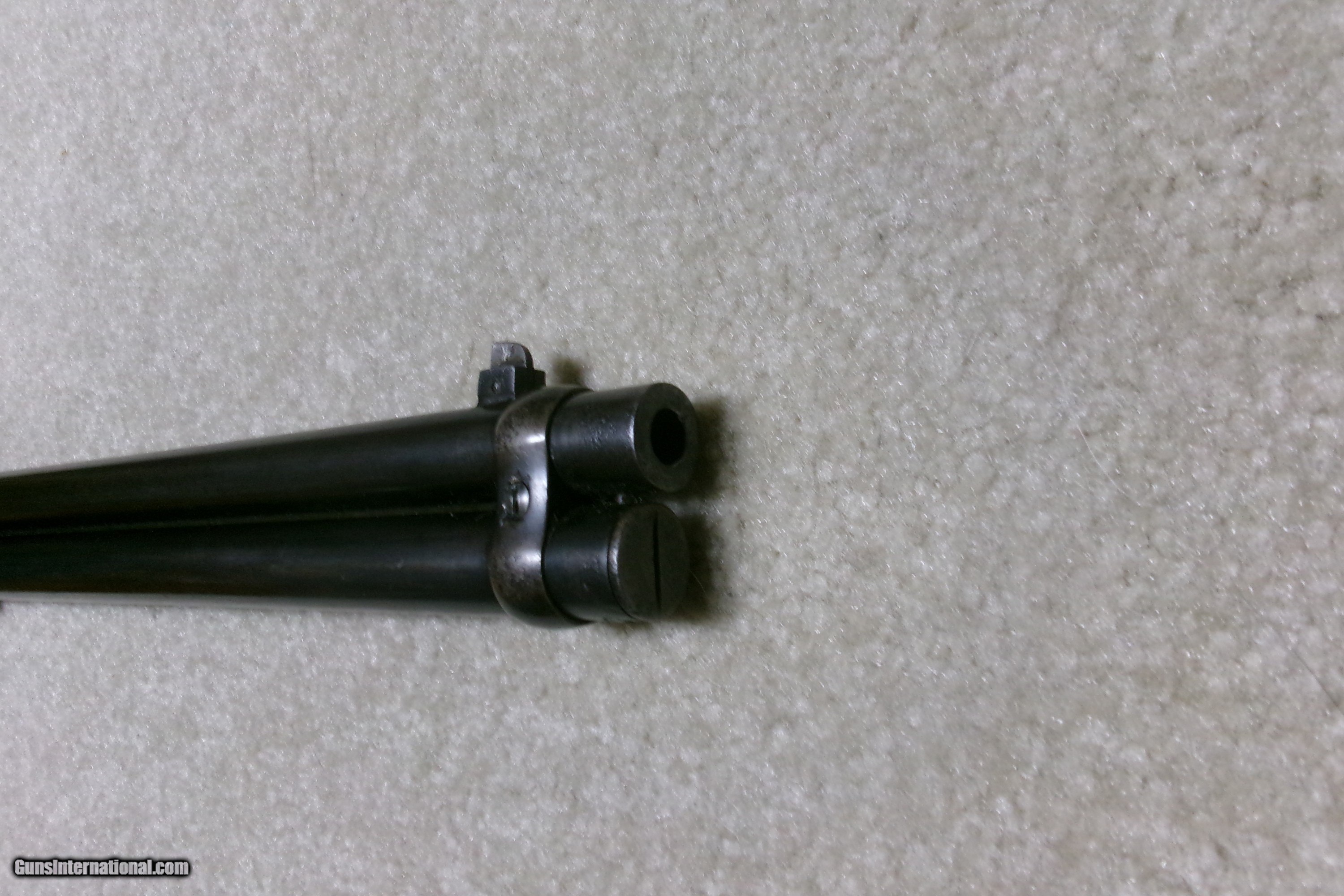 Description: EXTREMELY RARE 1894 "FRENCH CONTRACT" .30 WCF SADDLE RING CARBINE WITH SIDE MOUNTED SLING SWIVELS, #657XXX, MADE 1914. In the past these were called "Belgian Congo" carbines, but actually they were on a World War I contract with France who later sold some to the Belgians as surplus. Some of those may have later Belgian proof marks. This example is one of the best of the few I've seen over the decades. The receiver shows good aged blue on the sides with some brown mixing. Similarly, the barrel and mag tube show good lightly aged but deep blue. It is in the correct serial range for these and has the correct side mounted sling swivels- the one in the left side of the butt stock is inletted and held by two screws with the forward swivel placed with a holding tab inletted under the barrel band. Importantly, the rear carbine ladder sight is marked on the ladder face "METERS" with graduations going up to 1000. These were all fitted with gumwood stocks and the wood on this one is surprisingly good, showing only normal light handling with very tight wood to metal fit- may have had some stock finish added but not sanded. The action is tight with strong safety half-cock and has an excellent bore that is only a little dark at worst. A rare Winchester and one with great World War I history! SOLD Curio/Relic: Yes Rifle Caliber: .30-30 Winchester Manufacturer: WINCHESTER Model: 1894 SRC Serial Number: 657XXX Barrel Length: 20 Condition: FINE Bore Condition: EXCELLENT |