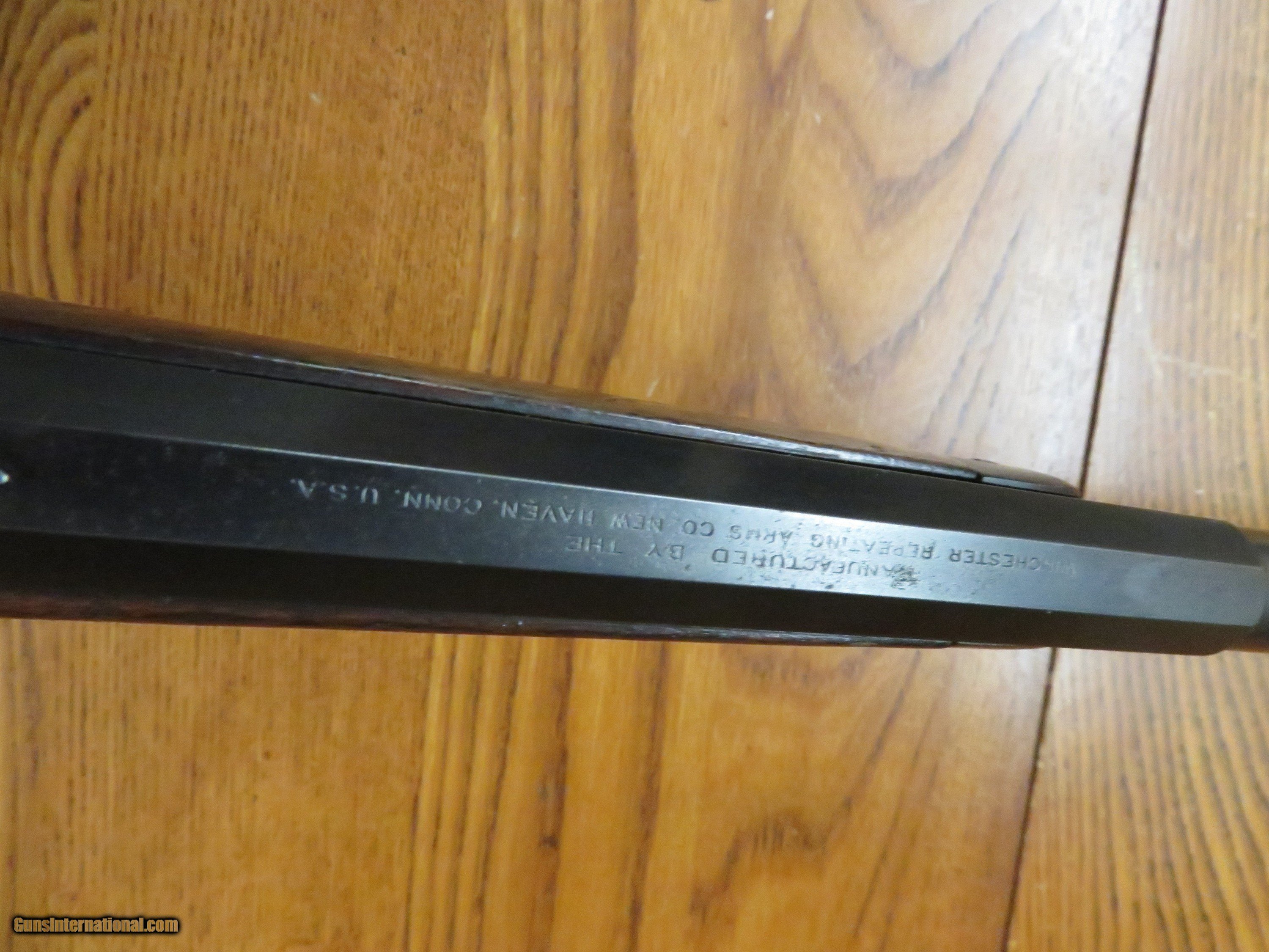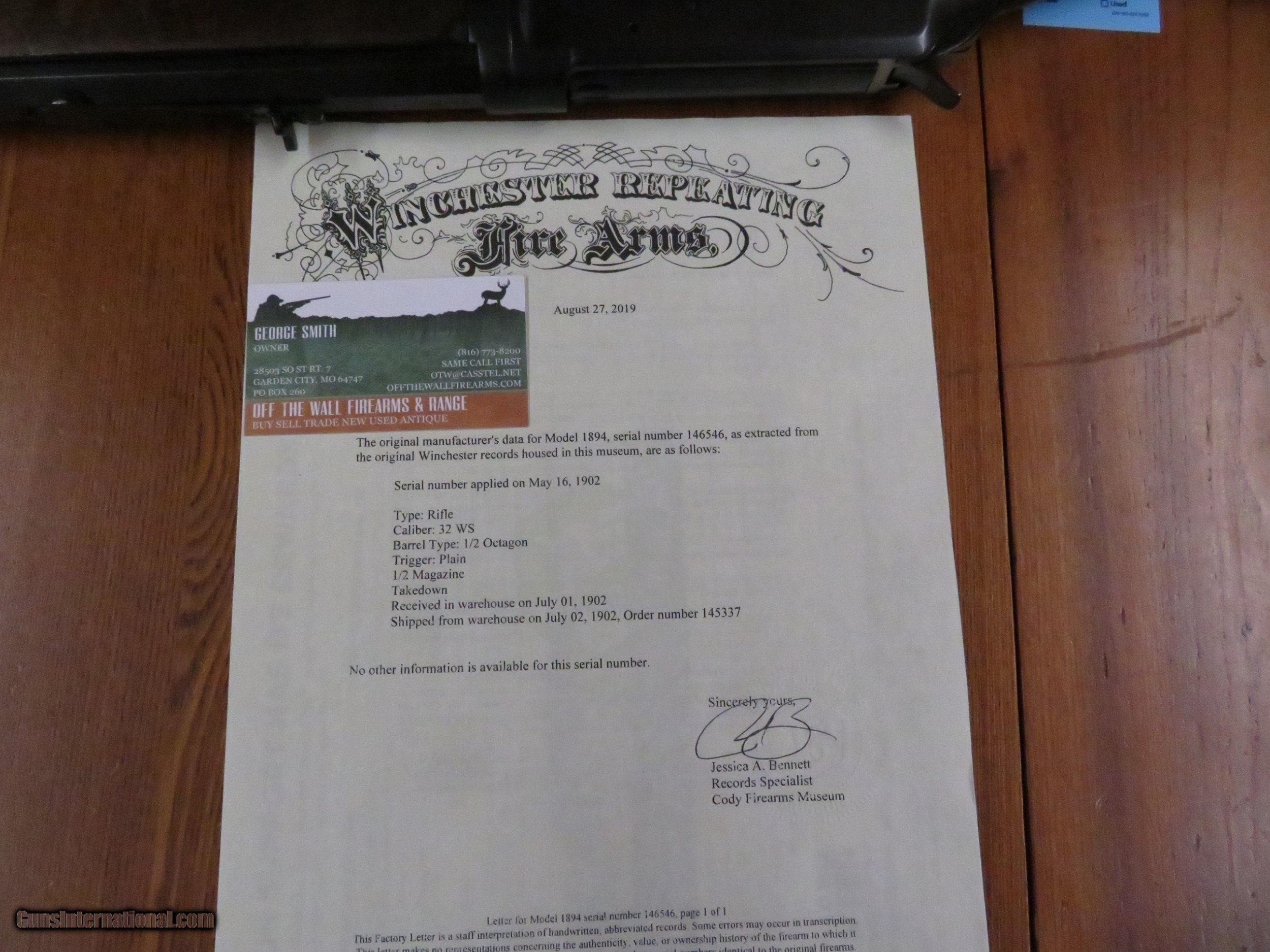 Description: VERY NICE WINCHESTER 1894 TAKE DOWN HALF ROUND HALF HEX CRESENT BUTT 32 WIN SPECIAL BUTTON MAG WITH WINCHESTER FACTORY LETTER WILL PRIORITY TO LOWER 48 $125.00 WITH INS. AND TRACKING SOLD Rifle Caliber: .32 Winchester Special, .32 Manufacturer: WINCHESTER Model: 94 Bore: GOOD Condition: VERY NICE Metal Condition: VERY NICE Wood Condition: VERY NICE FEW SCUFFS SEE PICS Bore Condition: GOOD |