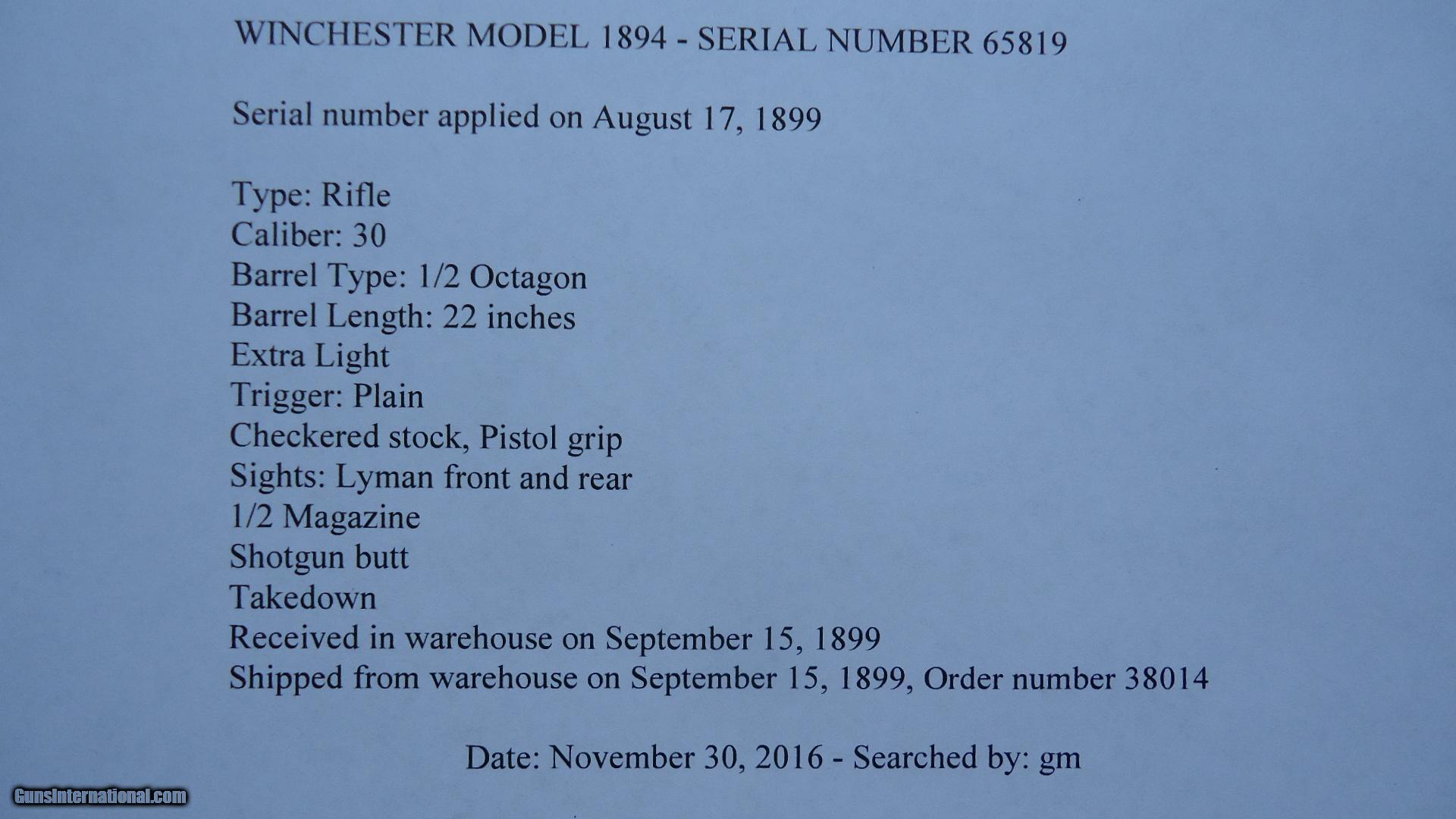 Description: 22 inch half octagon tapered barrel with a good bore. Take down frame. Deluxe checkered wood with pistol grip. Shotgun style butt with a steel butt plate. Rear tang sight with 3 leaf rear and a combination front. Thinning blue on barrel. Receiver is mostly a brown/gray patina. Traces of case colors on lever and hammer. Wood is in good condition with lots of original varnish remaining and the usual handling mars that you would see on a rifle from 1896. Research form verifies the features. Leroy Merz Antique Firearms specializes in antique and vintage Winchesters and other fine American firearms. Since 1965 Mr. Merz has taken part in the world of firearms and has been a contributor to many well known reference books. Just recently we mailed the 127th edition of our privately-published catalog. We have hundreds of additional guns in every price range at our home online. Search for Merz Antiques in google. SOLD Antique: Yes |