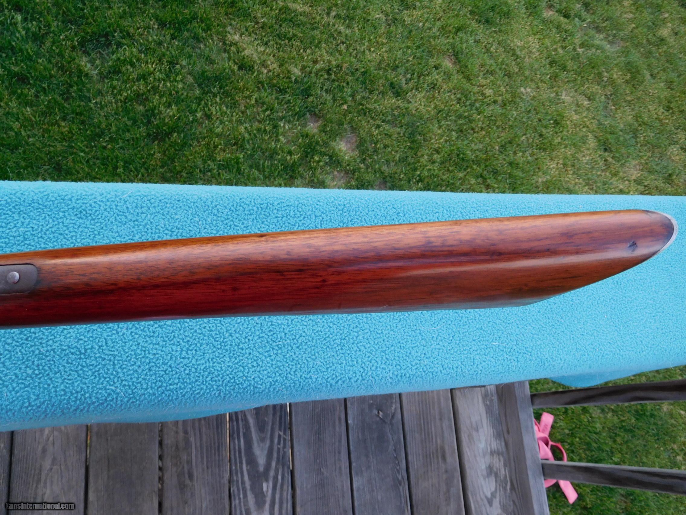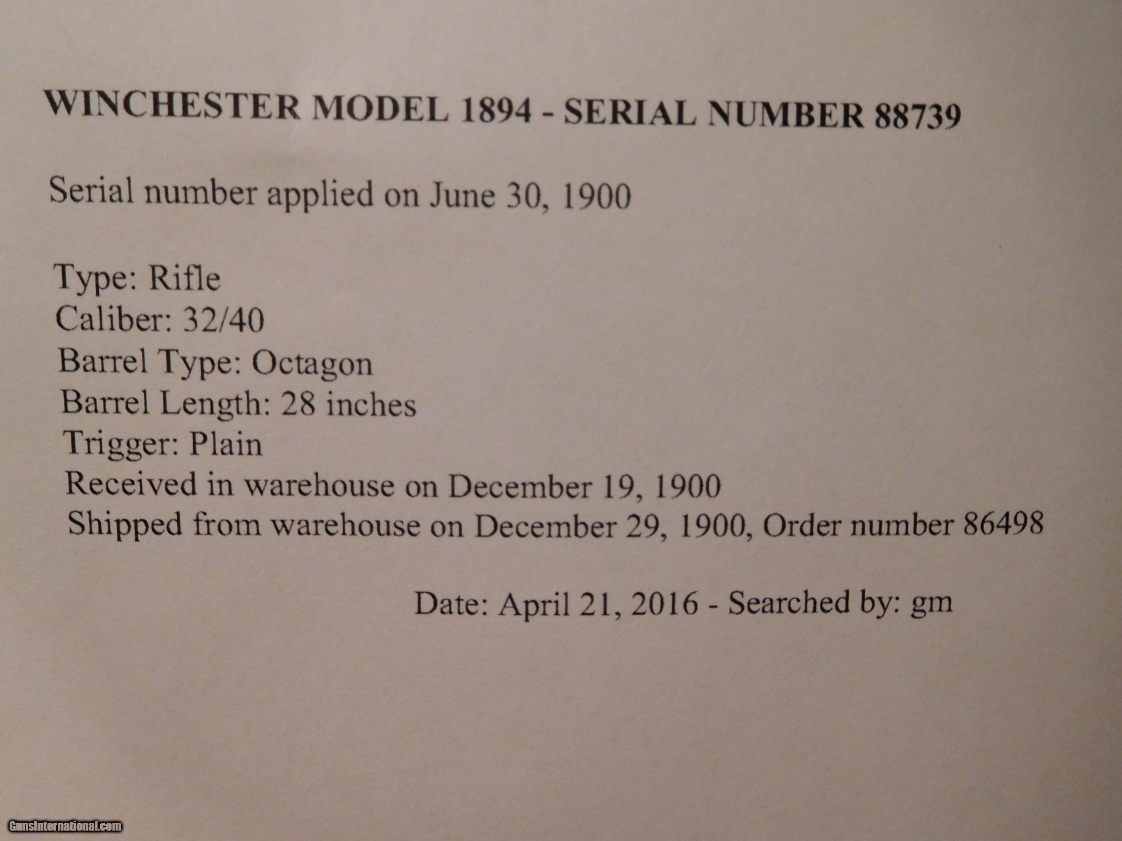 Description: You are viewing one used Winchester Model 1894 lever action rifle in caliber 32-40. This is a special order rifle that has a factory 28" octagon barrel, 2 inches longer than standard and will letter as such (see last pic). Due to the fact that extra long barrels were discontinued in 1908, any 1894 with a longer barrel is quite a rarity. Otherwise this is standard in every other way - full magazine, crescent buttplate. Original sights include the Rocky Mountain rear sight with serrated edges and early elevator and a knife blade front sight. Bore is very good, an 8 of 10, strong rifling with scattered very light pitting, and is accurate - I have shot this with factory ammo and it held a three-shot group inside a silver dollar at 50 yards. Action is crisp and tight; half-cock safety functions as normal. Not warranted as a shooter though unless you have it inspected by a competent gunsmith. Stocks have been very lightly cleaned and re-varnished, are very nice looking, thankfully not sanded down and still maintain nice fit to the metal. No splits, no cracks, no extra holes. Bluing is a mix of patina with nice blue undertones in the sunlight, scattered oxidation marks here and there but no deep pitting whatsoever. All in all a solid special order 1894 rifle that is pleasing to look at and shoot and will certainly increase in value over time. No international sales and no sales where prohibited. This is an antique so it can be shipped direct to your door as long as your local laws allow it, must have copy of driver's license and be 21 or older please. Add $50 for packing, shipping and insurance. Payment via PayPal discreetly, bank check or USPS money orders. A 3-day non-firing inspection is allowed but do not disassemble the rifle or the inspection period will be null and void, return shipping the responsibility of the buyer. Copy of Cody Museum research sheet will be included with the rifle. Email or call with questions, concerns, reasonable offers. SOLD Antique: Yes Manufacturer: Winchester Model: 1894 Serial Number: 88739 Caliber Info: 32-40 Bore: Very good Condition: Very good Metal Condition: Very good Wood Condition: Very good as refinished Bore Condition: Very good Barrels: 28" Full Octagon Barrel Type: Steel Action: Lever Triggers: Single/plain Stock: Walnut Stock Dimensions: Standard Fore End: Walnut Butt Pad: Steel LOP: Standard Manufacture Date: 1897 |