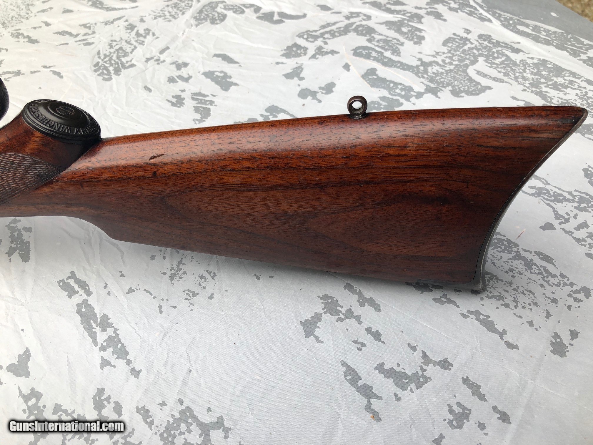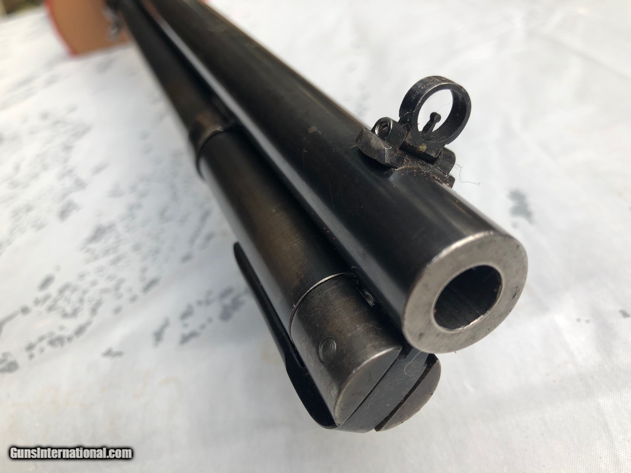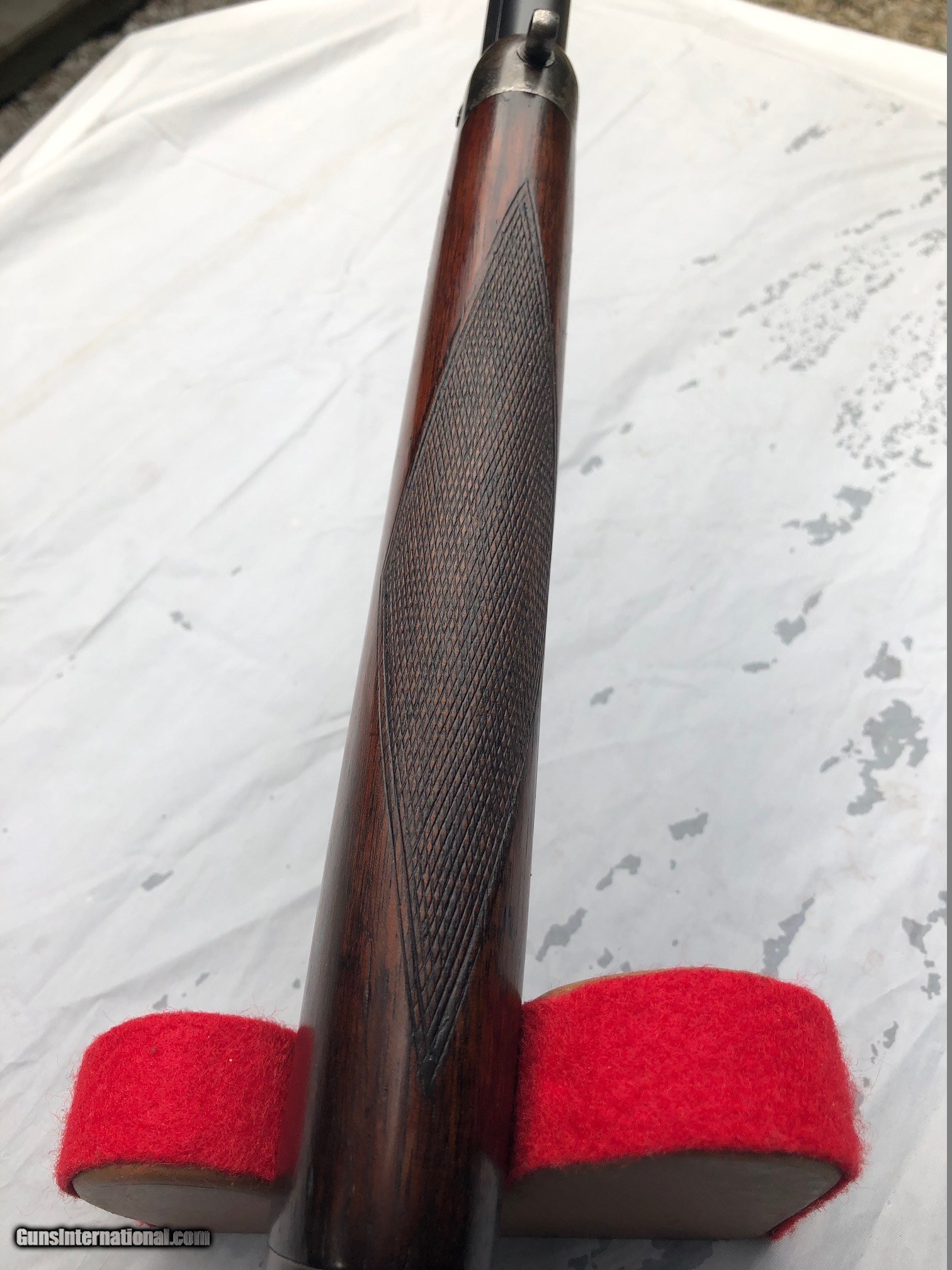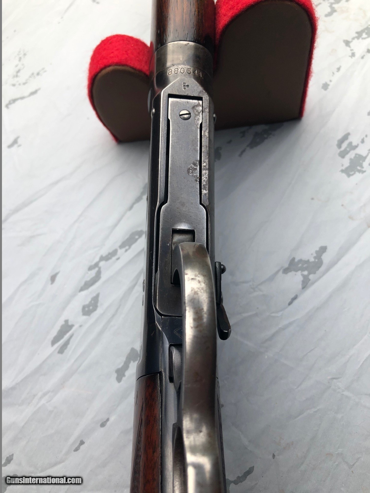 Description: Very interesting special order Deluxe short rifle, 22" barrel with take down feature. Barrel retains 90% plus original blue, with nickle steel barrel and excellent bright shinny bore. Receiver is nice with vivid fire blue loading gate. Rifle is factory fitted with Lyman 21 receiver sight or "Climbing Lyman" and Lyman beech comb front sight and standard sporting rear. The capped pistol grip stock is very clean with minor impressions, and sharp checkering. Note "small chip out left hand side back of receiver" . Wood retains virtually all it's original varnish. Gun is stamped with British proof marks on the left hand side of the barrel. Great special order deluxe gun in a sought after caliber 38-55. MFG 1920 Too late to letter, but this rifle is all original Winchester . I've shot this rifle it's tight and grouped well. SOLD Curio/Relic: Yes Serial Number: 880541 Manufacture Date: 1920 |