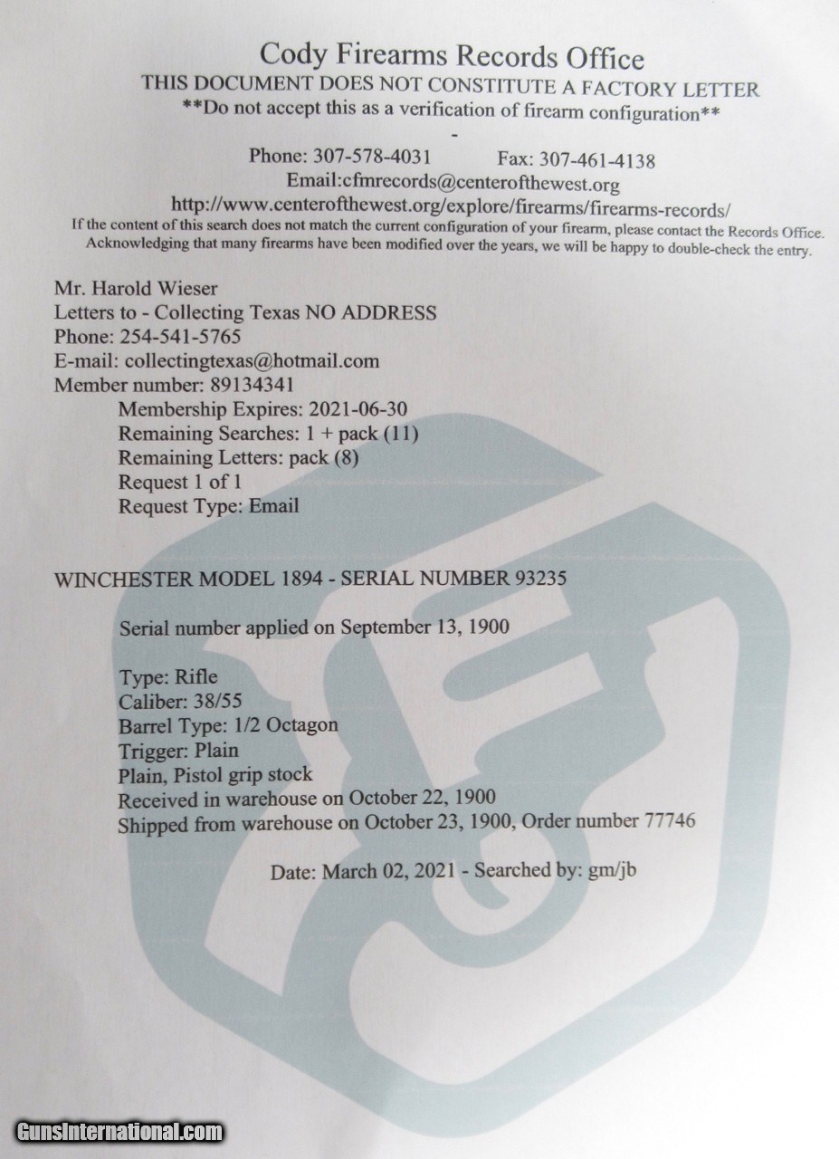 Description: SOLD--Winchester Model 1894 Special Order Rifle; Serial No. 93235; Cody Firearms Records Indicates 38/55 Caliber, ½ Octagon Barrel, Plain Trigger and Pistol Grip Stock; Shipped October 23, 1900; Excellent Antique Condition with 26” Barrel; 100% Correct and Original; Lots of Original Blue and Varnish Remains; Perfect Action and Excellent Strong Bore; Original Case Colors on Lever Silvered Out; Special Order #77746; Really Fine 124 Year-Old 38/55 Winchester Rifle; See All Photos for Condition; No Texts; Call (254)541-5765 or Email Only; PERSONAL PROPERTY of Harold Wieser; Price: $2,900 + $75 S&H Via UPS Ground; Payment Address: Harold Wieser - 1466 U.S. Hwy 77 - Rosebud, TX 76570; SEND PAYMENTS VIA USPS PRIORITY MAIL; SOLD Antique: Yes Manufacturer: Winchester Model: 1894 Serial Number: 93235 |
