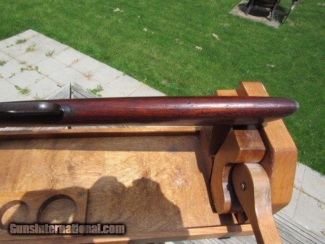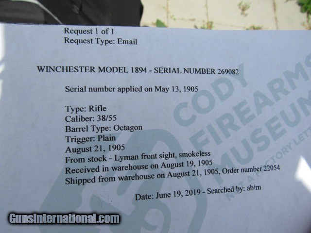 Description: DESCRIPTION: Winchester Model 1894 rifle, standard configuration of 26" octagon barrel, full magazine and crescent butt, caliber 38-55. Has special order Lyman front sight. Serial # 269082 was applied on May 13, 1905, warehoused on August 19, 1905, front sight installed August 21, 1905 and shipped later that day to order # 22054. Copy of Cody Museum email sheet will accompany the rifle. One of a handful that I am listing that I just acquired from a local estate - previous owner purchased this rifle in 1959 so it has been tucked away for 60 years!! CONDITION: Receiver, barrel and mag tube retain 80-85% original bright blue toning to plum. Lever, hammer, butt plate and fore end cap have silvered out with traces of the original case colors present. Loading gate retains 20% original bright fire blue. Stocks are sound with no splits or cracks, never sanded or refinished, no extra holes, still tight and proud, with a couple of dings and one big owee on the top comb by the butt plate. Bore is very good with strong, consistent rifling and light minor roughness, an 8 of 10. Action is tight and hammer spring strong. Half cock safety functions as it should. Have a competent gunsmith check it over before firing. Very nice collector and shooter grade Model 1886 in the right caliber. Grades NRA Antique Fine. TERMS: No international sales and no sales to California. Requires FFL or C&R for shipping. Payment by bank check, money order, personal check, or all major credit cards with 3% surcharge. 3 day non-firing inspection. Buyer pays return shipping. Layaway available with 25% down and equal payments over 90 days. Trades considered. Thanks for looking. SOLD Curio/Relic: Yes Manufacturer: Winchester Model: 1894 Serial Number: 269082 Caliber Info: 38-55 Condition: Excellent Metal Condition: Excellent Wood Condition: Excellent Bore Condition: Very good Barrels: 26" octagon Action: Lever Triggers: Standard/plain Manufacture Date: 1905 Item Location: New York |