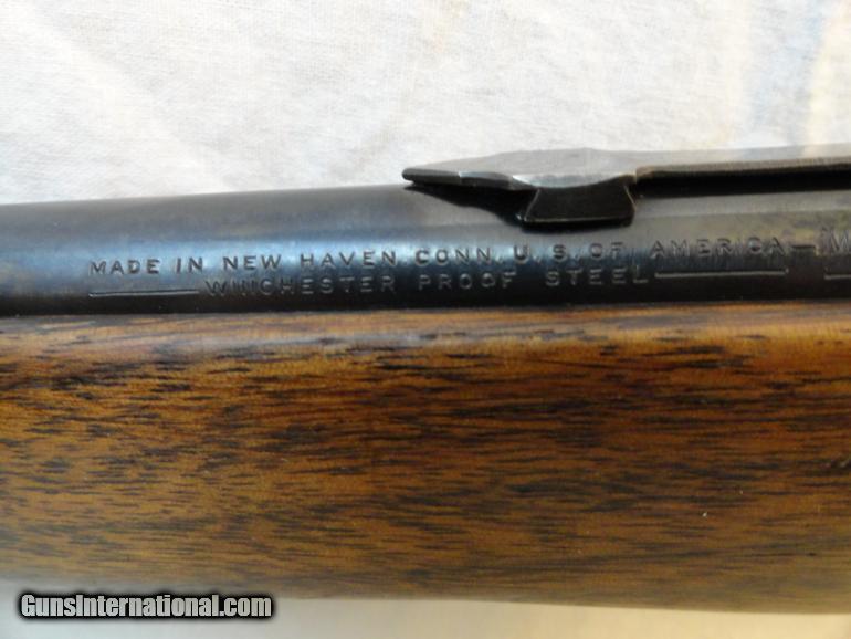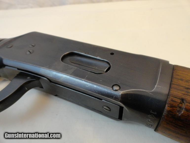 All the original factory blue on barrel and tube. Receiver and lever remain at about 99.9% with nary a rub. Wood is excellent with couple of bumps. Serrated steel butt plate is toned at top and bottom. Mint bore and action. Made during the war with distinictive flat front barrel band.