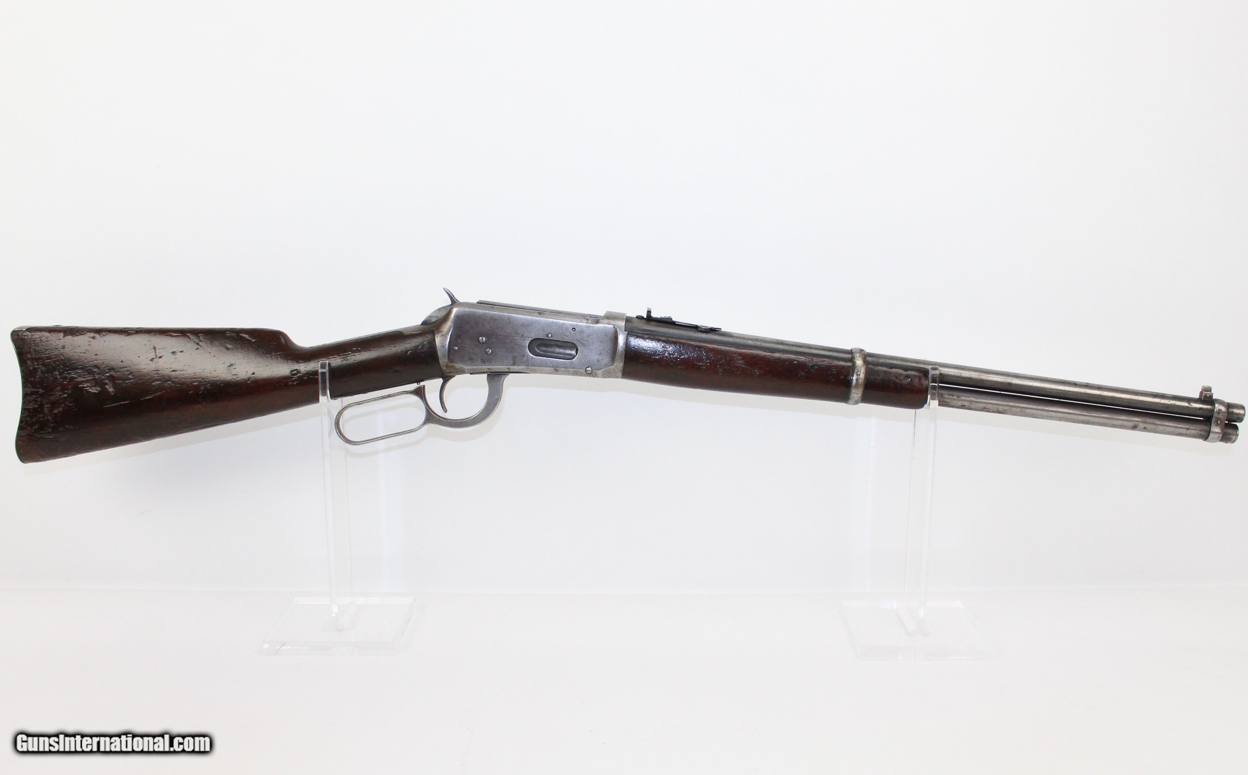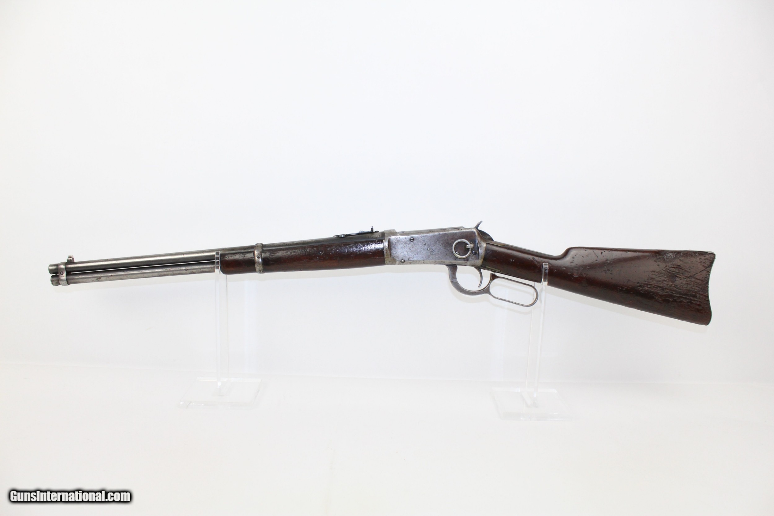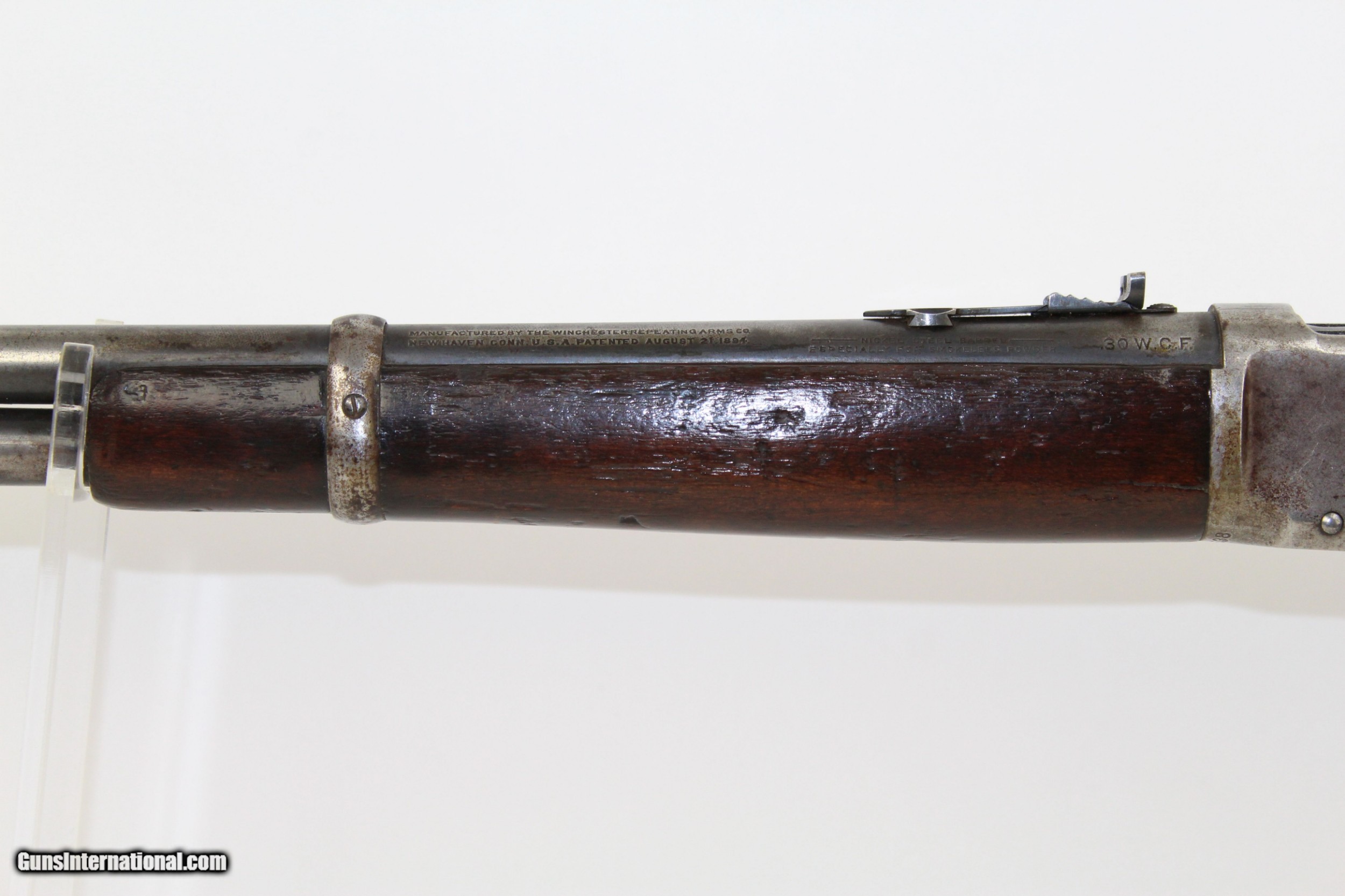 Description: Pre-64 WINCHESTER 1894 .30-30 Saddle Ring Carbine Great American Classic in .30 WCF Made in 1919! Here we present a Winchester Model 1894 Saddle Ring Carbine in .30-30, made in 1919 in New Haven, Connecticut. The credit for the design of such a prolific firearm again lies with John Moses Browning, who lent his extensive design talents to a large number of weapon types throughout his career. The Model 1894 was the first Winchester rifle made for use with the new technology of smokeless powder and was developed as a hunting rifle. Over 7.5 million were produced from 1894 until 2006. While various cartridges were supported throughout the run of the gun, the .30-30 Winchester became its staple. In practical use, the Model 1894 became a favorite for general shooters and hunters alike. To this day, it remains a deer hunting favorite, and, in all likelihood, more deer have been taken with the 1894 than any other. This Model 1894 Carbine features a saddle ring on the left side and the shorter, handier 20-inch barrel. The left side of the barrel is marked MANUFACTURED BY THE WINCHESTER REPEATING ARMS CO. NEW HAVEN CONN. U.S.A. PATENTED AUGUST 21 1894”. Breech end is marked “.30 WCF”. The receiver tang is marked “MODEL 1894/–WINCHESTER—”. Rear sight is a Marble’s. The overall condition is good. The metal surfaces bear strong traces of the original blue finish with the rest having worn off and an even gray patina pervading. The markings are clear and legible. The walnut stock looks like this rifle rode shotgun on many outings and remains solid. The bore is in great shape, clean with strong rifling. The action is excellent, strong and crisp. Here is a fantastic 100 year old example of one of America’s most beloved rifles. This firearm is classified as a Curio & Relic. Barrel is 20 inches. Caliber: .30-30 WCF Overall condition as seen in photos. Very Fast. Very Safe. FREE SHIPPING. Will need to be sent to your local FFL or C&R licensee. This firearm is classified as a Curio & Relic. Guaranteed AUTHENTIC & Includes CERTIFICATE OF AUTHENTICITY. ancestryguns $1100 #7412 SOLD Curio/Relic: Yes |