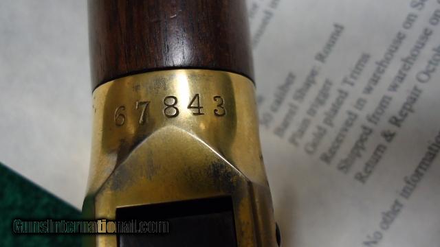 Description: Very likely a one-of-a-kind gun. I first saw this gun 40 some years ago at the Ohio Gun Collectors Show. It is the only one I have ever seen or heard of. Standard configuration. Full round bbl and full mag tube. But it has a gold gilded forend cap, receiver and buttplate. The Factory Letter verifies features. Gun has an antique serial number and is in excellent+ condition with about all vivid case colors on hammer and lever. Original sights include folding tang sight. Receiver has 97-98% heavy gold gilt finish still remaining as well as the buttplate and forend cap. Round bbl and full mag tube has 95% blue. Original plain Walnut stock is nicely figured with almost all original varnish remaining. Overall gun is guaranteed original and untouched. Very unusual to see a standard configuration with gold gilded frame. Leroy Merz Antique Firearms specializes in antique and vintage Winchesters and other fine American firearms. Since 1965 Mr. Merz has taken part in the world of firearms and has been a contributor to many well known reference books. Just recently we mailed the 123rd edition of our privately-published catalog. We have hundreds of additional guns in every price range at our home online. Search for Merz Antiques in google. SOLD Antique: Yes |