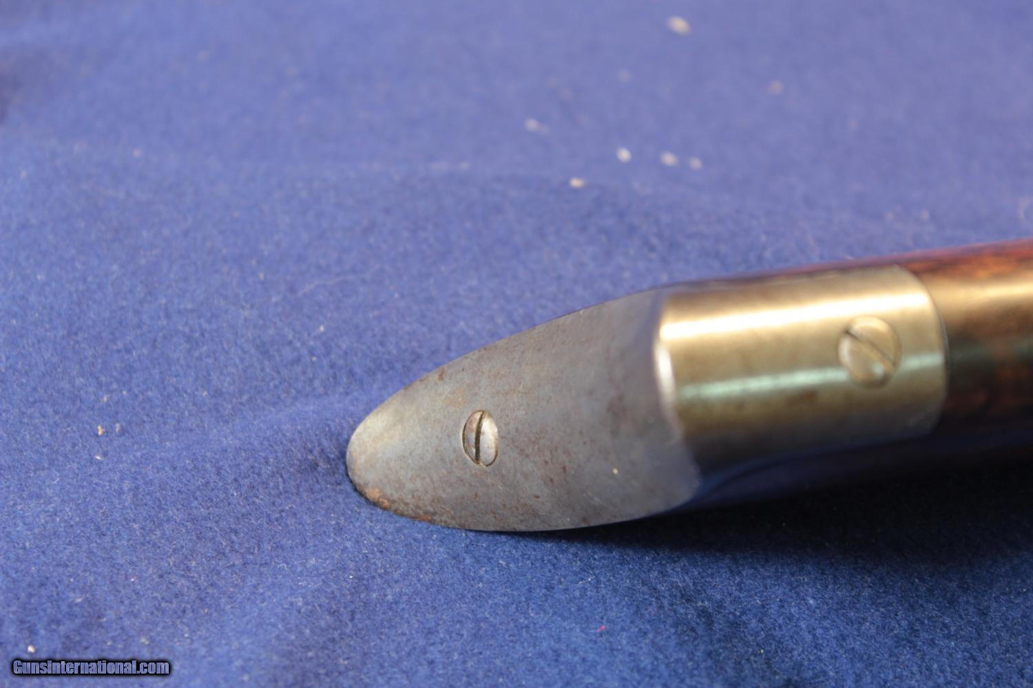 Description: Very Rare and Special Winchester 1894 Deluxe Short Rifle: Take down, Pistol Grip, Extra Lightweight round 22” barrel, 30 WCF cal. Factory original Lyman tang sight and front sight. 70-75% original receiver blue with blue loss in the primary wear/carry locations. Barrel blue 90-95%. Beautifully grained wood, the finish is 60-65% with areas of vanish flaked away normal scratches and dings. Checkering is in very good condition. Pistol grip cap is original and excellent. Faded case colors on the hammer lever and butt plate. Bore is very good to excellent. Gun matches Cody letter to a T. 131,xxx serial number S/N applied 11/09/1901, Received in warehouse 12/16/2901 & Shipped 12/17/1901 A very nice Christmas present for someone that year? SOLD Curio/Relic: Yes |