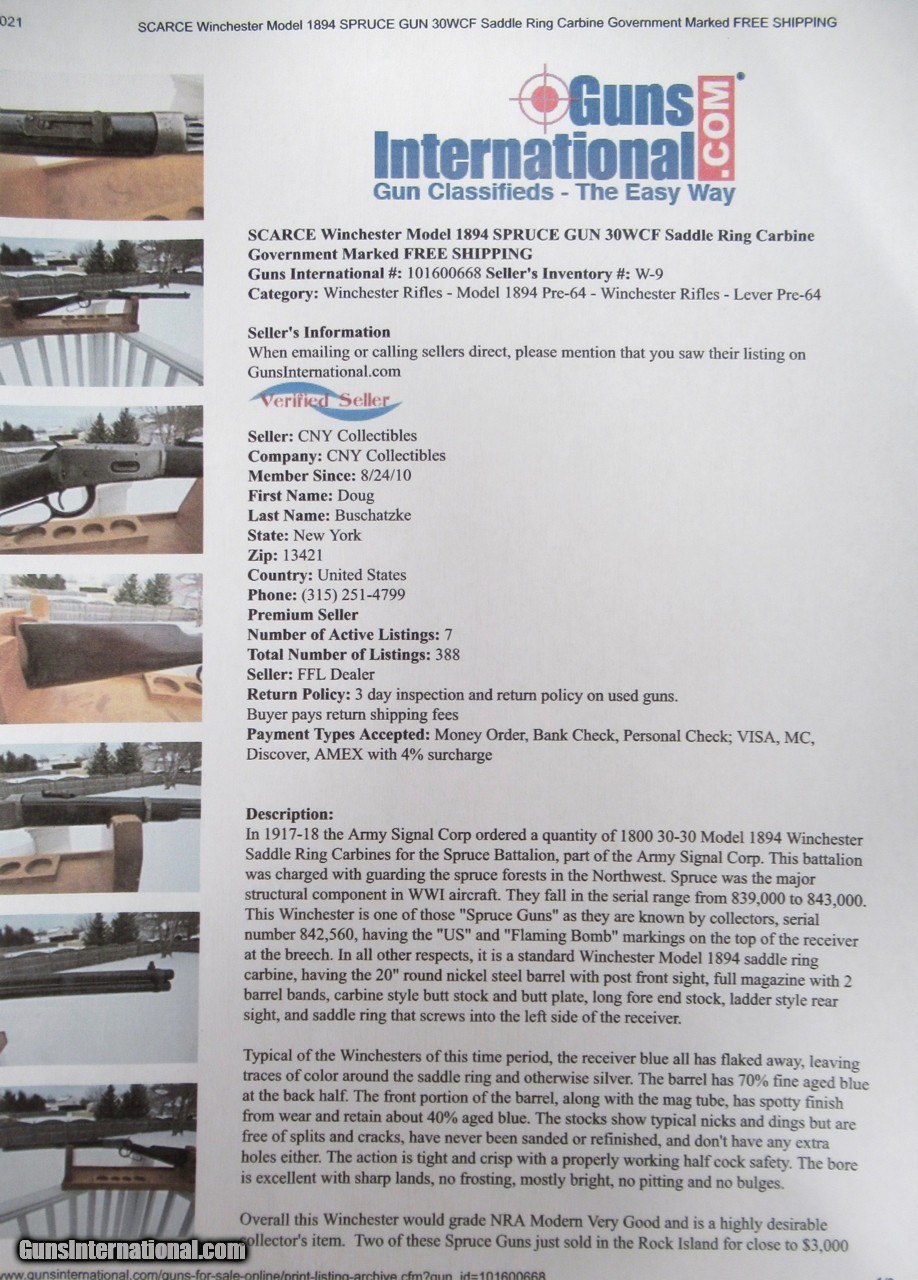 Description: Winchester Model 1894 Saddle Ring Carbine; Serial No. 842560; Made in 1919 for U.S. Government; See Page on Spruce Carbine; Original Blue o Barrel and Magazine Tube; Original Varnish on Wood; Frame Mostly Silvered with Light Ring Shadow; Perfect Action and Bore; See All Photos for Condition; No Texts; Call (254)541-5765 or Email Only; PERSONAL PROPERTY of Harold Wieser; Price: $3,475 + $75 S&H Via USPS PRIORITY MAIL; Payment Address: Harold Wieser - 1466 U.S. Hwy 77 - Rosebud, TX 76570; SEND PAYMENTS VIA USPS PRIORITY MAIL; BEWARE of SCAMS!!! – DO NOT SEND MONEY or CORRESPONDENTS ELECTRONICALLY UNLESS YOU HAVE SPOKEN to HAROLD WIESER FIRST! 254-541-5765 SOLD Manufacturer: Winchester Model: 1894 Serial Number: 842560 |