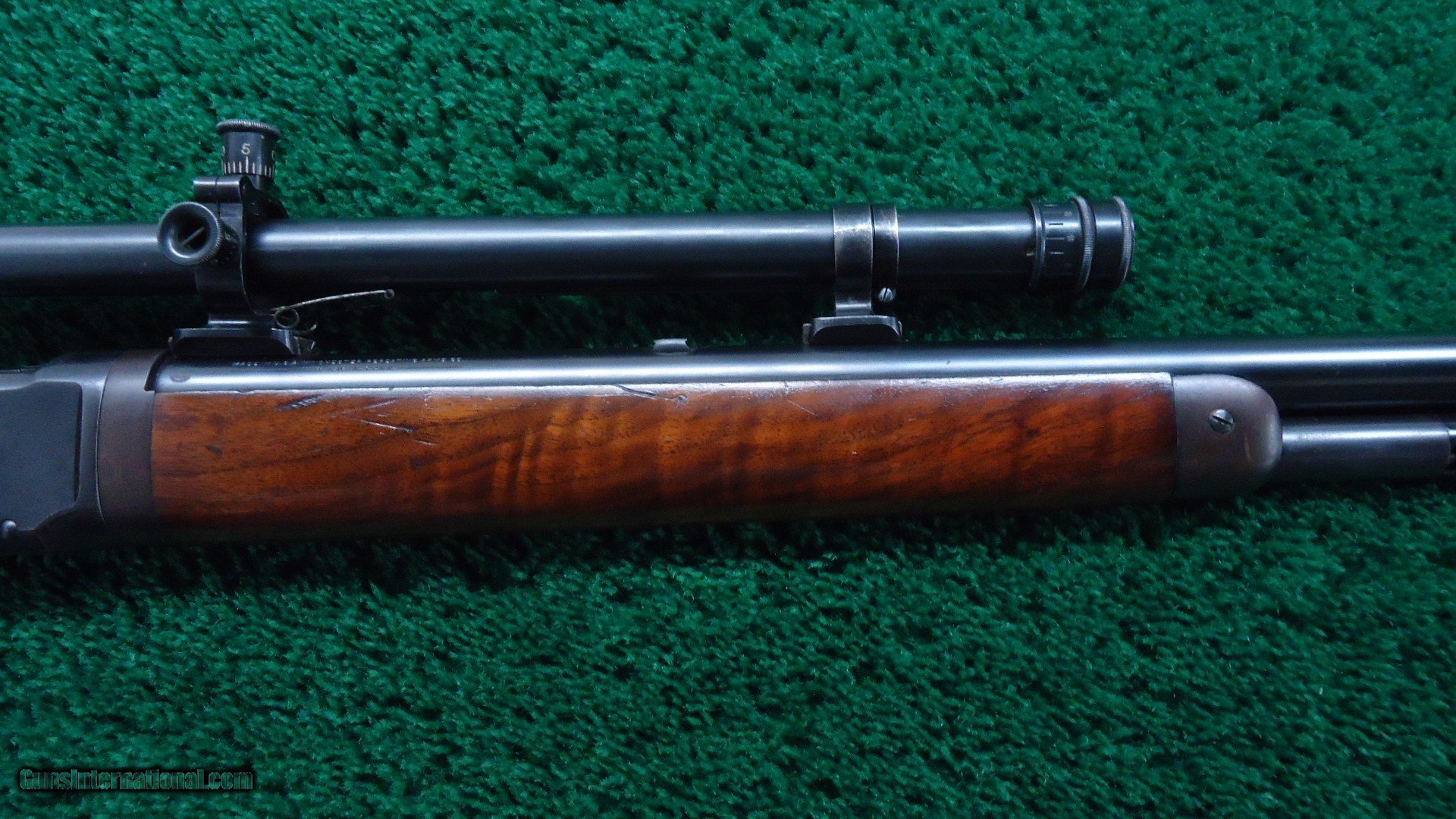 Description: 26 inch round barrel chambered in 30 WCF caliber with a half length magazine. Excellent bright shiny bore. Marble No. 2 brass beaded front sight and a Marble blank in the rear as well as a Lyman folding tang. This one was made specifically for the Winchester A5 scope with the barrel markings moved to the left side. The WP marking is moved to the right side. This leaves an area for the scope mounts. Lyman 5A Scope optics are typical for the period being not that good. Gun is in very good condition with most all of the blue remaining. The forend cap and takedown ring have flaked and turned a plum/brown color. Extra figure walnut stock is in very good condition with a good amount of finish remaining. A fine looking Winchester. Leroy Merz Antique Firearms specializes in antique and vintage Winchesters and other fine American firearms. Since 1965 Mr. Merz has taken part in the world of firearms and has been a contributor to many well known reference books. We have hundreds of additional guns in every price range at our home online. Search for Merz Antiques in google. SOLD Curio/Relic: Yes Rifle Caliber: .30-30 Winchester |