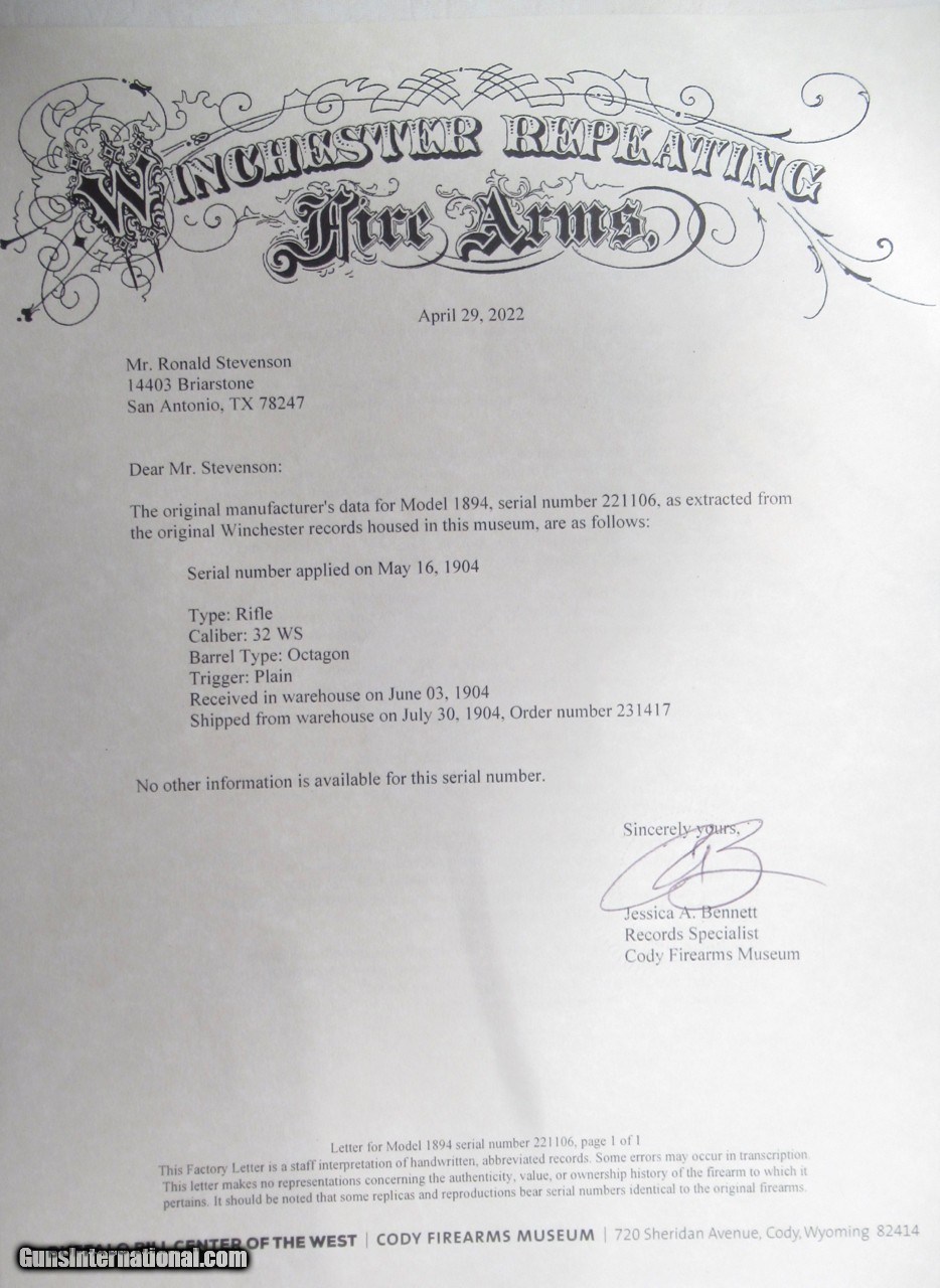Description: Winchester Model 1894 Lever-Action Rifle; Serial No. 221106; Per Included Factory Letter: Rifle; .32 WS (.32 Special) Caliber with Plain Trigger and Octagon Barrel (26”); Shipped July 30, 1904; 100% Original Including 32 Special Front Sight; Most of the Original Metal and Wood Finish Intact; Perfect Action and Bore; Rifle Surfaced in San Antonio, Texas in 2022; Really Fine 100% Original 120 Year-Old Model 94 Winchester; See All Photos for Condition; No Texts; Call (254)541-5765 or Email Only; PERSONAL PROPERTY of Harold Wieser; NOTICE: We Do Not Do Any Consignments - All Items Listed are Owned by Us - NO SALES to New Jersey or New York City - Antiques Only to Massachusetts and California; Price: $2,975 + $75 S&H Via USPS PRIORITY MAIL; Payment Address: Harold Wieser - 1466 U.S. Hwy 77 - Rosebud, TX 76570; SEND PAYMENTS VIA USPS PRIORITY MAIL; BEWARE of SCAMS!!! – DO NOT SEND MONEY or CORRESPONDENTS ELECTRONICALLY UNLESS YOU HAVE SPOKEN to HAROLD WIESER FIRST! 254-541-5765 SOLD Manufacturer: Winchester Model: 1894 Serial Number: 221106 |