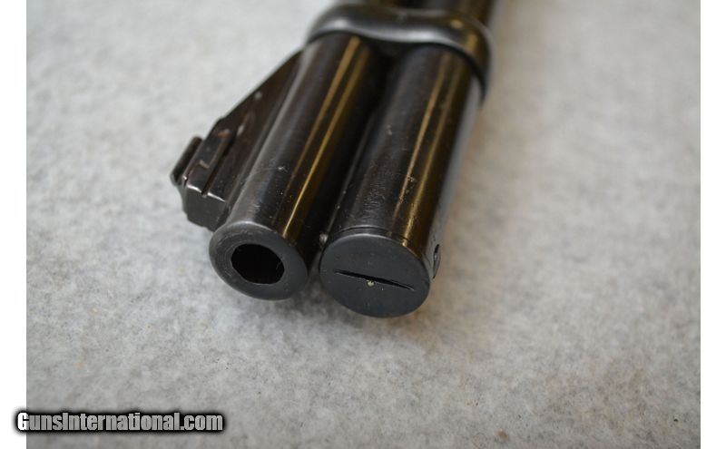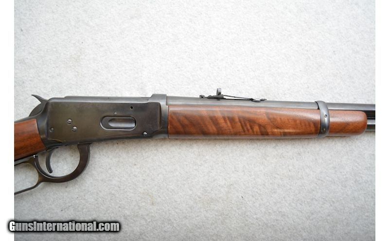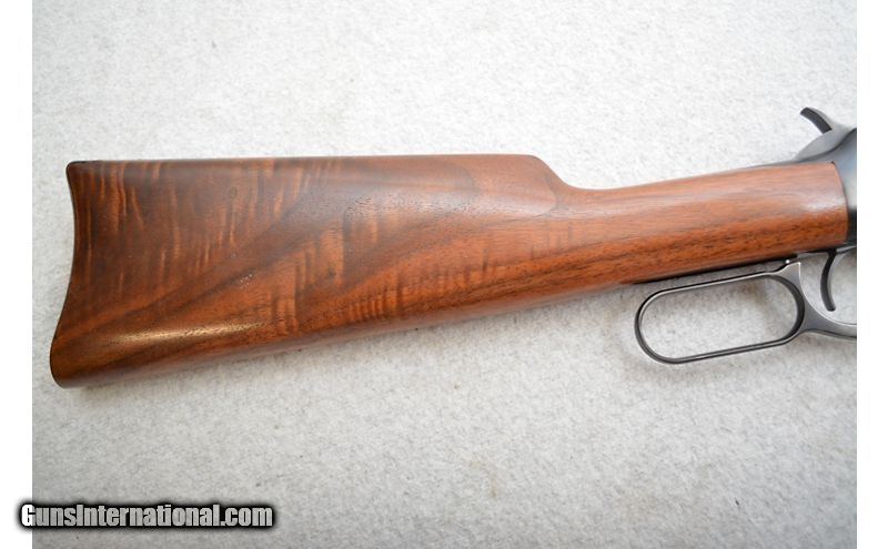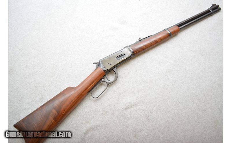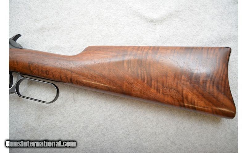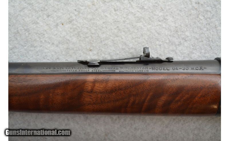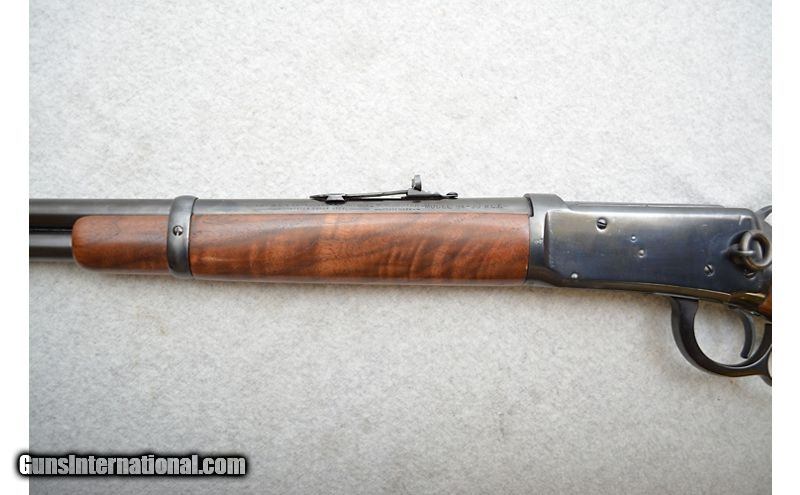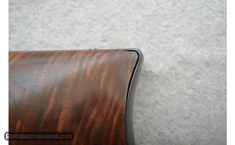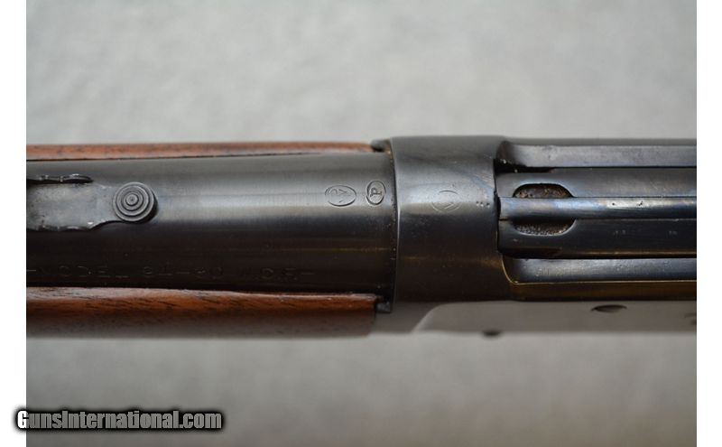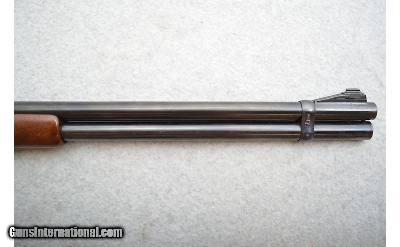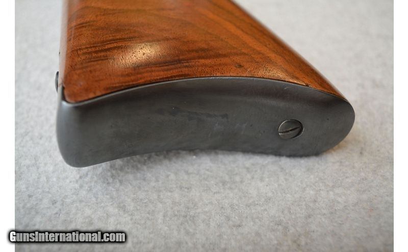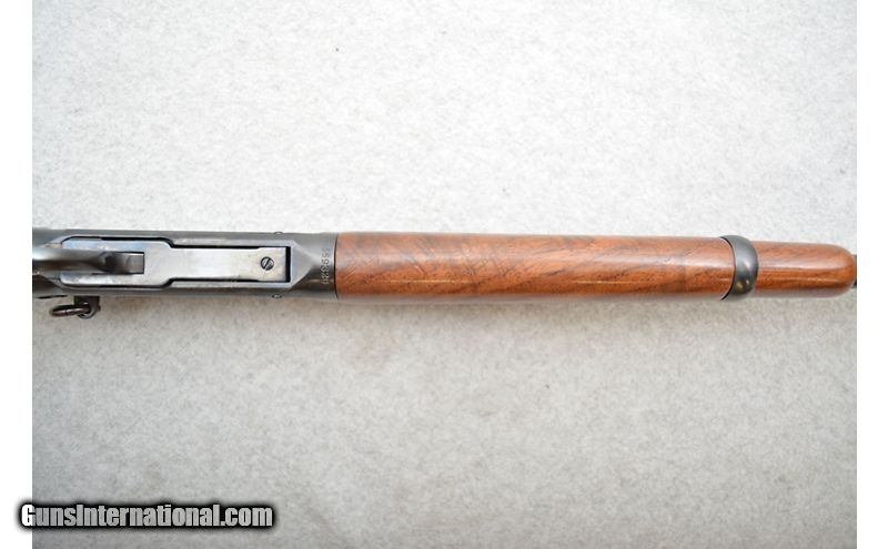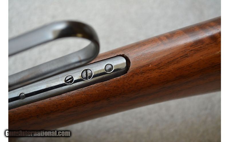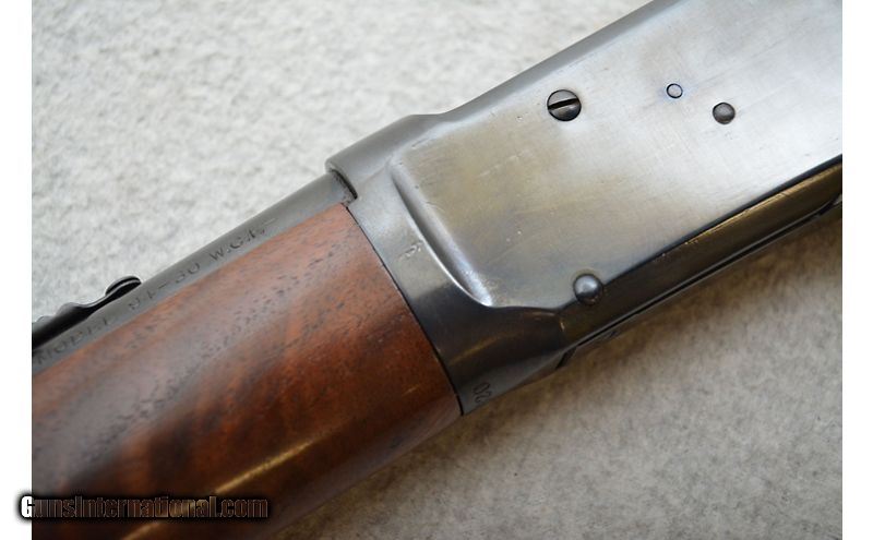 Description: Solidly shooter grade condition. The metal has been reblued at least once; for sure. The evidence being pretty evident in the blued pitting where rust used to be, softened edges on the receiver, and thinned markings. The proof marks on the receiver are nearly gone and the one on the barrel is badly faded. The area of the lever around the trigger looks to have the start of rust again; but this might be halted with some surface oil and care. The stock has been refinished and in several areas doesn't meet flush with the metal. The refinish job on the stock-while clearly not done by an expert-is better than some that may be found. Sources indicate this example was built in 1912. .30 WCF SOLD Chambers: Lever action fed from a tubular magazine. Metal Condition: Fair. Wood Condition: Fair. Bore Condition: Excellent. Barrels: 20" Round blued. Triggers: Blued metal with smooth face. Stock Dimensions: Hardwood with 13¼" LOP. Fore End: Hardwood. Butt Pad: Blued metal plate. Weight: 6lbs 8oz Sights: Front bead and Marble's adjustable rear leaf. Chokes: N/A Item Location: Green Bay |