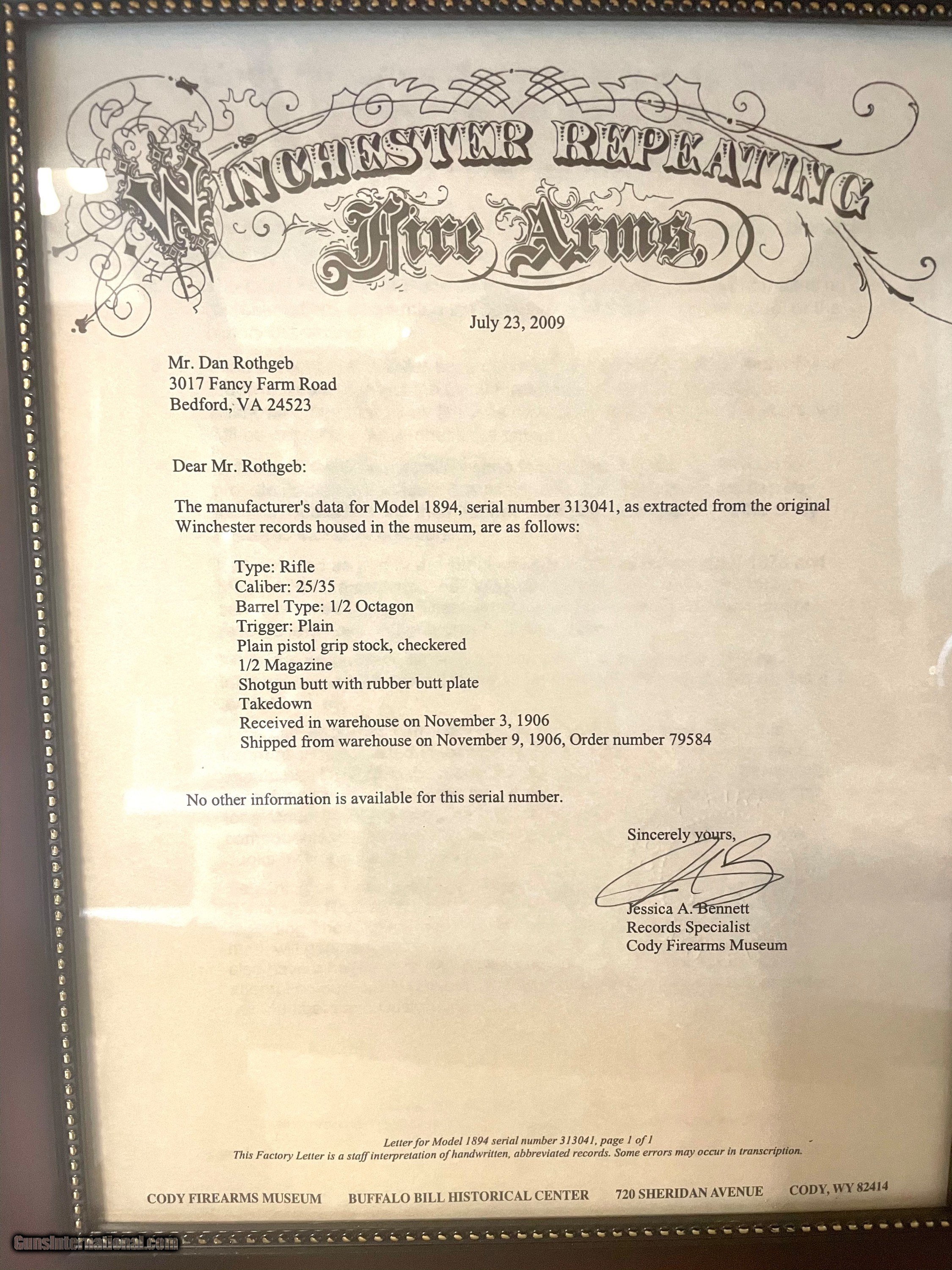 Description: For sale I have another one of my late fathers guns, and this one was one of his favorites by far. It's a little deluxe takedown 1894 rifle with a half round half octagon barrel chambered in the illusive 25-35 cal. It has a shotgun butt with a rubber butt plate and checkered wood. It has a 2 leaf express sight on the barrel with a flip up tang sight on the rear. It has what appears to be an Ivory front sight blade. This little gun comes with a Cody letter and is in very nice original condition. SOLD Rifle Caliber: .25-35 Winchester Manufacturer: Winchester Model: 1894 Barrel Length: 25 1/2” Condition: Excellent Metal Condition: Excellent Wood Condition: Excellent Bore Condition: Excellent with strong rifling |