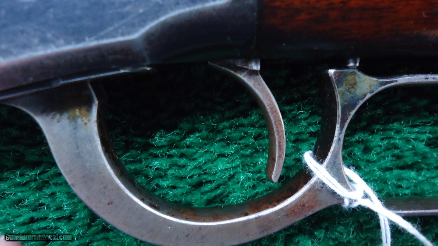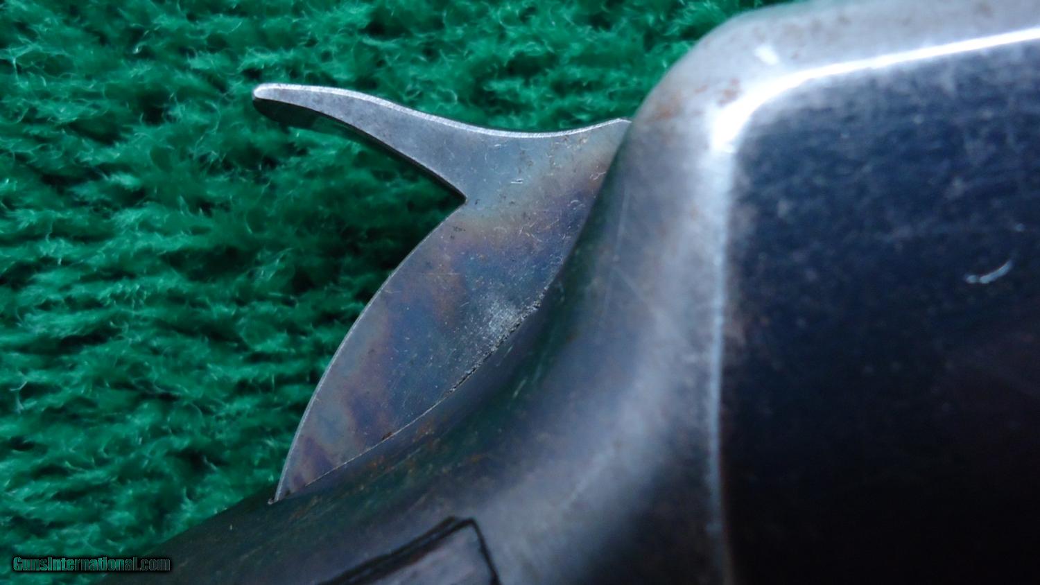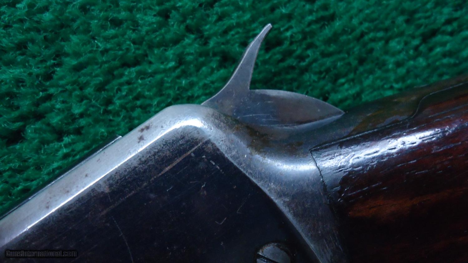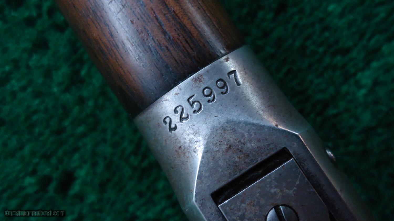 Description: 38-55 caliber 26 inch round barrel full magazine rifle with crescent butt plate. Traces of case color remain on the lever and hammer. Most original blue on the mag tube with thinning blue on the barrel. VG Bore has strong rifling with shine that could clean up even better. Receiver has 50% blue with the rest turning plum. Still some blue on the forend cap too. Wood fits good with no cracks or chips. It has had a coat of something shiny applied sometime ago, most has rubbed off of the forearm. Nice action. This is a good honest rifle that has been used and taken care of. Made in 1901. Leroy Merz Antique Firearms specializes in antique and vintage Winchesters and other fine American firearms. Since 1965 Mr. Merz has taken part in the world of firearms and has been a contributor to many well known reference books. Just recently we mailed the 126th edition of our privately-published catalog. We have hundreds of additional guns in every price range at our home online. Search for Merz Antiques in google. SOLD Curio/Relic: Yes |