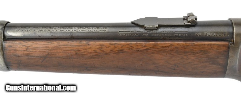 Winchester 1894 .25-35 WCF caliber carbine. Made in 1921. .25-30 Caliber with a 20” barrel. Barrel has most of the original blue that is toning into a patina. Frame is mostly gray to light brown patina. Wood shows normal use and shrinkage. There is a piece of wood cut out from under the barrel band, we are assuming for attaching a sling. Strong bore and no visible pitting.