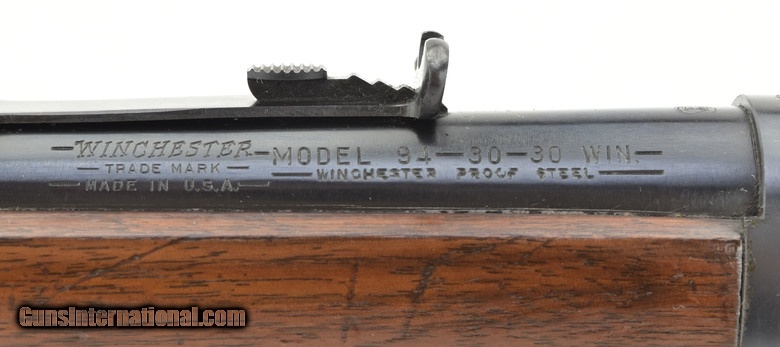 Description: Winchester 94 .30-30 Win caliber rifle. Pre-64 model made in 1963. The wood has been glossed up with some varnish, the metal is excellent.