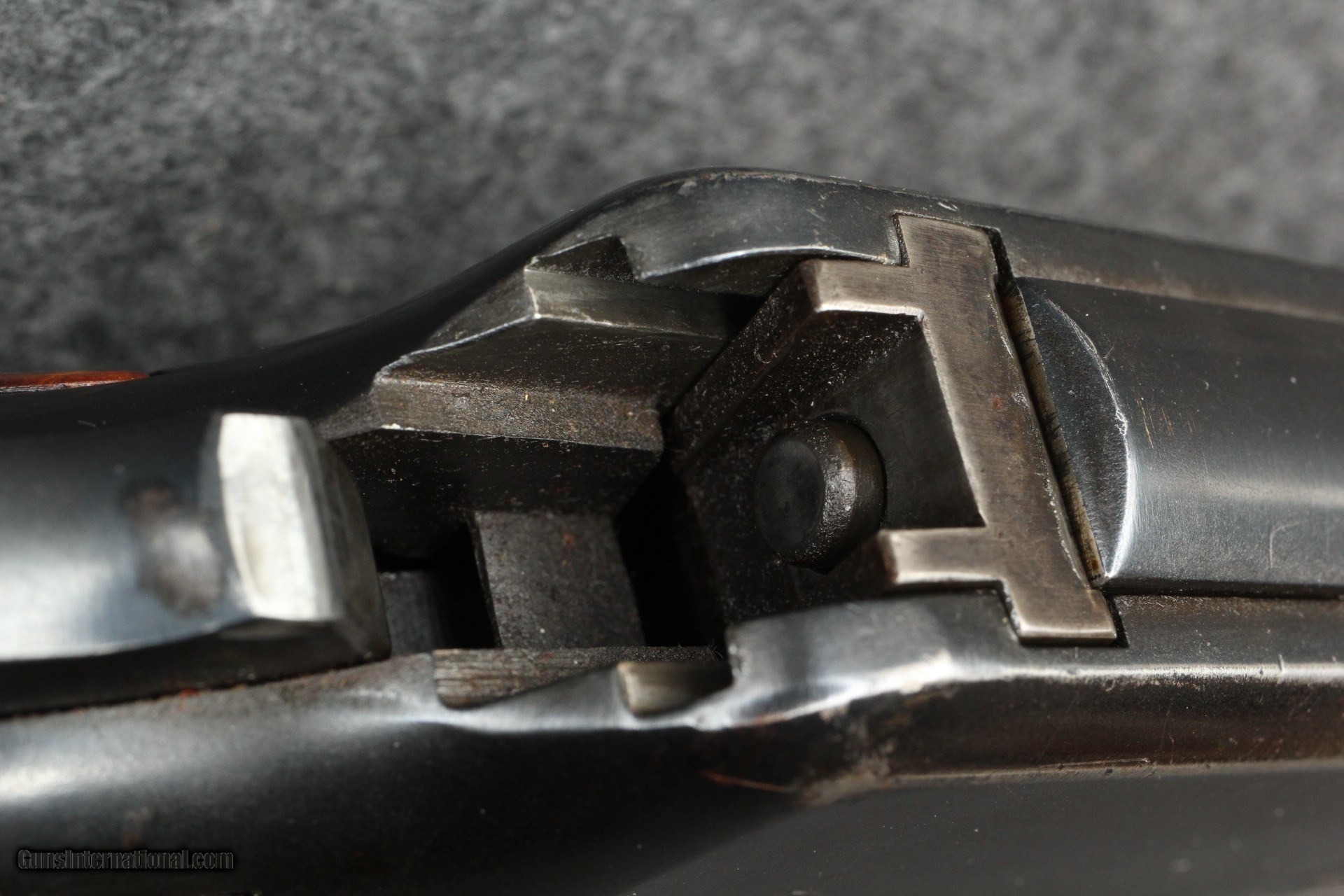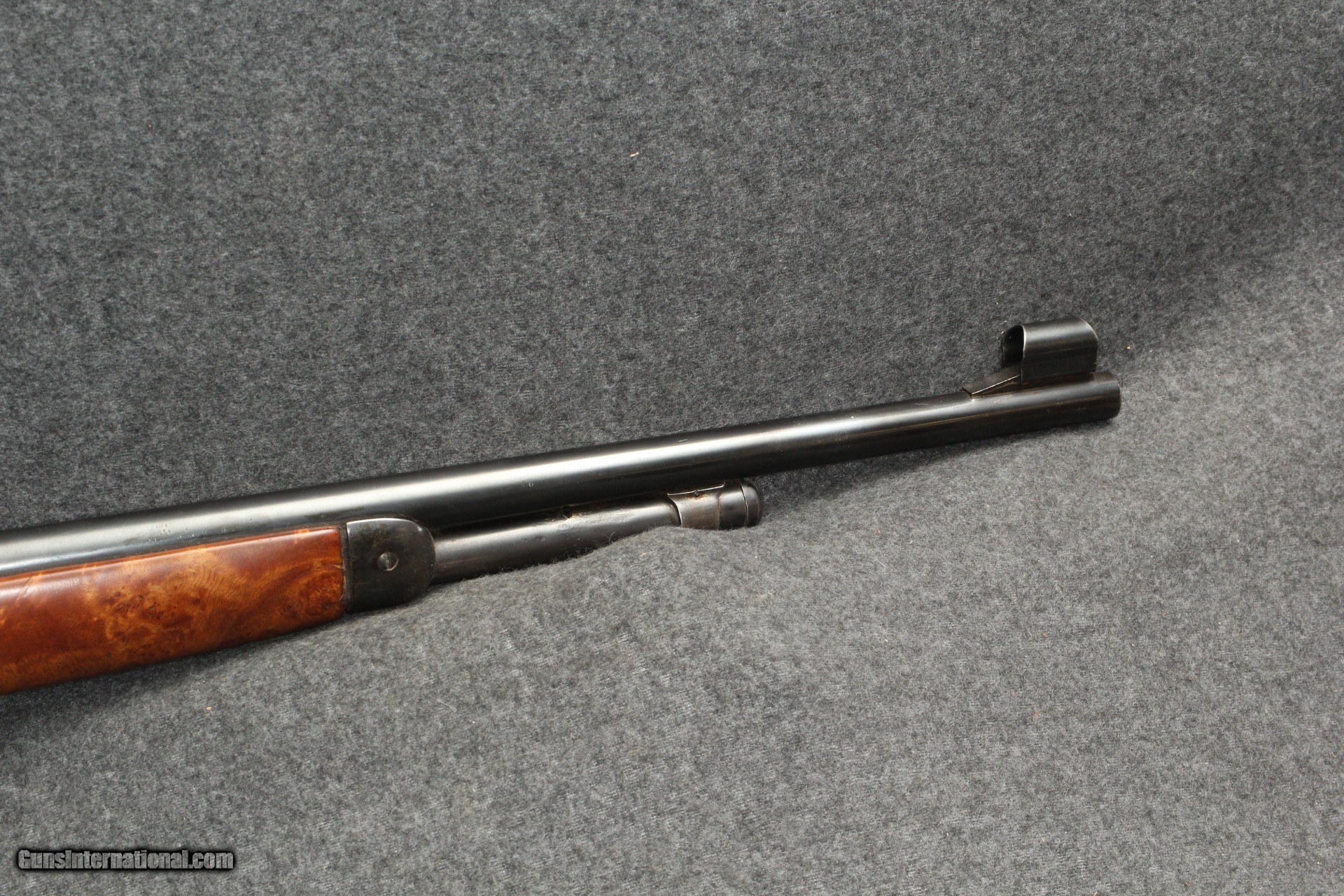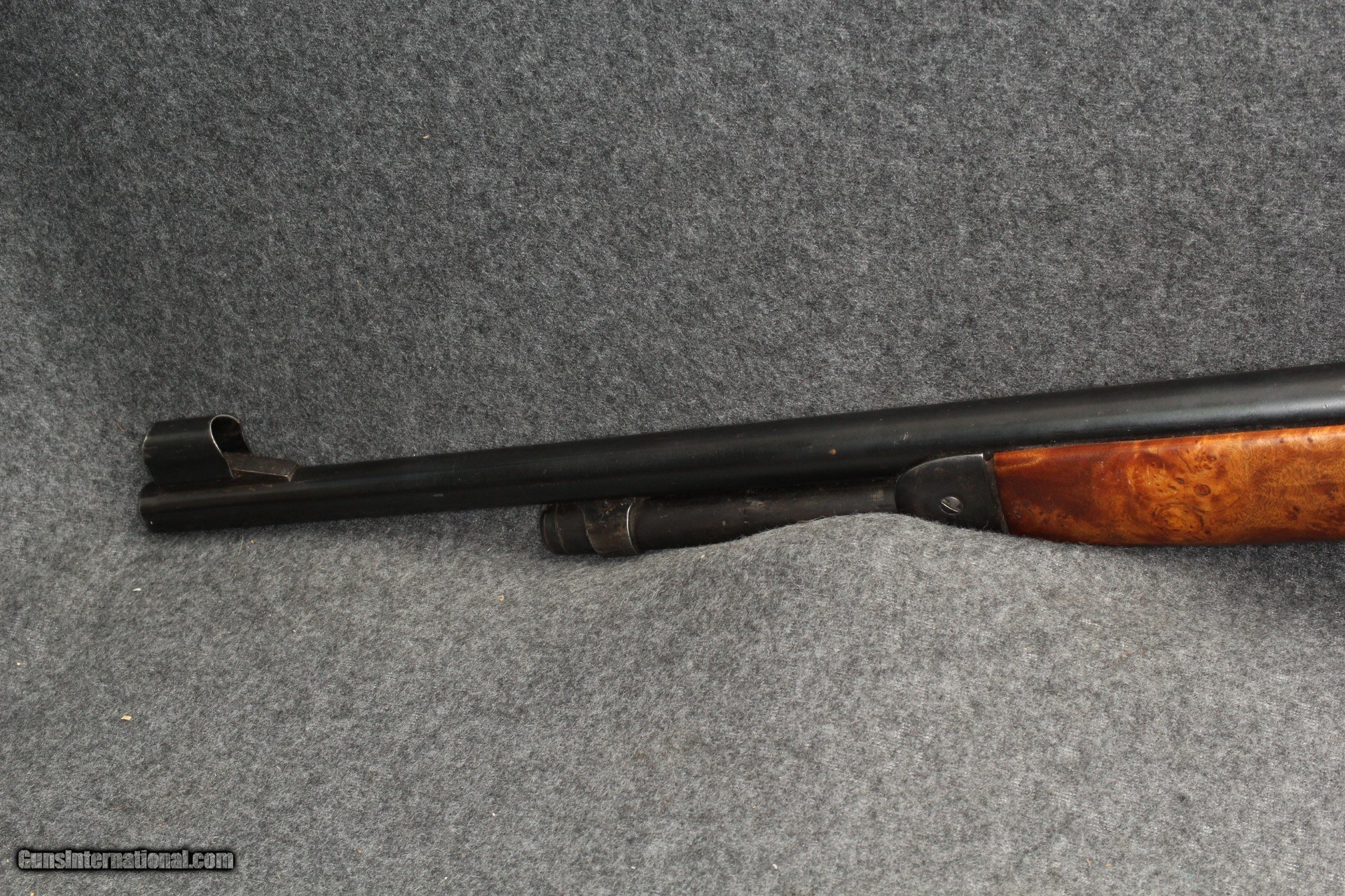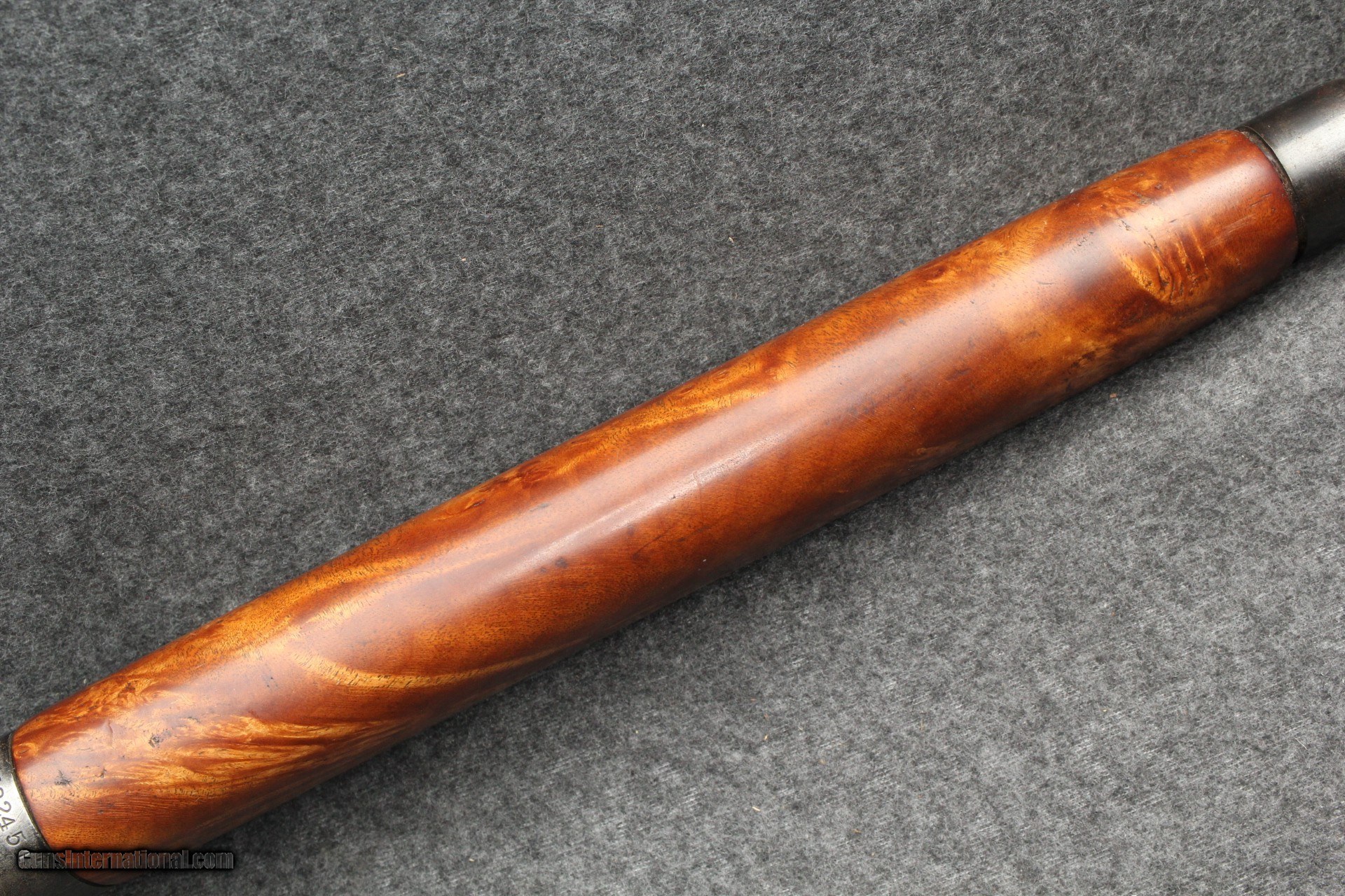 Description: Serial number 582XXX. Mfg 1911. 20" barrel from a Winchester 64. Non-original wood. Wood is burl maple, non checkered. Metal has been reblued. Action shows light marring under old reblue, retains 70% reblue. Right side of action shows forging striations. Magazine tube has half round cut 2" back from dovetail. Barrel has half round cut 2" back from muzzle. King rear sight. Original correct front sight ramp and hood. Bore is excellent. Will ship to C&R. Please add $55.00 for shipping and insurance. SOLD Curio/Relic: Yes Rifle Caliber: .30-30 Winchester |