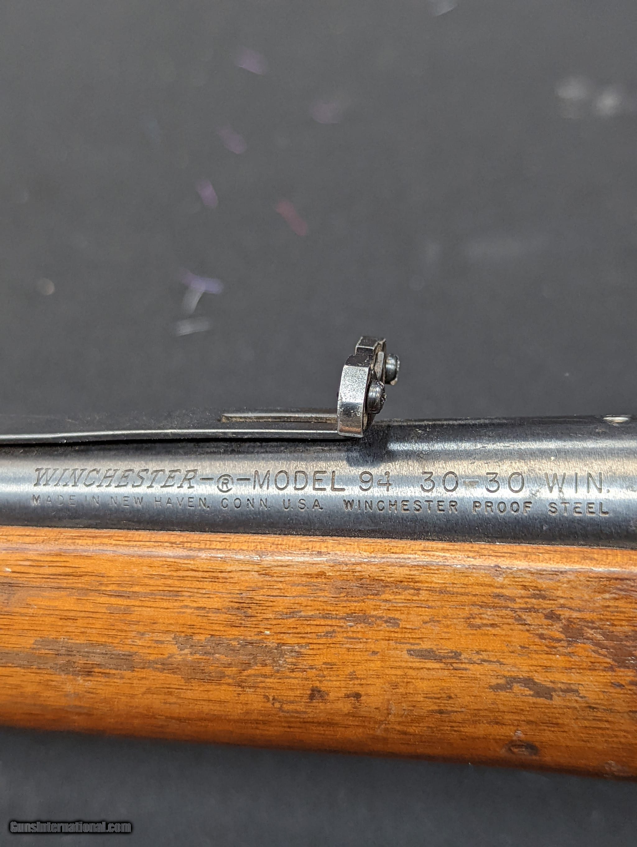 Description: Guns Listing ID: 563539 Beautiful vintage blued steel lever action rifle from Winchester. 7 round capacity firing 30-30 Winchester cartridges (30 WCF). 8/10 condition as it does show a bit of wear(pictured). Has a nice suede leather strap. (A11001374) SOLD Manufacturer: WINCHESTER Model: 94 Caliber Info: .30-30 WIN Condition: Used - Non-Certified Barrels: 20 BARREL Finish: BLUED |