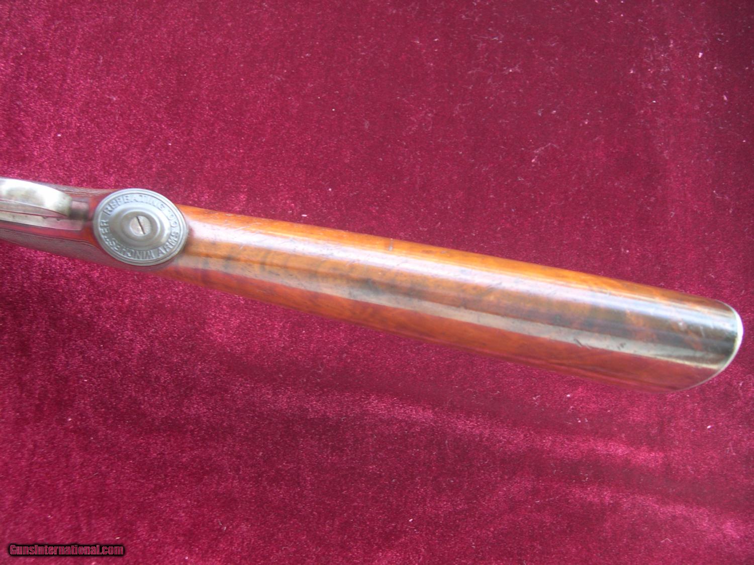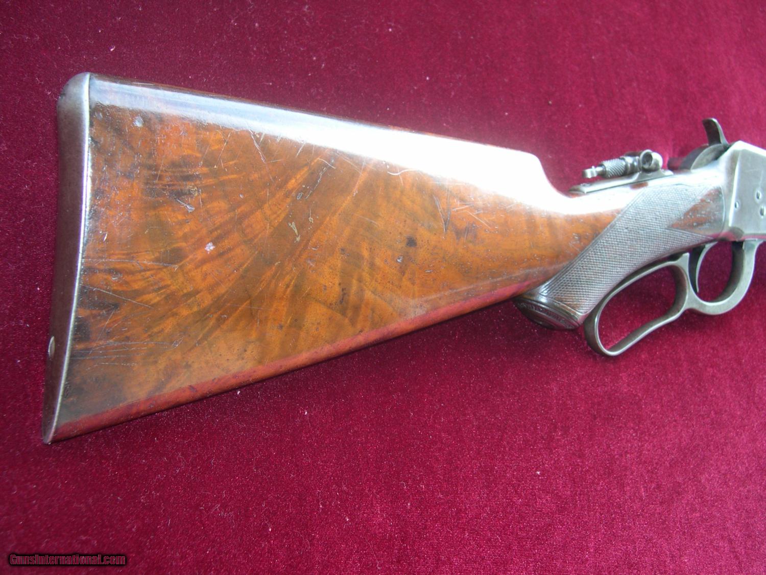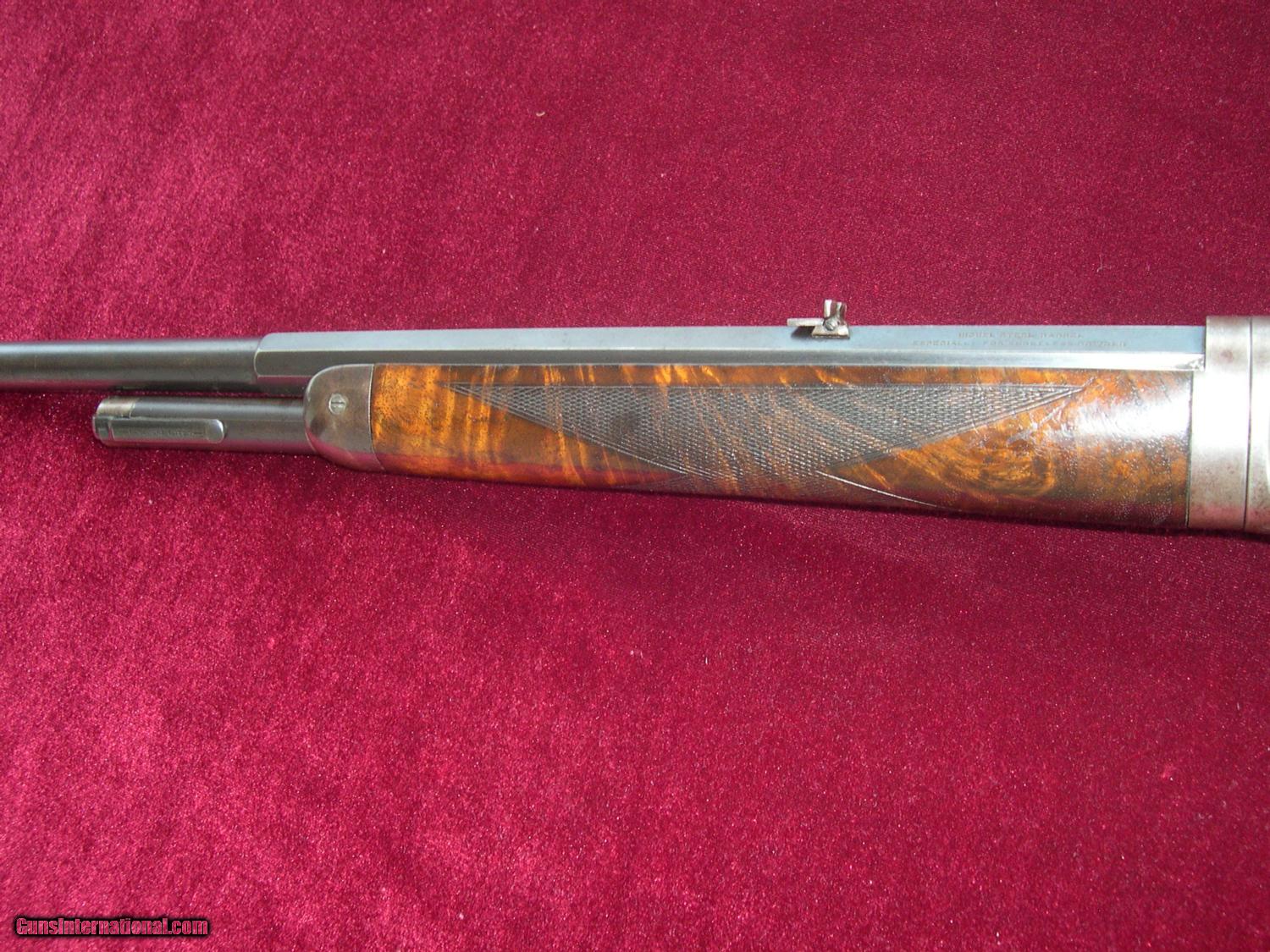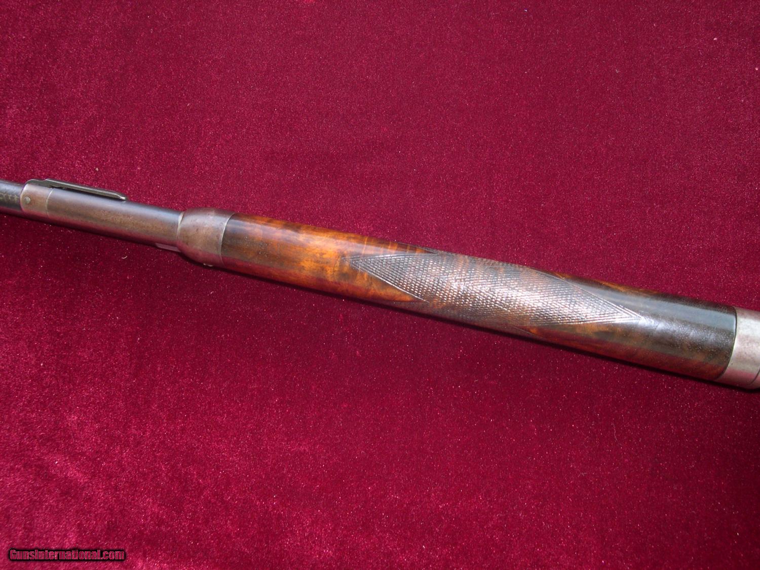Description: For sale is a Winchester Model 1894 Deluxe Take Down Rifle. It has a blued finish and features a 22-inch 1/2 octagon, 1/2 round extra light "rapid taper" barrel that is chambered in 30WCF and has a 1/2 magazine. The sights are Lyman both front & rear. The pistol grip walnut stocks are checkered and feature a shotgun butt. It also has a take down action with a plain type trigger. The bluing on the receiver is subdued and is darker on the barrel. The stocks show a nice grain and have clean checkering. Some handling marks are present but there are no breaks, cracks or deep scratches. The rifling in the barrel is in excellent condition showing a bright bore with no corrosion. SOLD Antique: Yes |