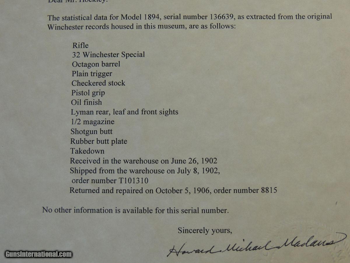 Description: WINCHESTER DELUXE MODEL 1894 32 WINCHESTER SPECIAL, 22" OCTAGON BARREL WITH GOOD BORE, TAKEDOWN, FACTORY LETTER, ALL ORIGINAL, EXCELLENT CONDITION CURIO & RELIC $9999 ******* (PLEASE REFERENCE OUR INVENTORY NUMBER) (PAYMENT OPTIONS) (Postal Money Order) (Cashiers Checks) (Personal Checks (Item held until Check Cleared) (Layaway 120 days same as cash - Deposit required- Our Terms and Conditions Apply) (Credit Cards Visa or Master Card 4% fee added to total sale) (GA residents 7% sales Tax Applies) (FAX 888-597-1394) (BEST PHONE/TEXT 229-424-8450) (Shipping $35.00) SOLD |