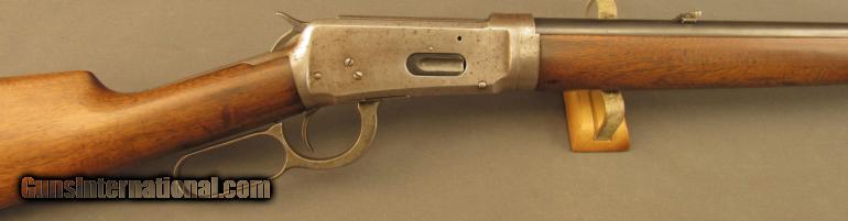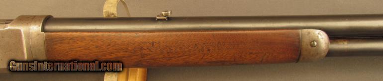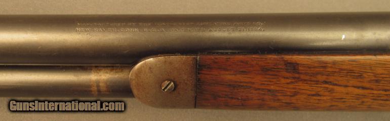 Description: S# 600798; .30 WCF (30-30), 22 inch barrel, good bore with evenly worn rifling. This special order rifle features a takedown frame with 22 inch round barrel, short 8 3/8 inch forend, rear slot 4" from receiver, case colored hammer and lever, nickel steel barrel and early long tang buttplate. Rifle is built on a second type receiver with second style "Tombstone" hammer and third style tang marking with "Trade Mark Reg. in U.S. Pat. Off." Rifle remains in very good condition with receiver flaked clean with some brown staining. Hammer and lever show strong traces of case colors. Barrel and mag tube retain perhaps 80% original blue, buttplate is bright with evidence of cleaned oxidation and a little light pitting. Stocks show wear with a little oil added long ago, forend has a repaired crack in bottom and a short (1 inch long) crack on left side by receiver. Barrel is importer marked on left side by forend cap. The takedown flange shows three dimples from tightening screws, takedown is slightly loose. This is a very desirable 1912 built rifle with short wood forend that will add to any fine Winchester Collection. FFL or C&R SOLD Curio/Relic: Yes Manufacturer: Winchester Model: 1894 Serial Number: 600798 Caliber Info: .30-30 Gauge Info: .30-30 |