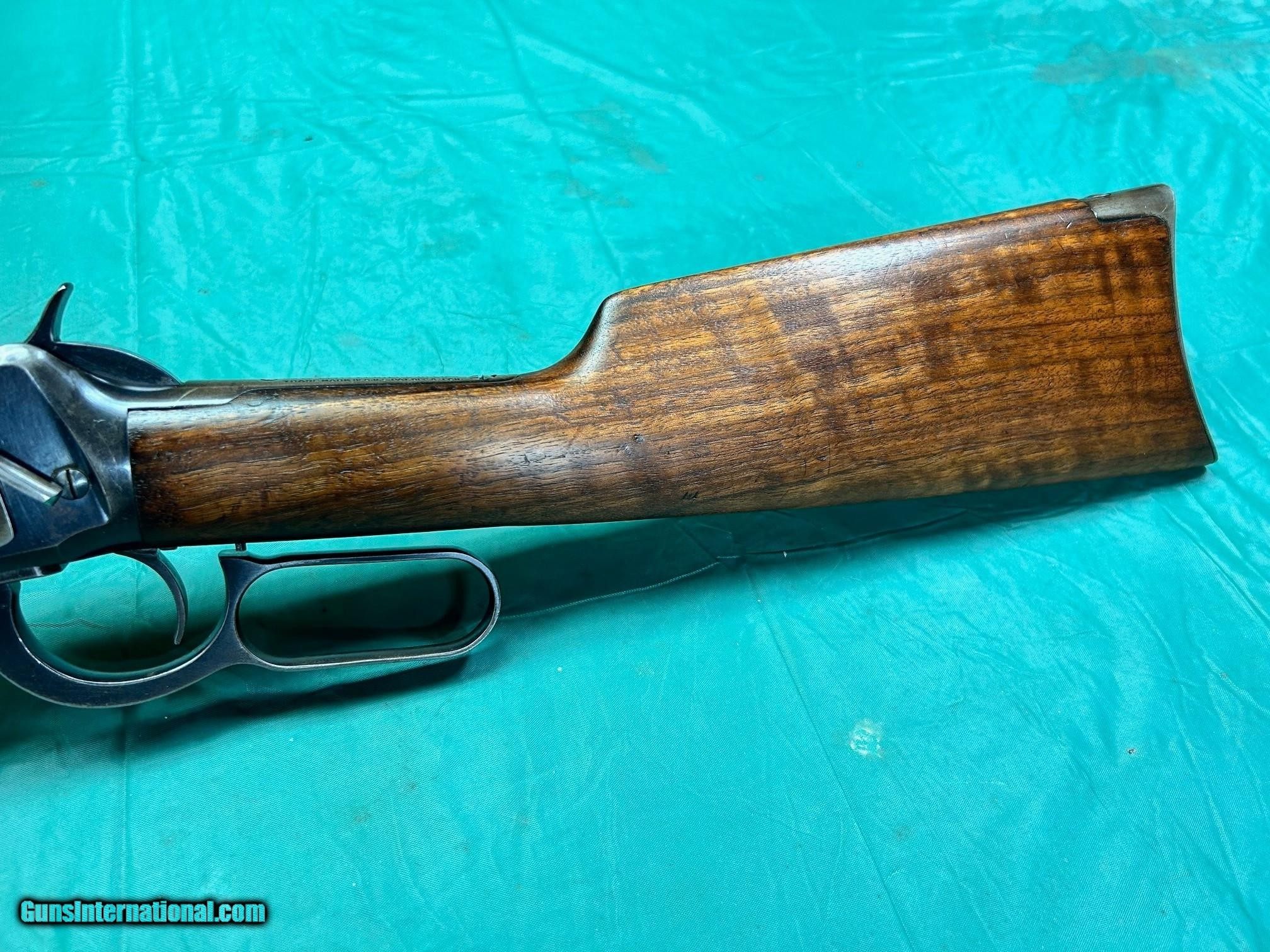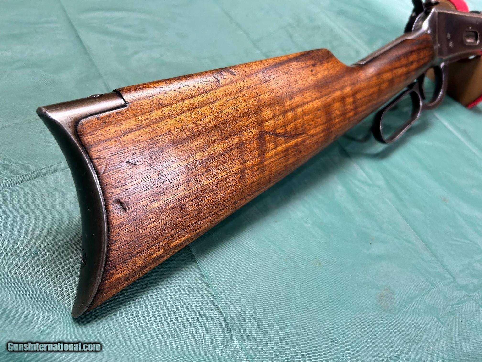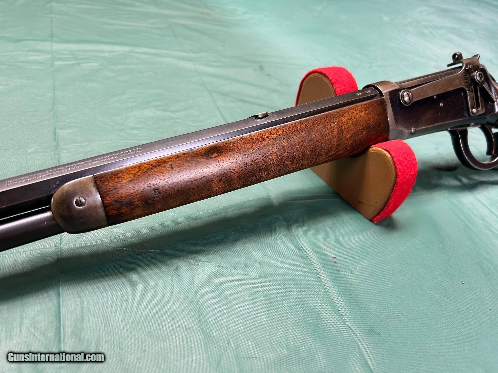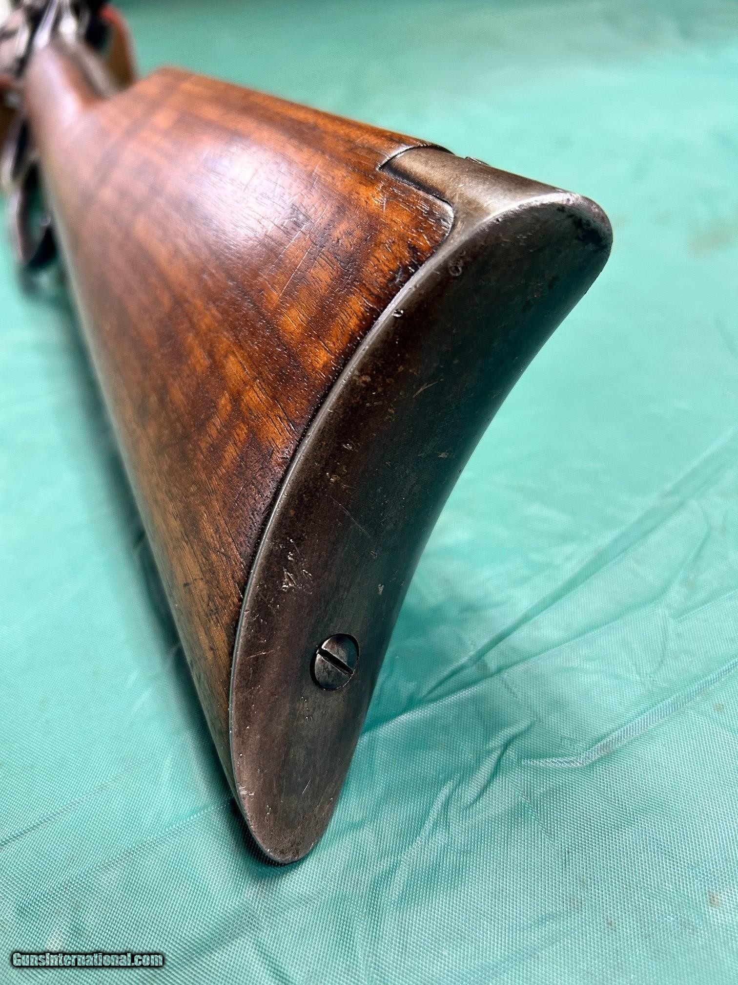 Description: SOLD. Special order short rifle in 38-55, 22" Oct BBL that retains very strong original blue and a bright shinny bore. Sites include Lyman front and blank rear with Lyman 21 receiver sight - "Climbing Lyman" This rifle is correct short riffle with 8 3/8 in forearm 1" - shorter than standard. A nice special order rifle in a great caliber. MFG in 1920 - Note the butt stock is refinished in my opinion and the forearm is correct. Price below plus $75.00 Shipping and Handling Click to see all Fitzgerald's Fine Guns SOLD Curio/Relic: Yes Serial Number: 878792 Manufacture Date: 1920 |