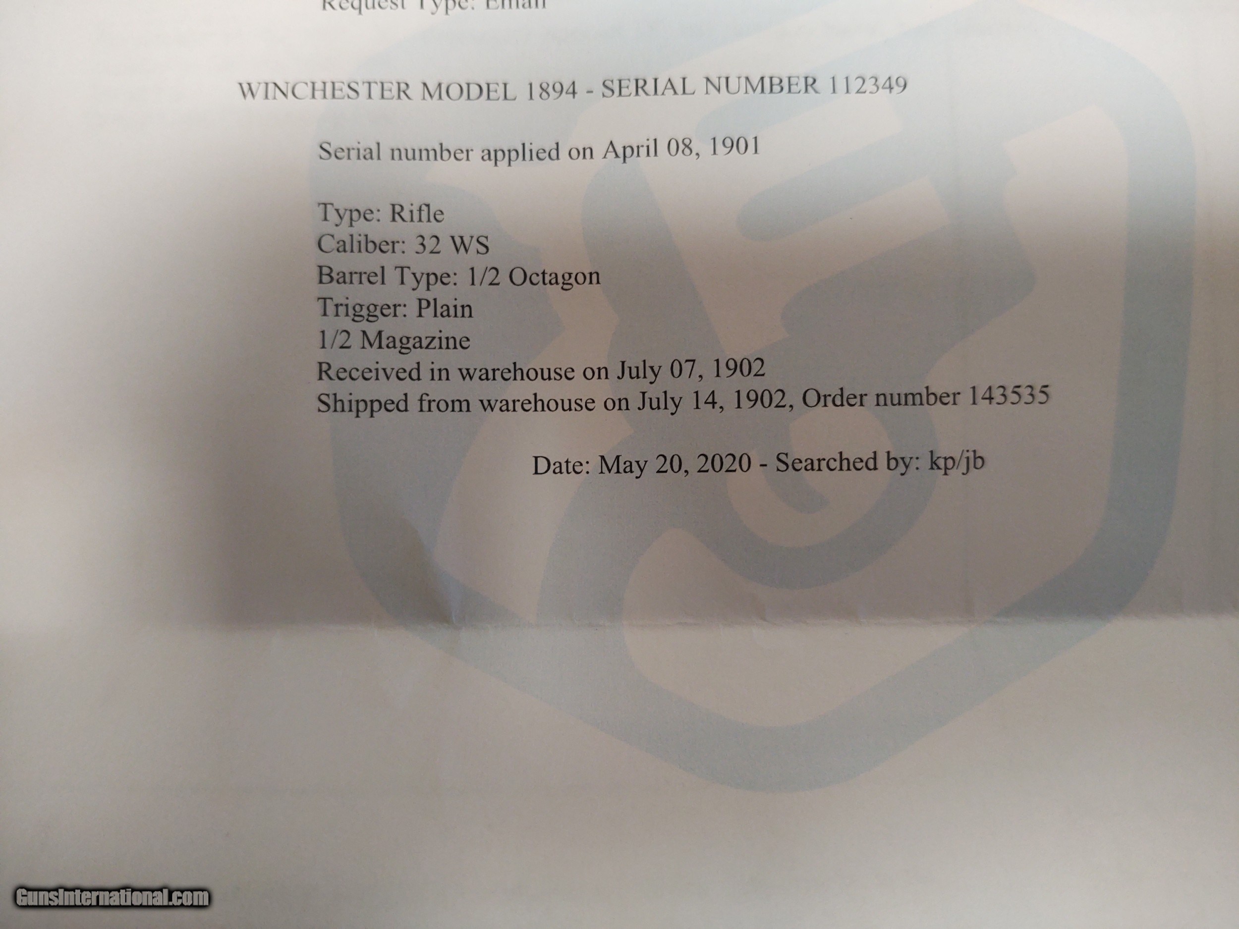 Description: For sale, Winchester Model 1894 32 W.S. 26" Half Oct, Half round barrel. Button magazine Serial number 112XXX made in 1901 Comes with a Cody Firearms call sheet to verify configuration. More pictures available 4068501246 $900 SOLD Curio/Relic: Yes Rifle Caliber: .32 Winchester Special Manufacturer: Winchester Model: 1894 Serial Number: 112XXX Barrel Length: 26 Condition: Good Metal Condition: Good with patina no rust or pitting Wood Condition: Good has dings no cracks Bore Condition: Bright Barrel Type: 1/2 Octogon, 1/2 Round Action: Lever Manufacture Date: 1901 |