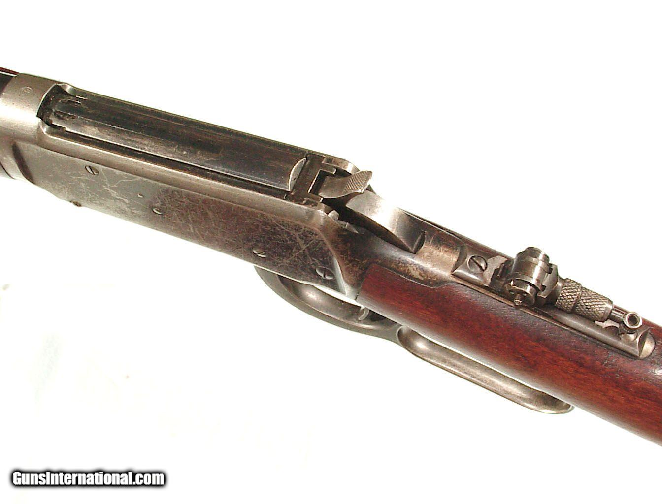 Description: .30-30 caliber, 20" barrel having a two leaf folding express sight with the magazine located underneath. Finished blue overall. Plain long forend and buttstock ending with a carbine buttplate. The barrel and magazine retain much of the original blue, the receiver showing areas of bright metal mixing with blue. Excellent wood and bore. Marbles tang mounted folding peep sight. SOLD Curio/Relic: Yes |