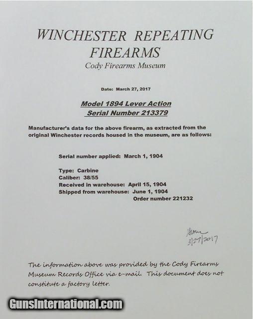 Description: Winchester Model 1894; SN 213379; 38-55 Saddle Ring Carbine; made 1904; GOOD amount of ORIGINAL finish remains; PERFECT action & bore; NICE walnut wood; NEAT 113 year old Winchester; FFL/C&R required for shipping; All items shipped fully insured Priority Mail- -Hand guns $30 --Long guns $45-- Spurs $30-- Knives, Swords & Sabers $30 (Texas residents please add 6.75% sales tax); return policy: three days inspection from the date the item is received; full refund of shipping both ways ONLY IF THE ITEM IS MISREPRESENTED. Note: International sales only as laws permit. Will ship C&R eligible items to C&R license. Antiques shipped without license to anyone EXCEPT New Jersey and City of New York where a FFL is required. SOLD Curio/Relic: Yes Manufacturer: Winchester Model: 1894 Carbine Serial Number: 213379 |