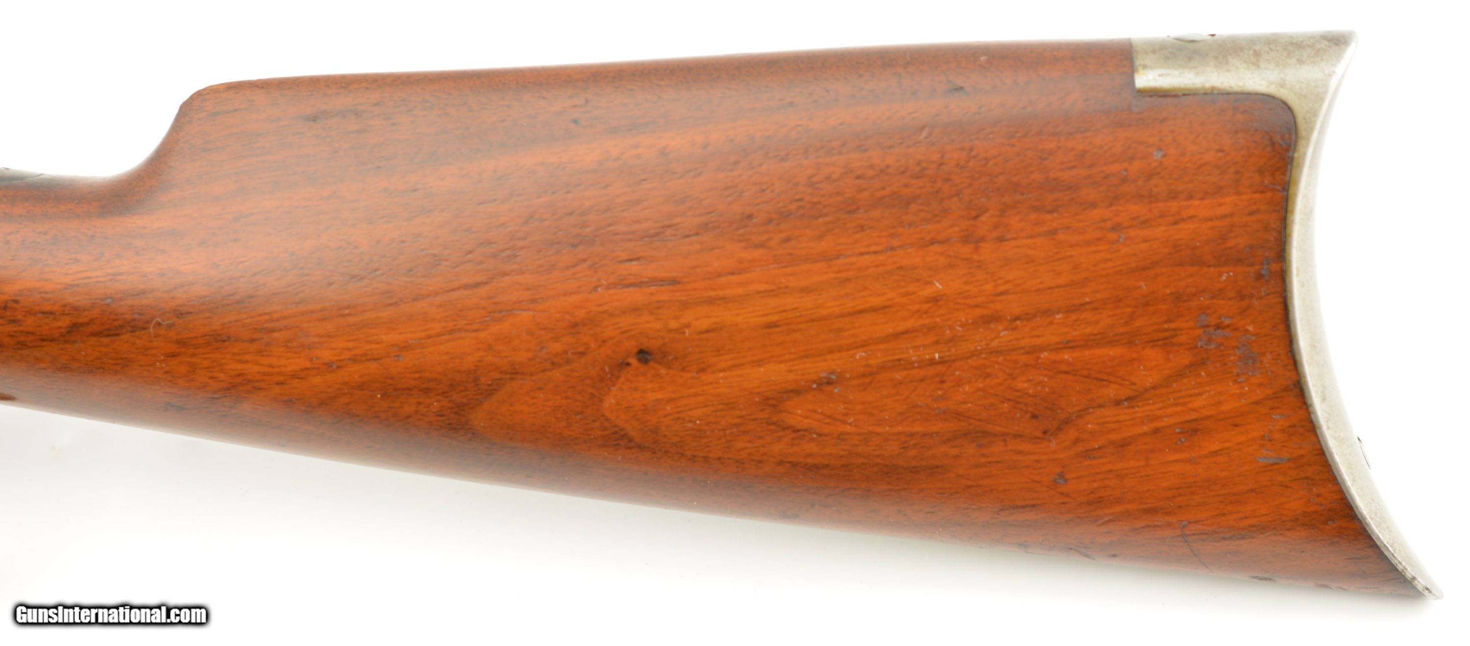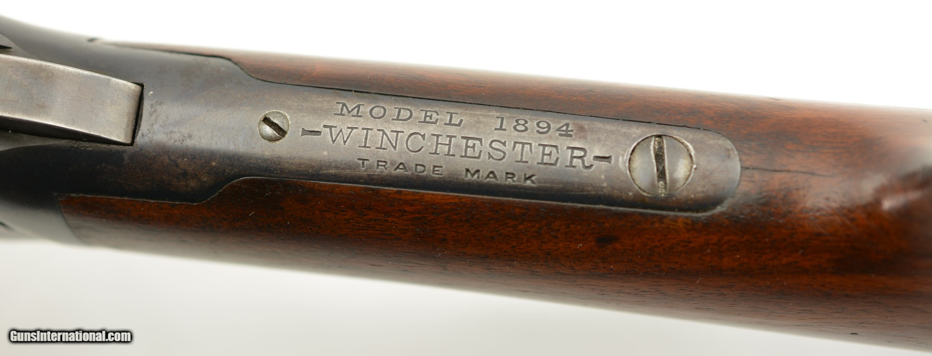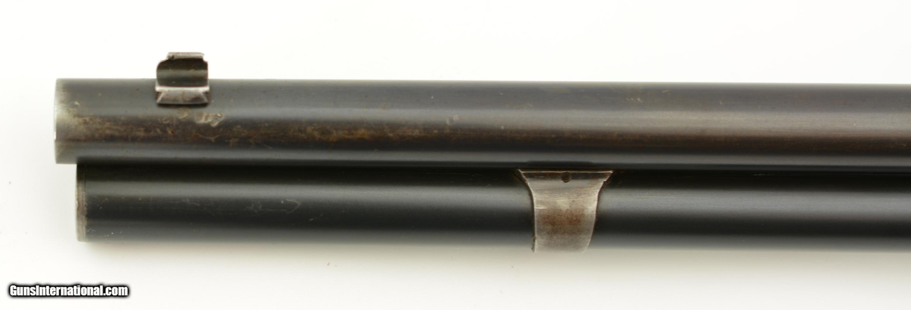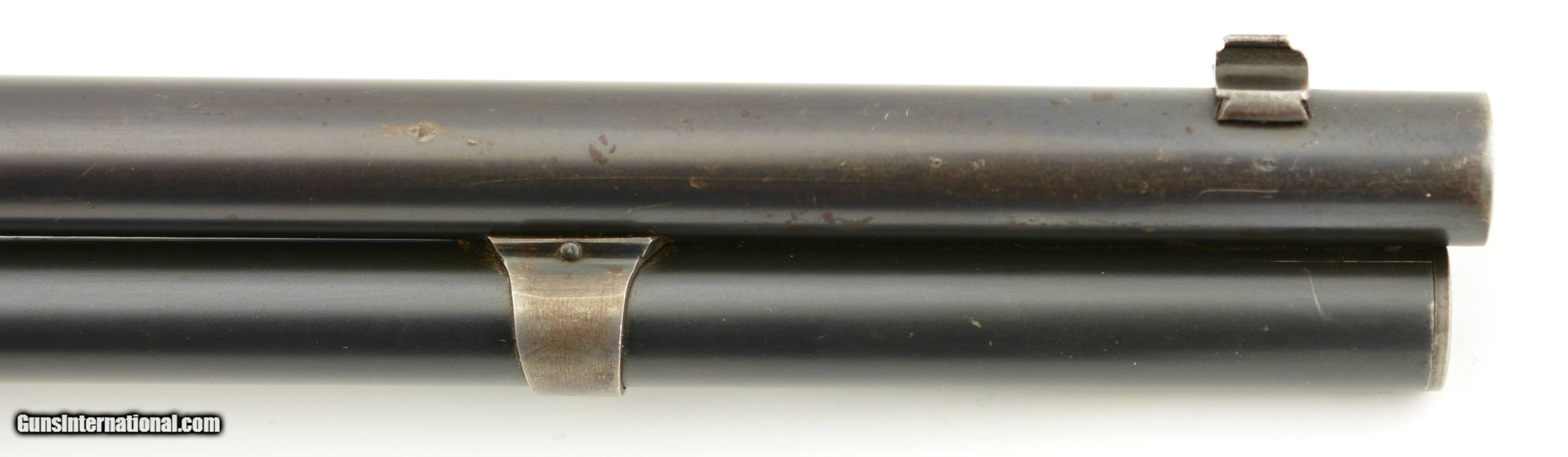 Description: Serial #268416, .32-40, 26" half-octagon barrel with an excellent, bright bore. This is a 1902-made rifle that has retained 80-85% of the original blue, mostly on the barrel and magazine tube, with some silvering at the muzzle, along the edges of the barrel facets, and gray fading along the sides and bottom of the receiver. The lever and hammer have muted, but still visible original color case-hardening remaining, and the crescent steel buttplate has a freckled, bright gray patina. The smooth walnut forend and straight-wrist buttstock have numerous minor handling marks and blemishes under a thick added varnish finish, and a short with-the-grain crack at the tip of the top tang. This is a very nice looking 1894 rifle, with a special order barrel, and lots of original metal finish remaining. It rates about fine condition overall. FFL or C&R SOLD Curio/Relic: Yes Manufacturer: Winchester Model: 1894 Serial Number: 268416 Caliber Info: .32-40 Gauge Info: .32-40 |