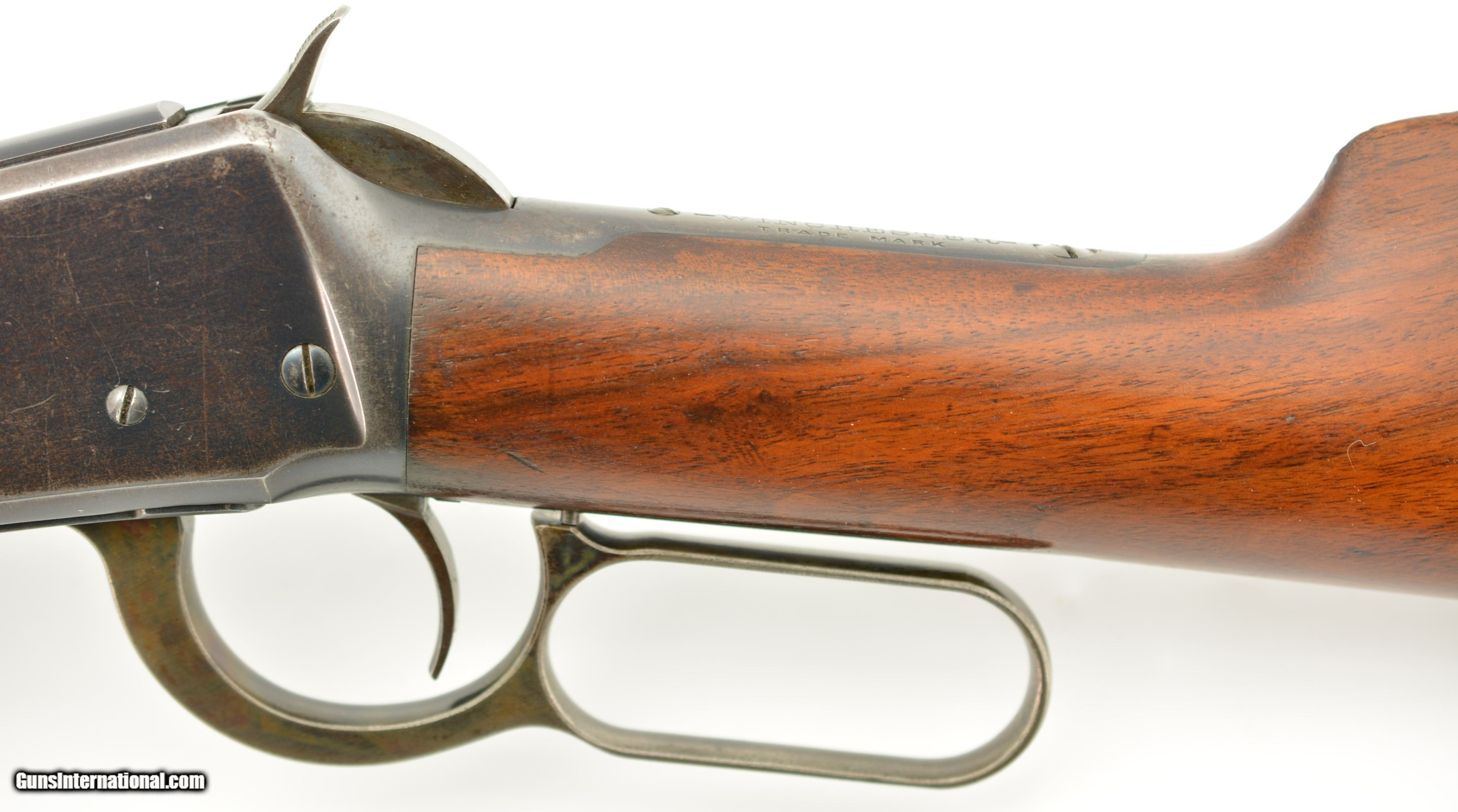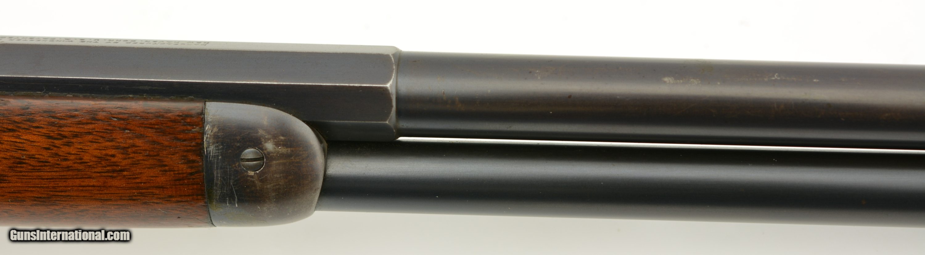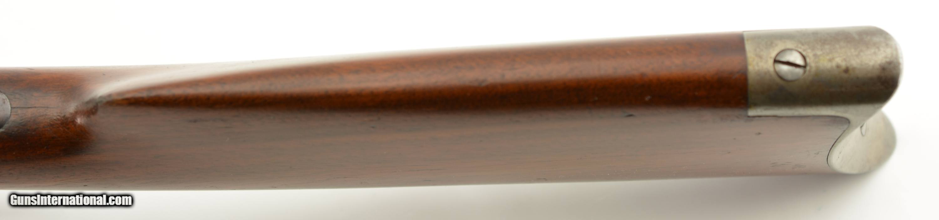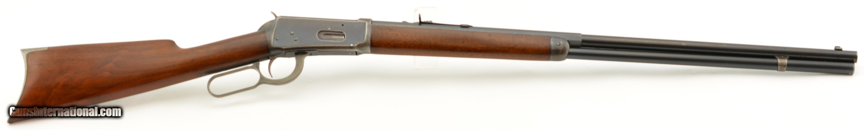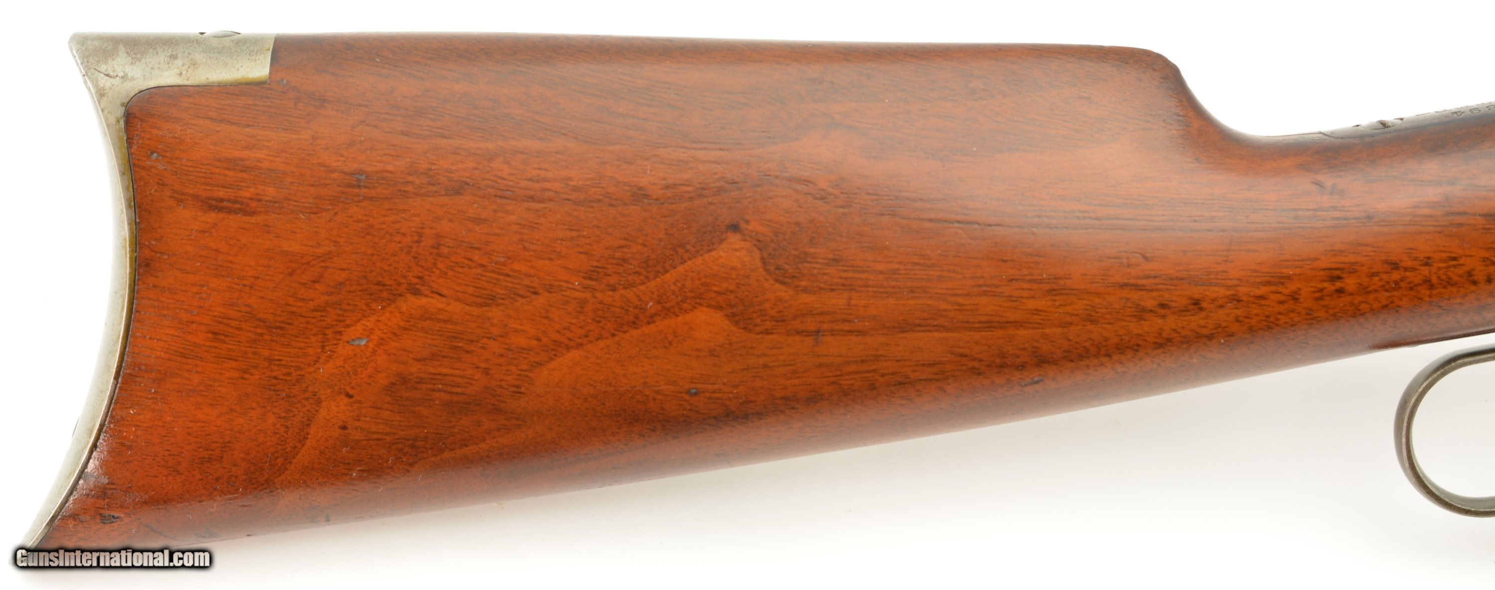 Description: Serial #268416, .32-40, 26" half-octagon barrel with an excellent, bright bore. This is a 1902-made rifle that has retained 80-85% of the original blue, mostly on the barrel and magazine tube, with some silvering at the muzzle, along the edges of the barrel facets, and gray fading along the sides and bottom of the receiver. The lever and hammer have muted, but still visible original color case-hardening remaining, and the crescent steel buttplate has a freckled, bright gray patina. The smooth walnut forend and straight-wrist buttstock have numerous minor handling marks and blemishes under a thick added varnish finish, and a short with-the-grain crack at the tip of the top tang. This is a very nice looking 1894 rifle, with a special order barrel, and lots of original metal finish remaining. It rates about fine condition overall. FFL or C&R SOLD Curio/Relic: Yes Manufacturer: Winchester Model: 1894 Serial Number: 268416 Caliber Info: .32-40 Gauge Info: .32-40 |