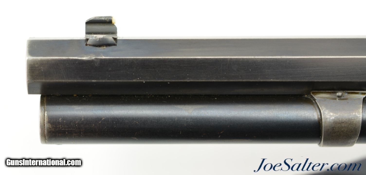Description: Serial #360966, .30 WCF (.30-30), 26" octagon barrel with a fine, bright bore that has some faint traces of freckling within the grooves at the muzzle. This is a handsome rifle that was made in 1906 and retains 80-85% of the original blue along the barrel and magazine tube, with silvering along the edges of the barrel facets, and on the magazine cap and bracket. The frame has a 75-80% of the original blue remaining, with gray fading along the forward portion and carry points. The lever has faded, but still visible color case-hardening, with the balance faded to a smooth pewter gray. The walnut forend and pistol-grip buttstock are in very good condition with minor handling marks scattered about the reapplied varnish, and the checkering has been refreshed at some point. The crescent steel buttplate has a pale gray patina with some scattered specks of freckling. This is a very nice example of a Model 1894 semi-deluxe rifle, in fine condition, and would make a splendid addition to any collection. FFL or C&R SOLD Curio/Relic: Yes |