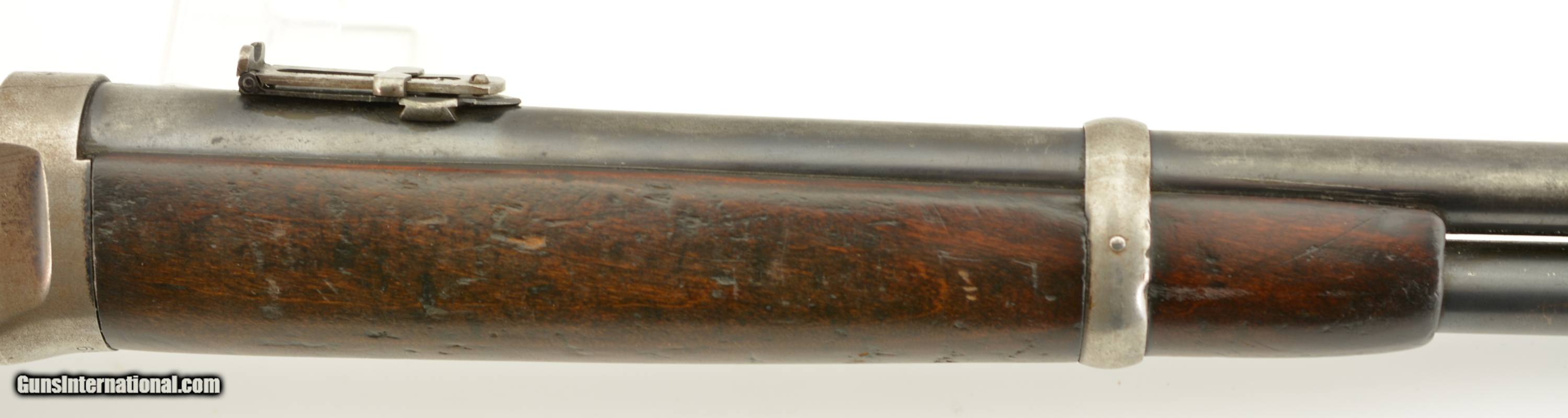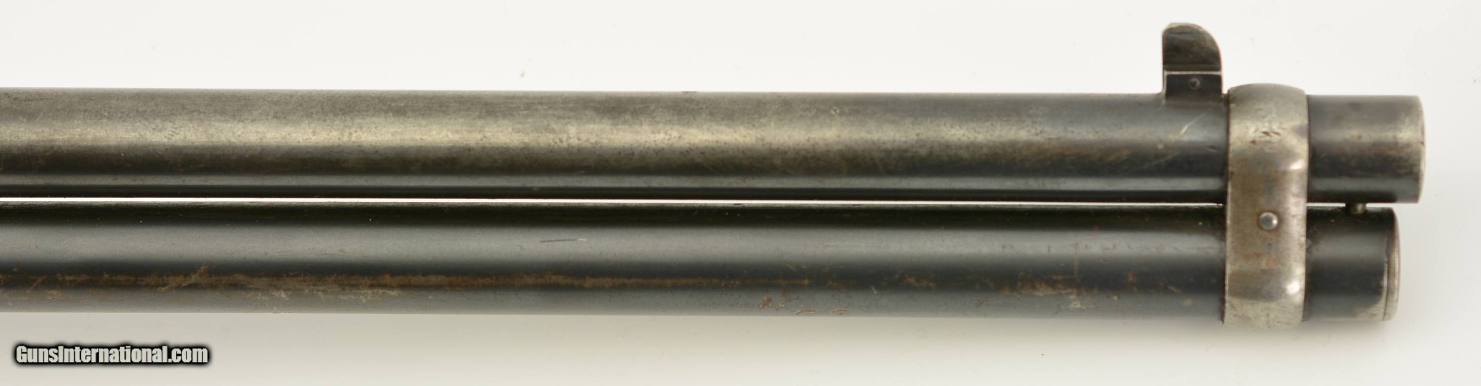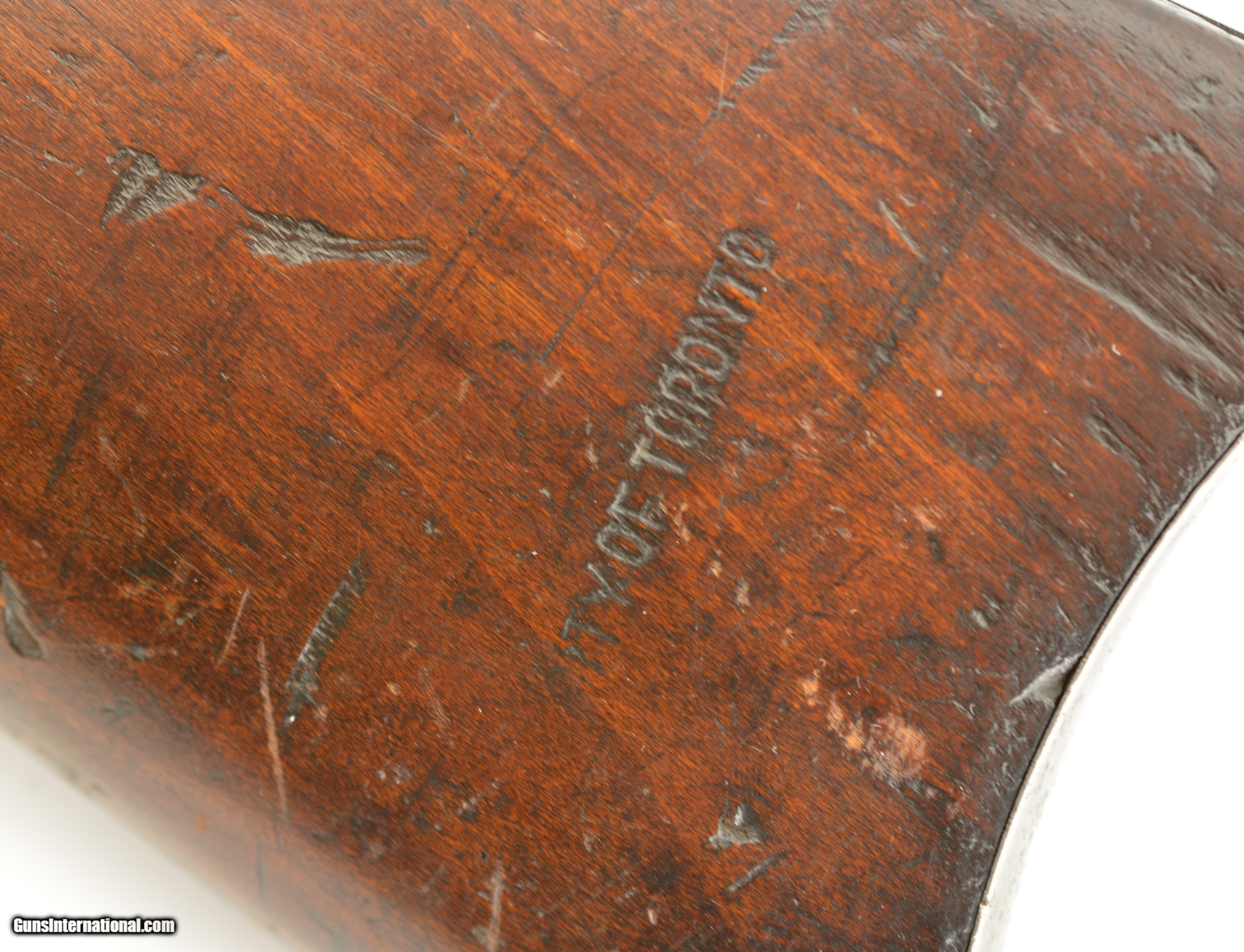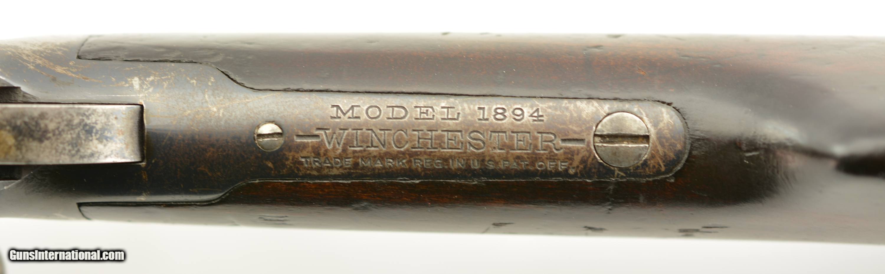 Description: Serial #697767, .30 WCF (.30-30), 20" barrel with a fine, bright bore that has some mild freckling within the grooves along its length. This is a 1913-made carbine that has retained 30-40% of the original blue, mostly along the protected areas of the barrel and magazine tube, and the balance worn to dark, pewter gray with thin freckling throughout. Some further areas of original blue remain on the rear of the frame with a semi-circular swath of brightness from the saddle ring on the left side. The walnut forend and buttstock have added varnish over numerous small handling marks and blemishes scattered throughout. A "(CI)TY OF TORONTO" police marking is stamped into the wood on the left side of the buttstock near the steel buttplate. This is a great, pre-WW1 ‘94 SRC, in very good-fine condition, and with a rare Canadian police marking. FFL or C&R SOLD Curio/Relic: Yes Manufacturer: Winchester Model: 1894 Serial Number: 697767 Caliber Info: .30-30 Gauge Info: .30-30 |