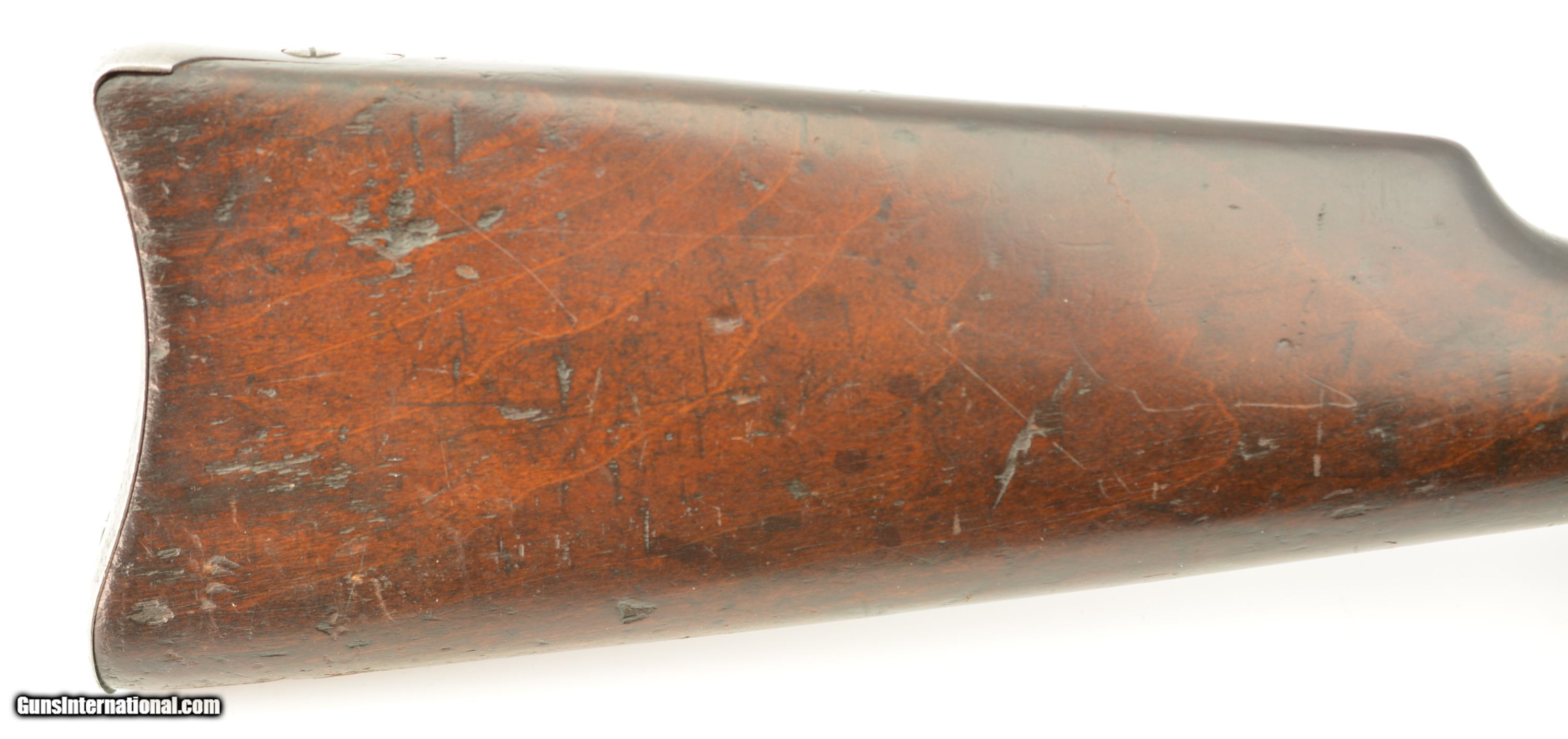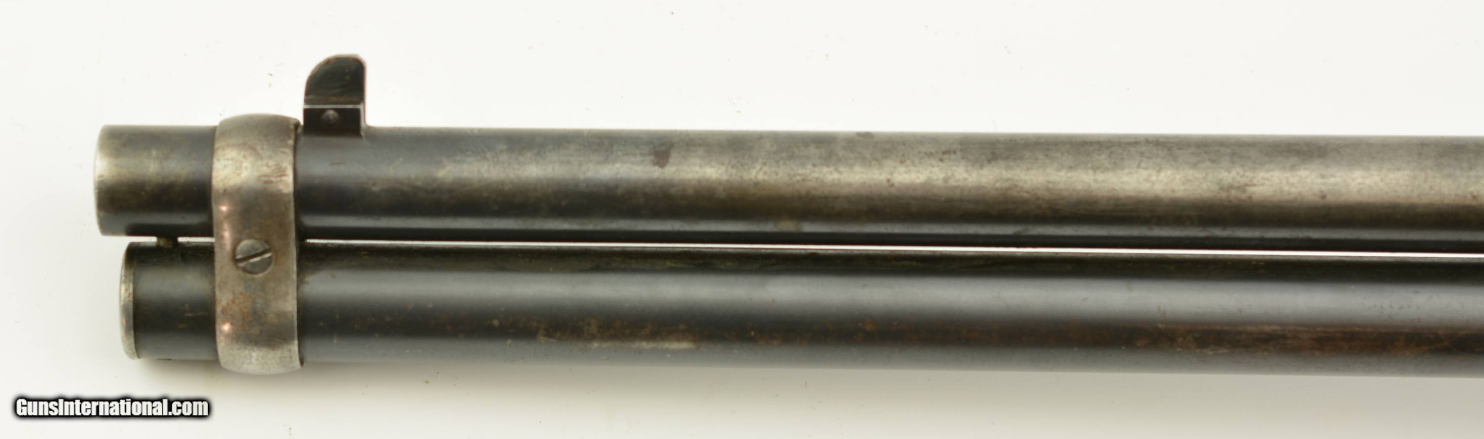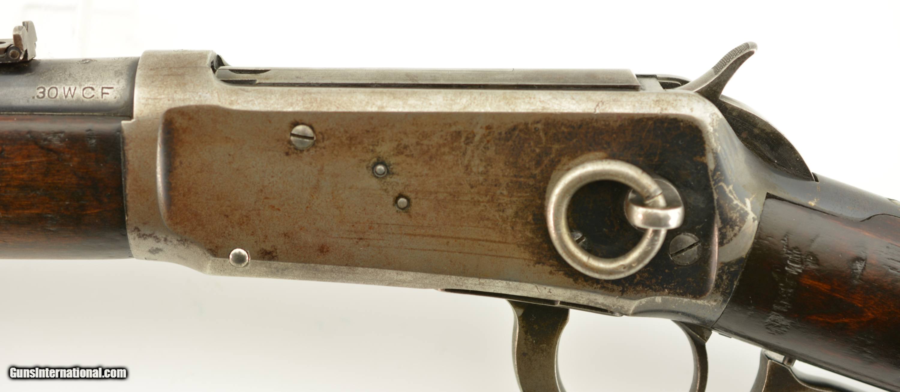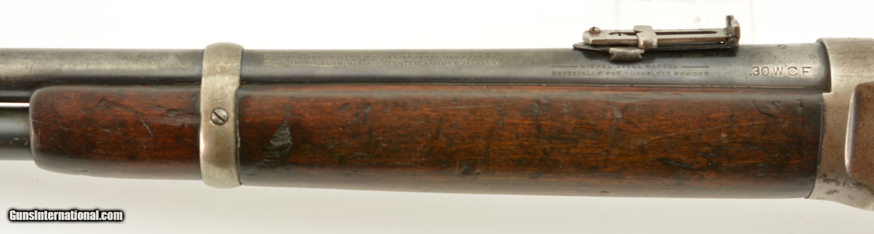 Description: Serial #697767, .30 WCF (.30-30), 20" barrel with a fine, bright bore that has some mild freckling within the grooves along its length. This is a 1913-made carbine that has retained 30-40% of the original blue, mostly along the protected areas of the barrel and magazine tube, and the balance worn to dark, pewter gray with thin freckling throughout. Some further areas of original blue remain on the rear of the frame with a semi-circular swath of brightness from the saddle ring on the left side. The walnut forend and buttstock have added varnish over numerous small handling marks and blemishes scattered throughout. A "(CI)TY OF TORONTO" police marking is stamped into the wood on the left side of the buttstock near the steel buttplate. This is a great, pre-WW1 ‘94 SRC, in very good-fine condition, and with a rare Canadian police marking. FFL or C&R SOLD Curio/Relic: Yes Manufacturer: Winchester Model: 1894 Serial Number: 697767 Caliber Info: .30-30 Gauge Info: .30-30 |