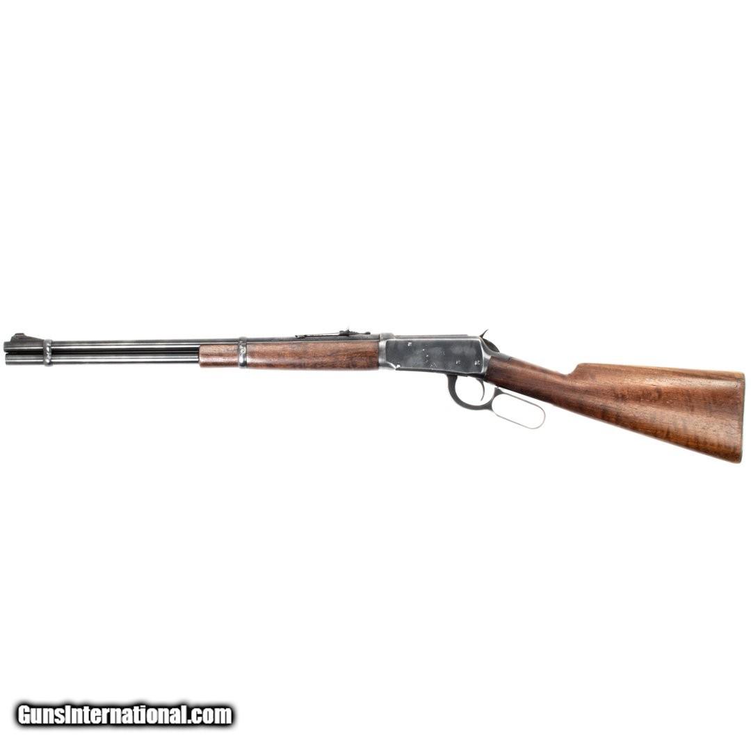 This Winchester rifle has iron sights and was manufactured in 1949. There are scratches on the receiver and the stock has marks & scratches from use.