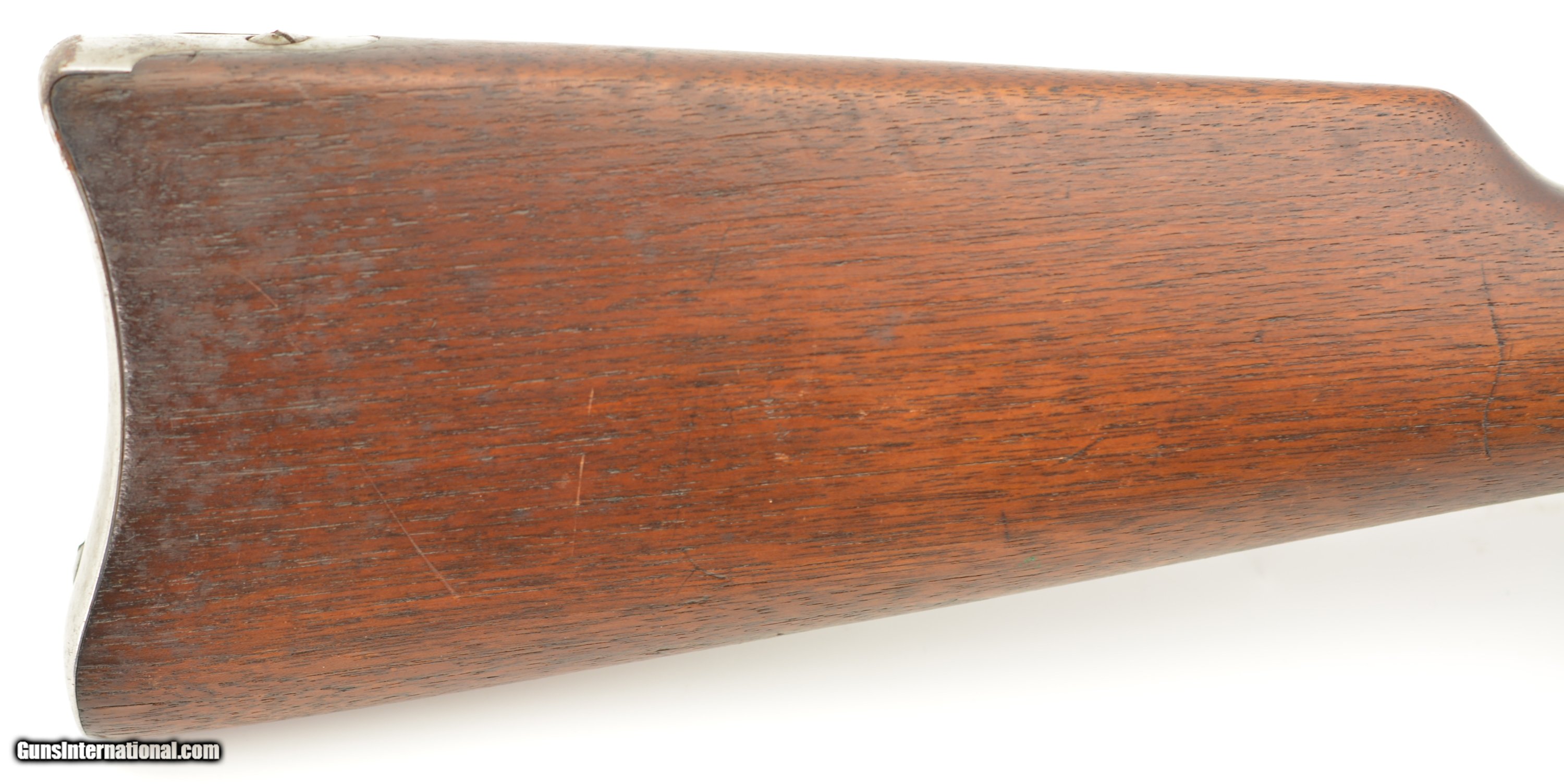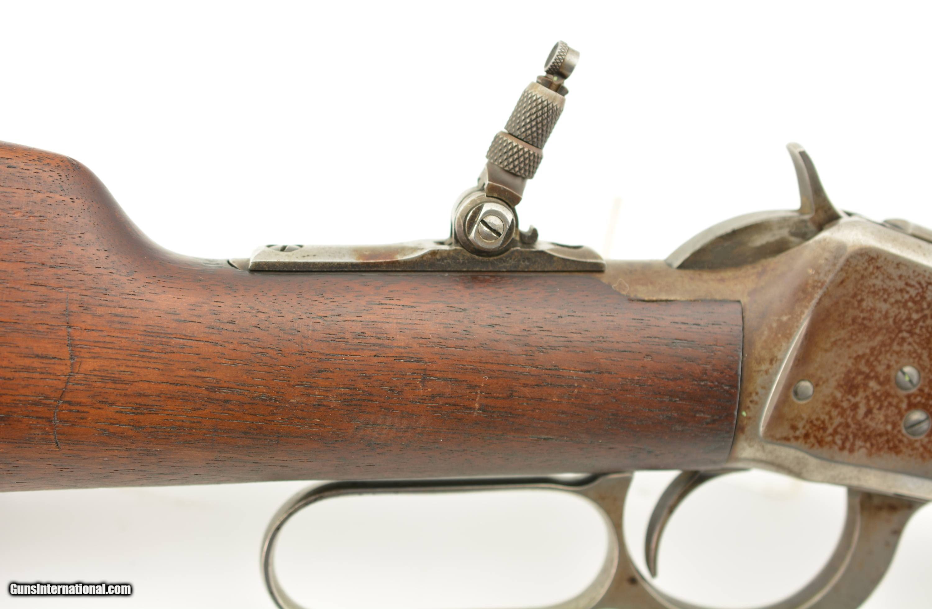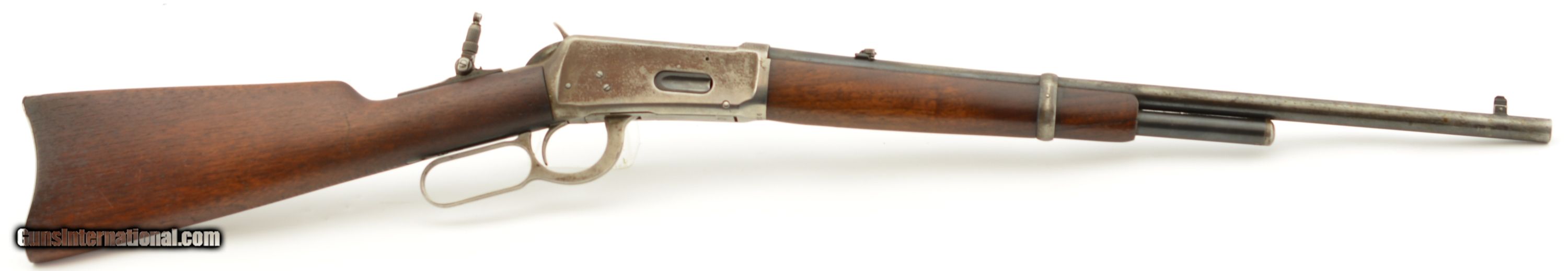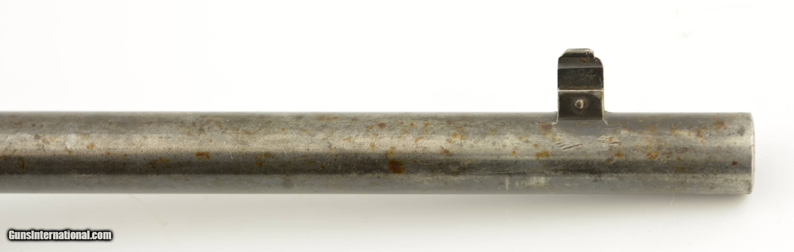 Description: Serial #932686, .32 Win. Spl., 20" barrel with a fine, bright bore that has mild freckling within the grooves. This is a 1921-made carbine that features a special order short magazine, and retains about 20-30% of the original blue finish, mostly on the tube, and a fairly bright pewter gray patina on the balance of the metal. Patches of plum-brown freckling are present on the barrel, and there are further areas of plum-brown on the sides of the receiver. The saddle ring is still present, however, the front and rear barrel sights are later replacements (a series of tool marks are present on the top of the barrel aft of the rear sight as well). Additionally, a Marble's folding tang sight is also installed. The walnut forend and buttstock are in about good condition with scattered minor handling marks and blemishes throughout, as well as a large crack at the tip of the forend, and a series of with-the-grain cracks running backwards from the lower tang. A series of 22 notches has been carved into the wood along the belly of the buttstock. The original steel buttplate is still fitted, and has some dark brown mottling along the curve. This is a very nice Winchester SRC, and is in about very good condition overall. FFL or C&R SOLD Curio/Relic: Yes |