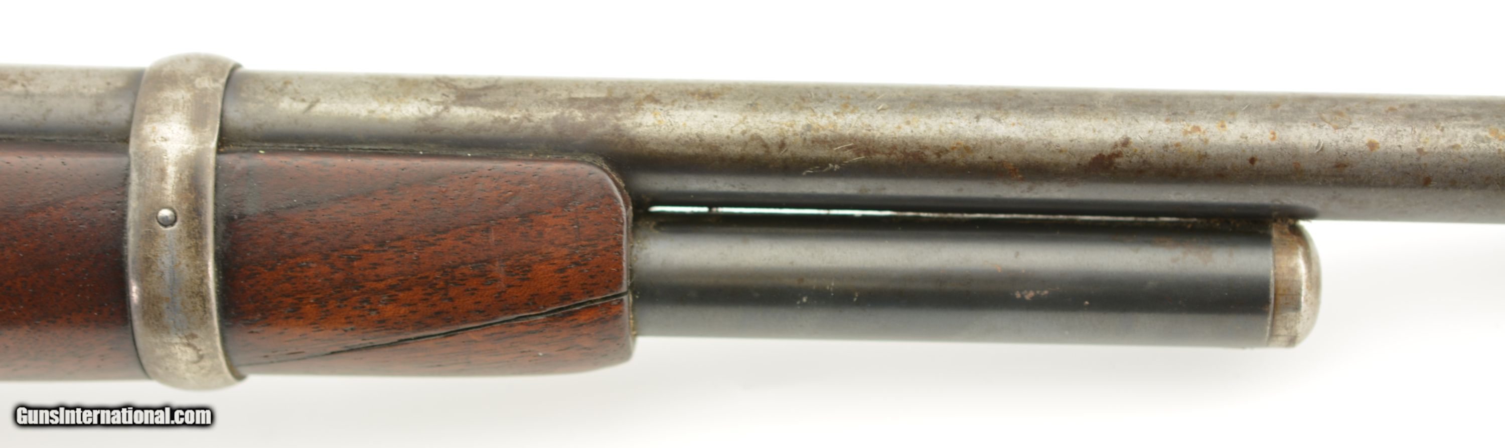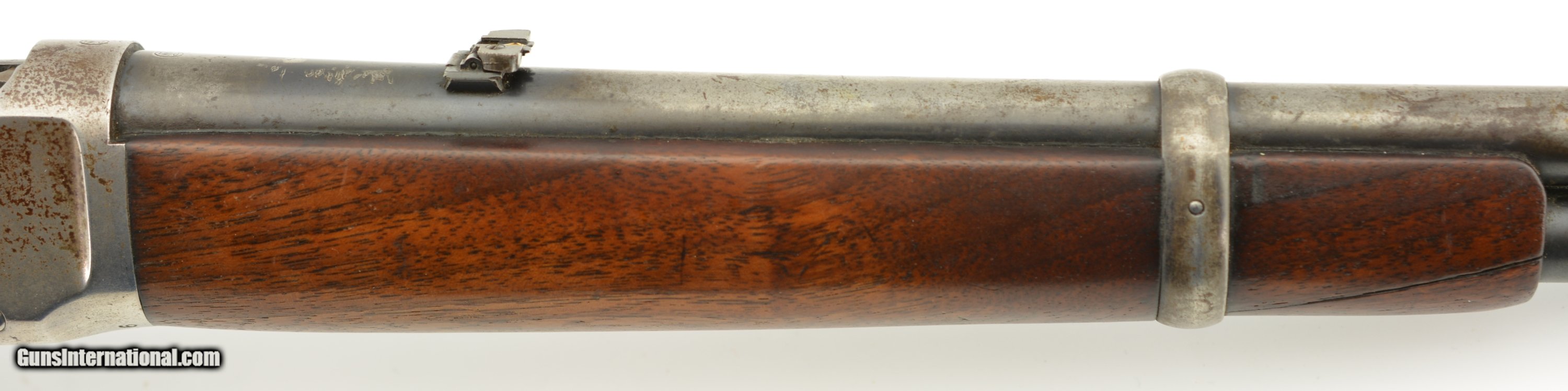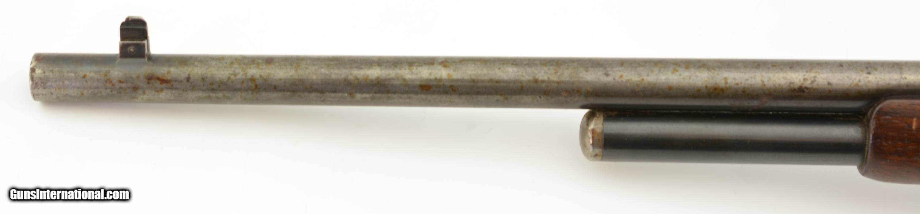 Description: Serial #932686, .32 Win. Spl., 20" barrel with a fine, bright bore that has mild freckling within the grooves. This is a 1921-made carbine that features a special order short magazine, and retains about 20-30% of the original blue finish, mostly on the tube, and a fairly bright pewter gray patina on the balance of the metal. Patches of plum-brown freckling are present on the barrel, and there are further areas of plum-brown on the sides of the receiver. The saddle ring is still present, however, the front and rear barrel sights are later replacements (a series of tool marks are present on the top of the barrel aft of the rear sight as well). Additionally, a Marble's folding tang sight is also installed. The walnut forend and buttstock are in about good condition with scattered minor handling marks and blemishes throughout, as well as a large crack at the tip of the forend, and a series of with-the-grain cracks running backwards from the lower tang. A series of 22 notches has been carved into the wood along the belly of the buttstock. The original steel buttplate is still fitted, and has some dark brown mottling along the curve. This is a very nice Winchester SRC, and is in about very good condition overall. FFL or C&R SOLD Curio/Relic: Yes |