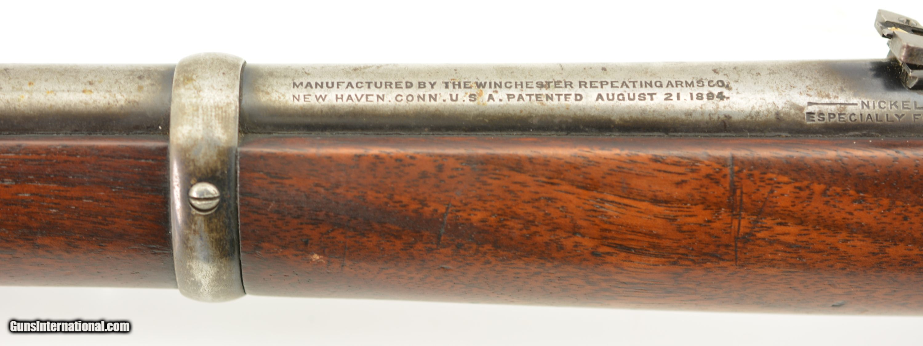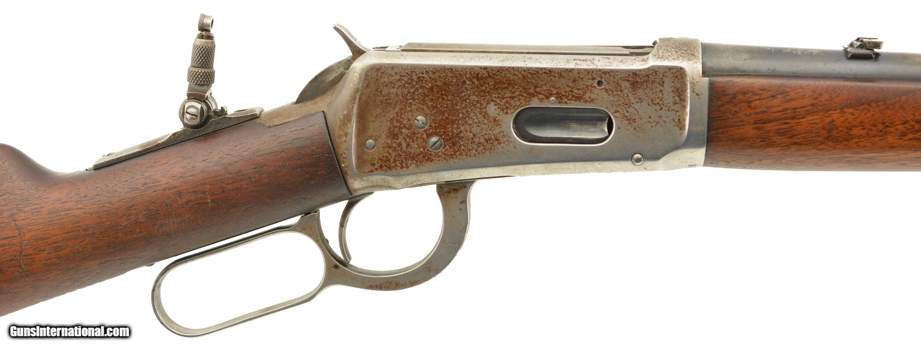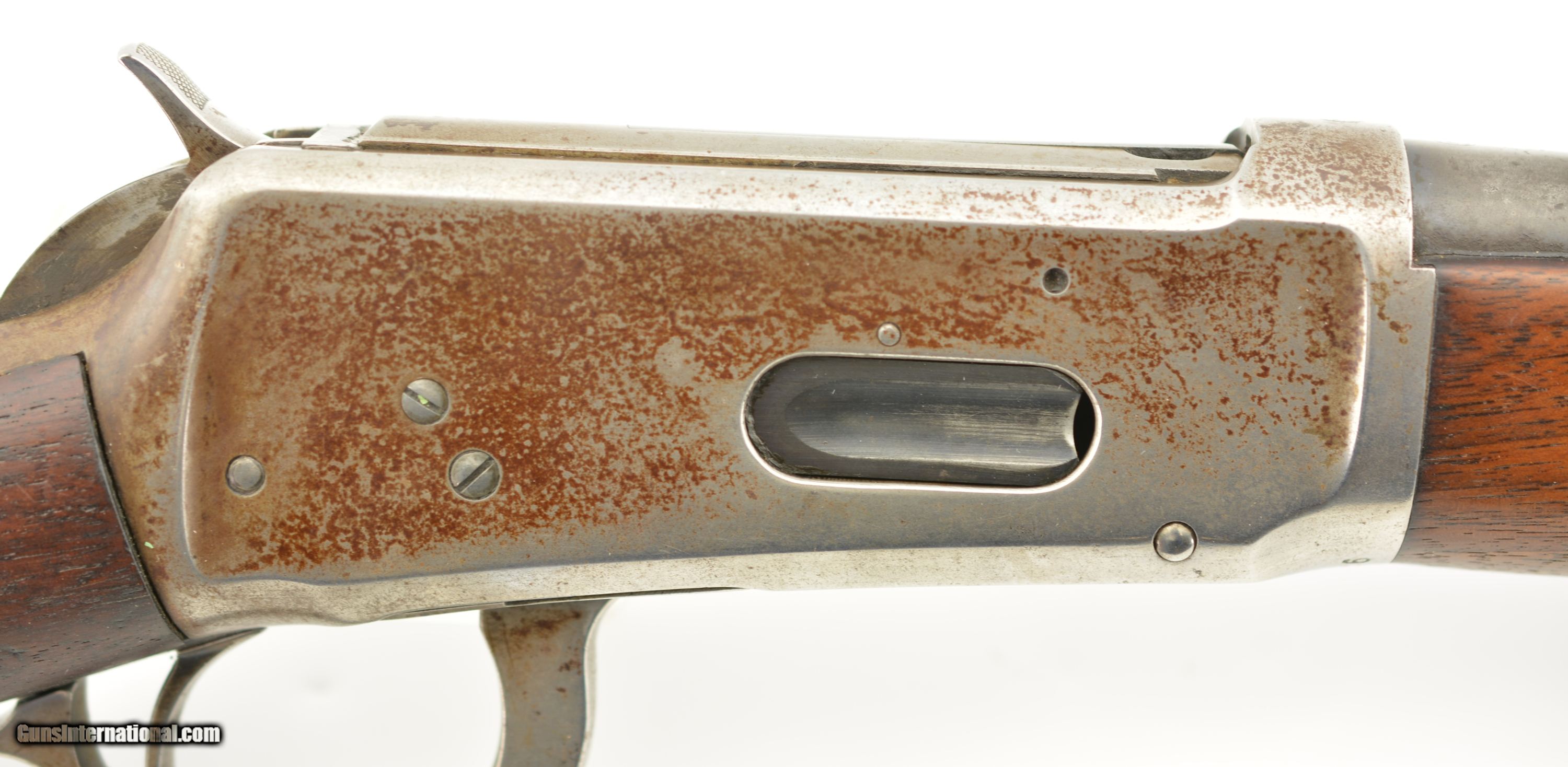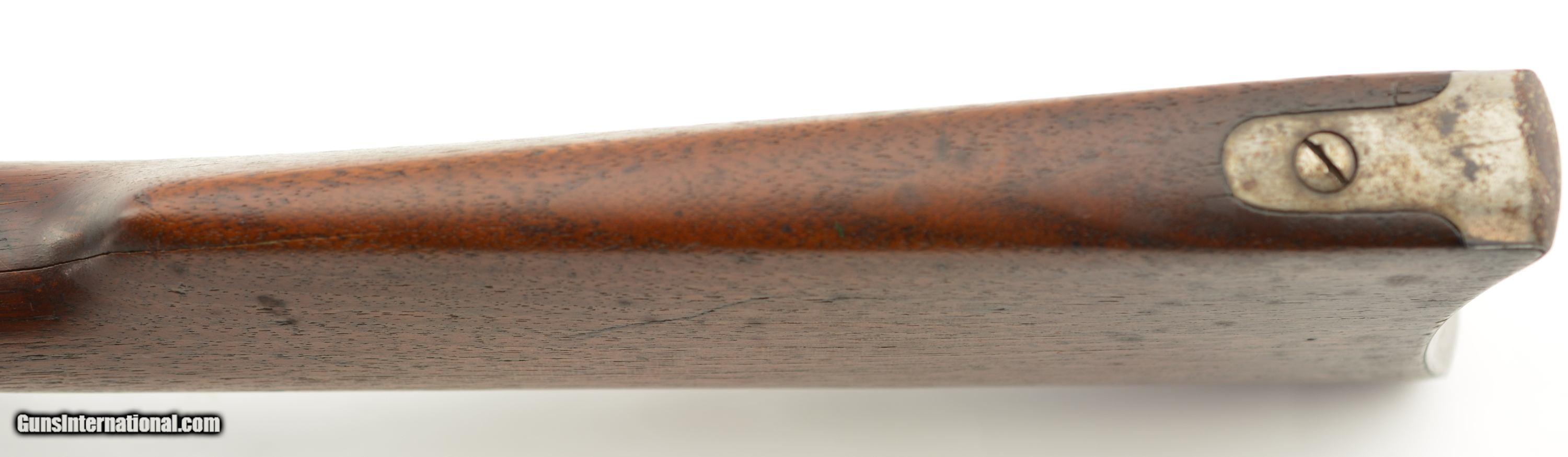 Description: Serial #932686, .32 Win. Spl., 20" barrel with a fine, bright bore that has mild freckling within the grooves. This is a 1921-made carbine that features a special order short magazine, and retains about 20-30% of the original blue finish, mostly on the tube, and a fairly bright pewter gray patina on the balance of the metal. Patches of plum-brown freckling are present on the barrel, and there are further areas of plum-brown on the sides of the receiver. The saddle ring is still present, however, the front and rear barrel sights are later replacements (a series of tool marks are present on the top of the barrel aft of the rear sight as well). Additionally, a Marble's folding tang sight is also installed. The walnut forend and buttstock are in about good condition with scattered minor handling marks and blemishes throughout, as well as a large crack at the tip of the forend, and a series of with-the-grain cracks running backwards from the lower tang. A series of 22 notches has been carved into the wood along the belly of the buttstock. The original steel buttplate is still fitted, and has some dark brown mottling along the curve. This is a very nice Winchester SRC, and is in about very good condition overall. FFL or C&R SOLD Curio/Relic: Yes |