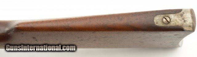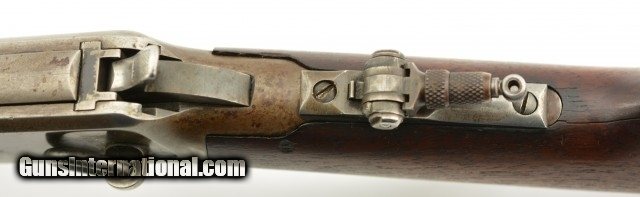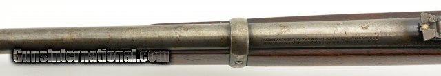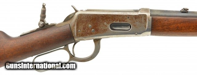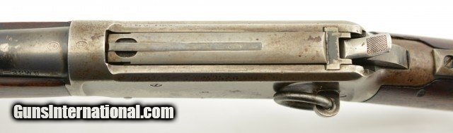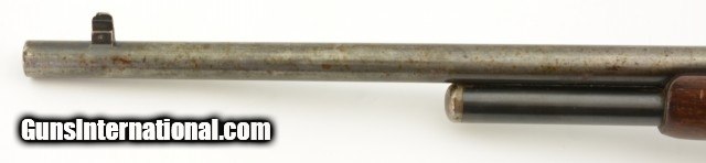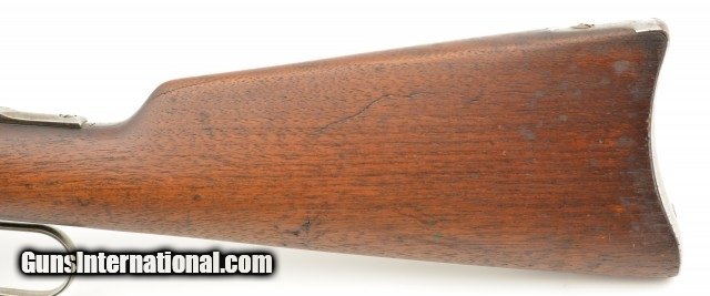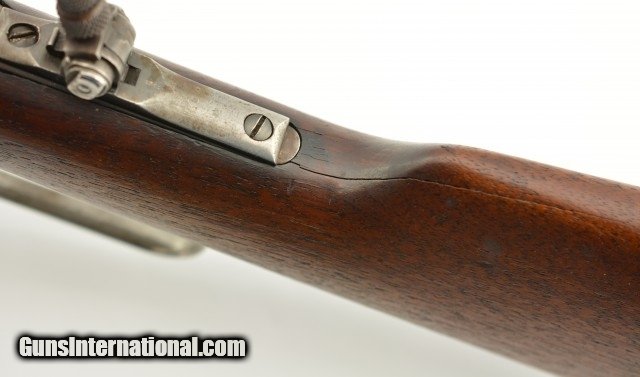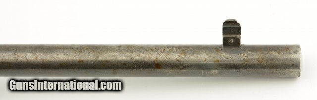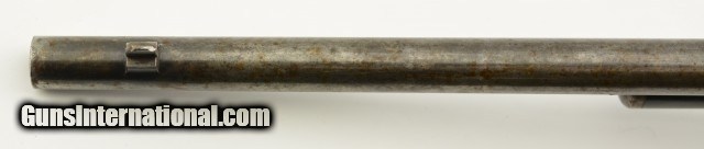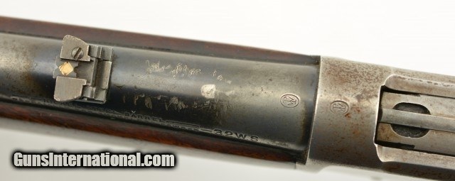 Description: Serial #932686, .32 Win. Spl., 20" barrel with a fine, bright bore that has mild freckling within the grooves. This is a 1921-made carbine that features a special order short magazine, and retains about 20-30% of the original blue finish, mostly on the tube, and a fairly bright pewter gray patina on the balance of the metal. Patches of plum-brown freckling are present on the barrel, and there are further areas of plum-brown on the sides of the receiver. The saddle ring is still present, however, the front and rear barrel sights are later replacements (a series of tool marks are present on the top of the barrel aft of the rear sight as well). Additionally, a Marble's folding tang sight is also installed. The walnut forend and buttstock are in about good condition with scattered minor handling marks and blemishes throughout, as well as a large crack at the tip of the forend, and a series of with-the-grain cracks running backwards from the lower tang. A series of 22 notches has been carved into the wood along the belly of the buttstock. The original steel buttplate is still fitted, and has some dark brown mottling along the curve. This is a very nice Winchester SRC, and is in about very good condition overall. FFL or C&R SOLD |