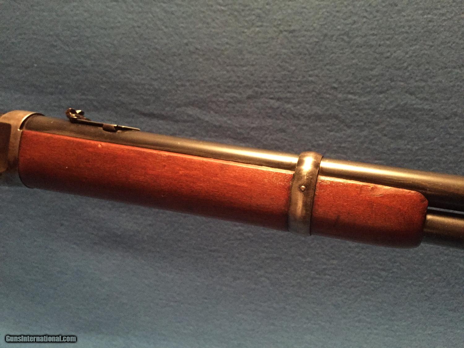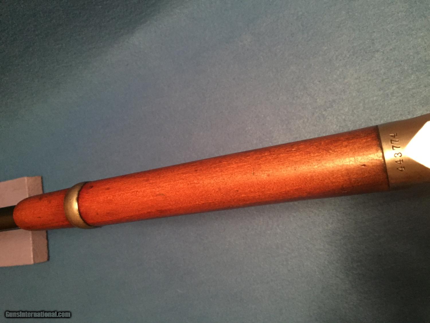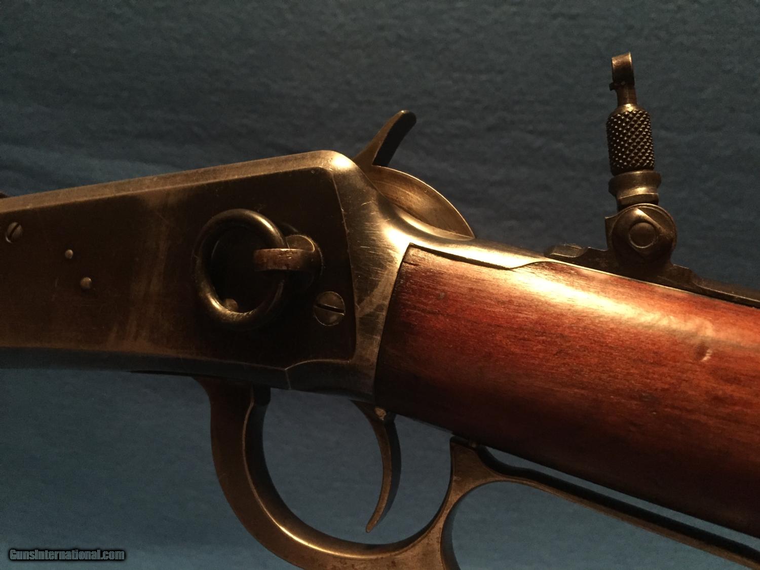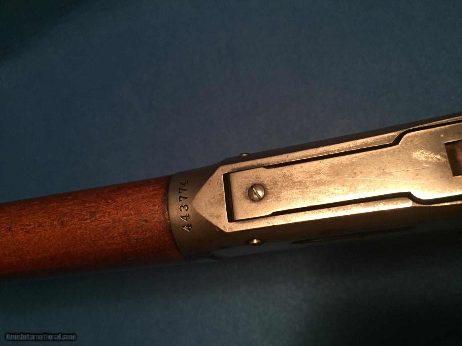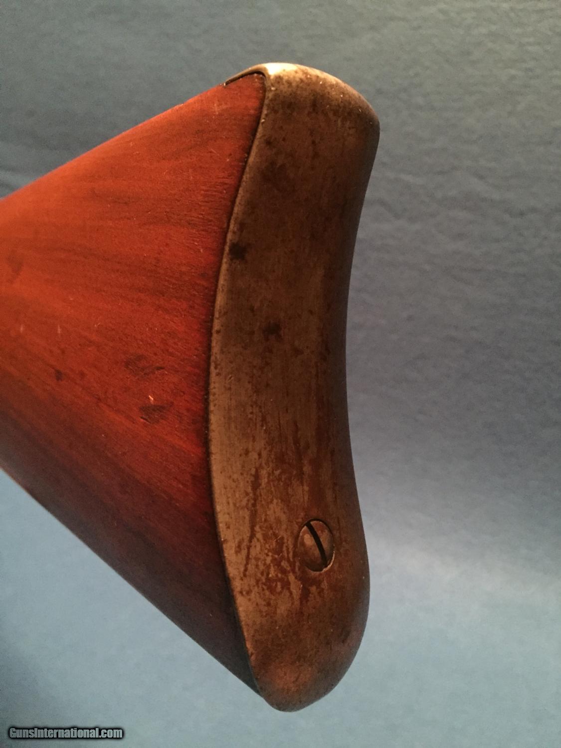 Description: Winchester Mod 1894 Saddle Ring Carbine 32 W.S. 20 IN barrel with an excellent bore. The barrel and mag tube retains 85% plus blue. The hammer and lever have light traces of original case color. Excellent cherry wood butt stock and forearm with brass blade carbine front sight. Winchester express two folding, one standing leaf rear sight, and a Lyman No.1 tang sight. Truly a honest untouched 1894 SRC. Nice Gun SOLD Curio/Relic: Yes Manufacturer: WINCHESTER Model: 1894 SRC Serial Number: 443774 Caliber Info: 31 WS Metal Condition: OVERALL 80% Wood Condition: NEAR EXCELLENT Bore Condition: BRIGHT SHINEY Barrel Type: 20 IN Action: LEVER Stock: CHERRY Butt Pad: STEEL CARBINE BUTT Sights: WIN & LYMAN Manufacture Date: 1908 |