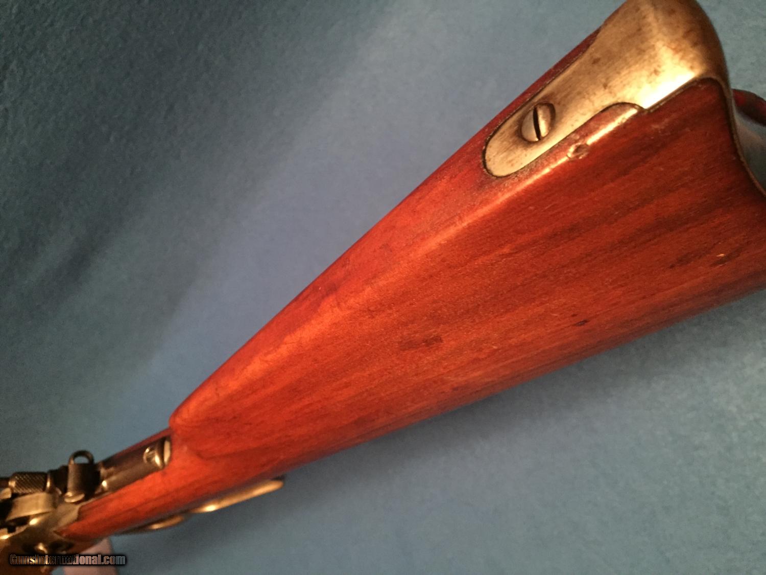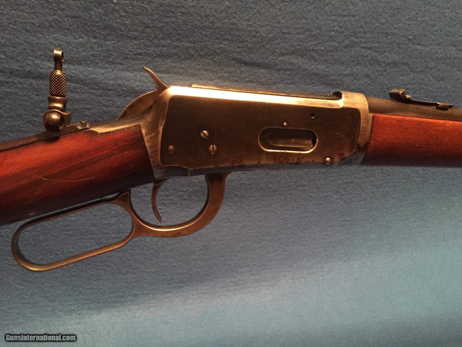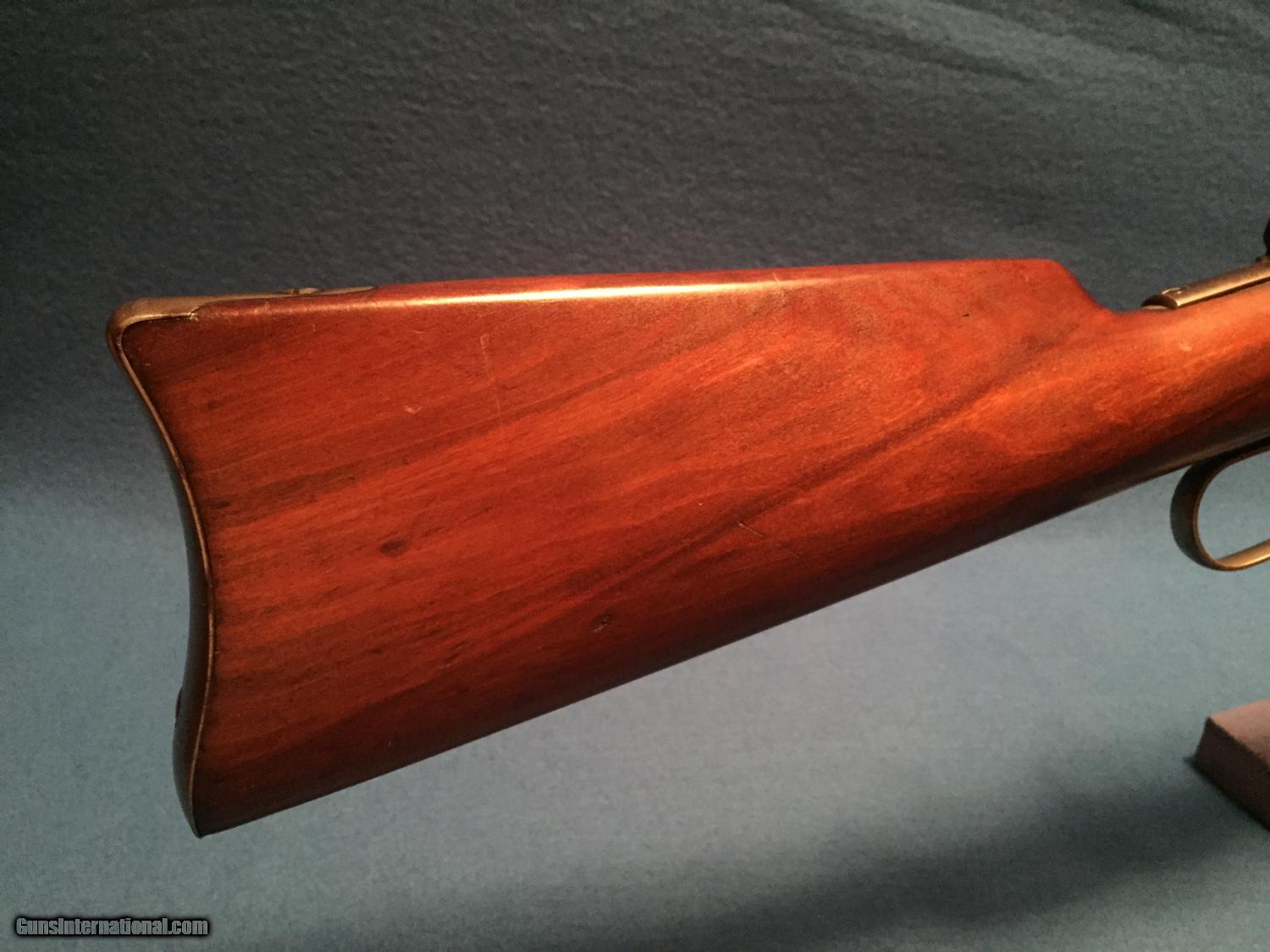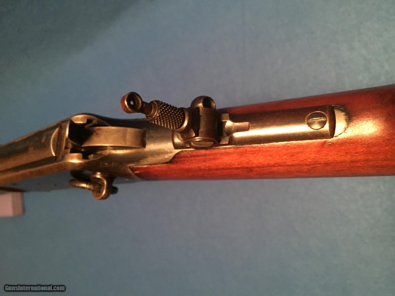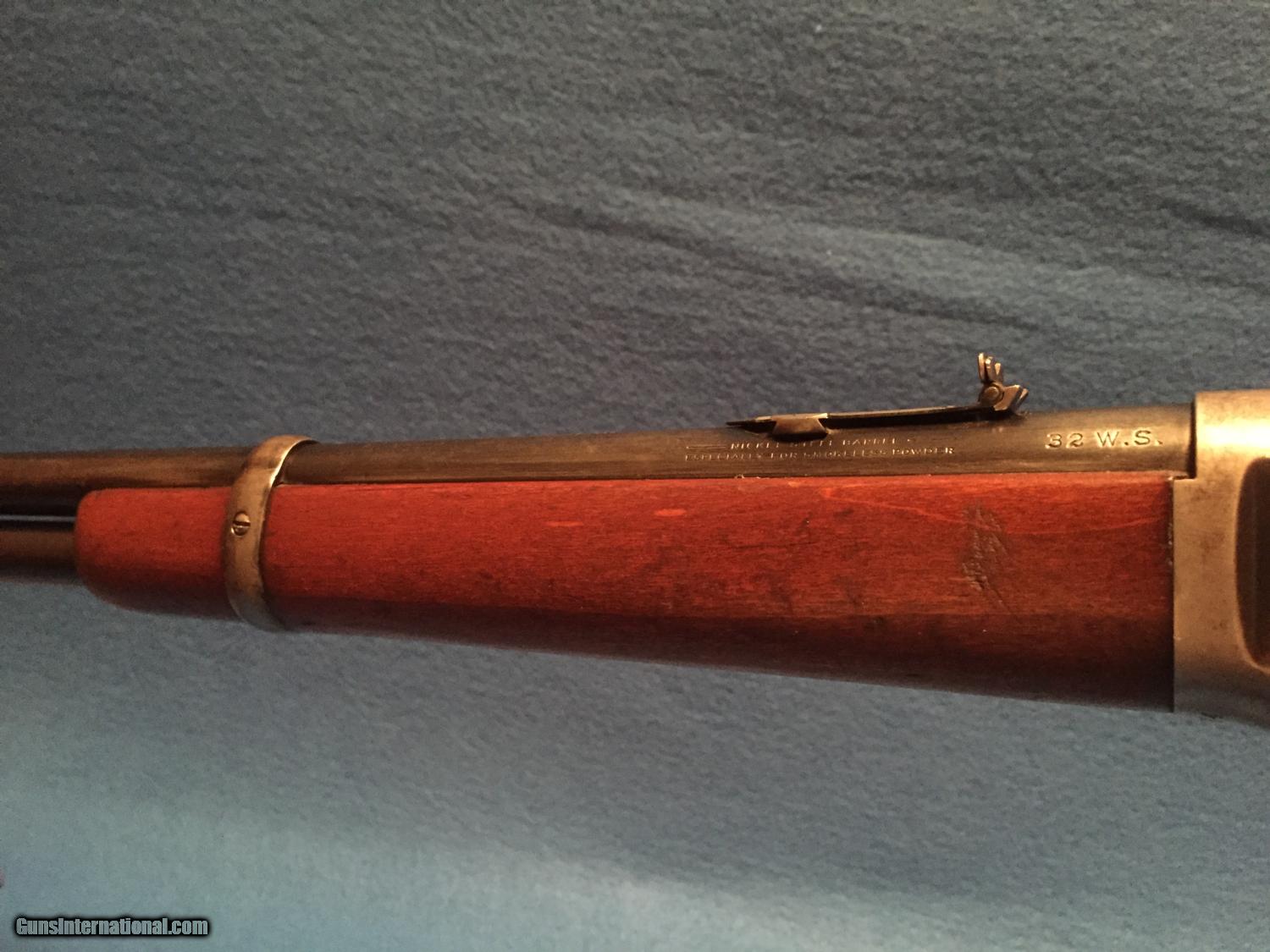 Description: Winchester Mod 1894 Saddle Ring Carbine 32 W.S. 20 IN barrel with an excellent bore. The barrel and mag tube retains 85% plus blue. The hammer and lever have light traces of original case color. Excellent cherry wood butt stock and forearm with brass blade carbine front sight. Winchester express two folding, one standing leaf rear sight, and a Lyman No.1 tang sight. Truly a honest untouched 1894 SRC. Nice Gun SOLD Curio/Relic: Yes Manufacturer: WINCHESTER Model: 1894 SRC Serial Number: 443774 Caliber Info: 31 WS Metal Condition: OVERALL 80% Wood Condition: NEAR EXCELLENT Bore Condition: BRIGHT SHINEY Barrel Type: 20 IN Action: LEVER Stock: CHERRY Butt Pad: STEEL CARBINE BUTT Sights: WIN & LYMAN Manufacture Date: 1908 |