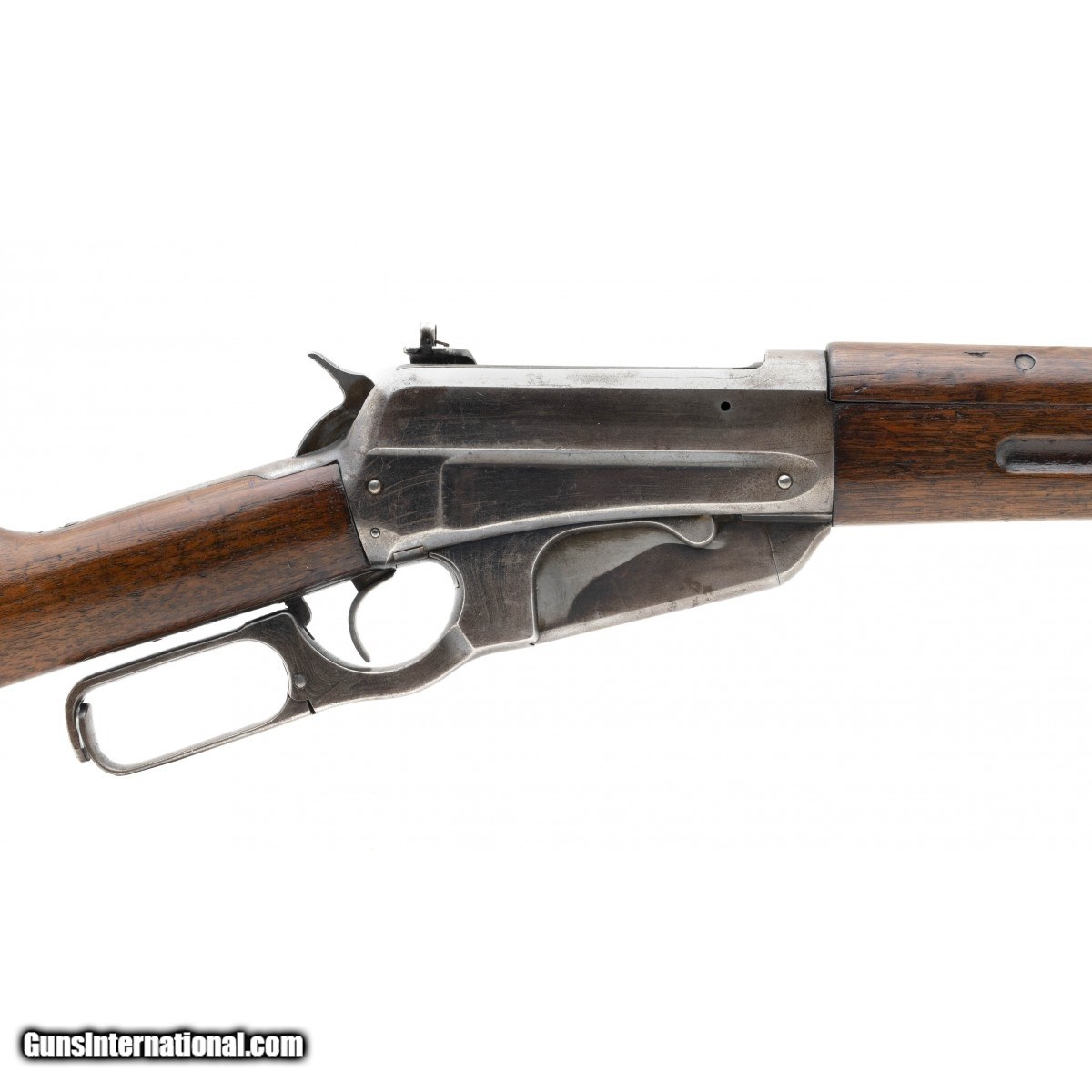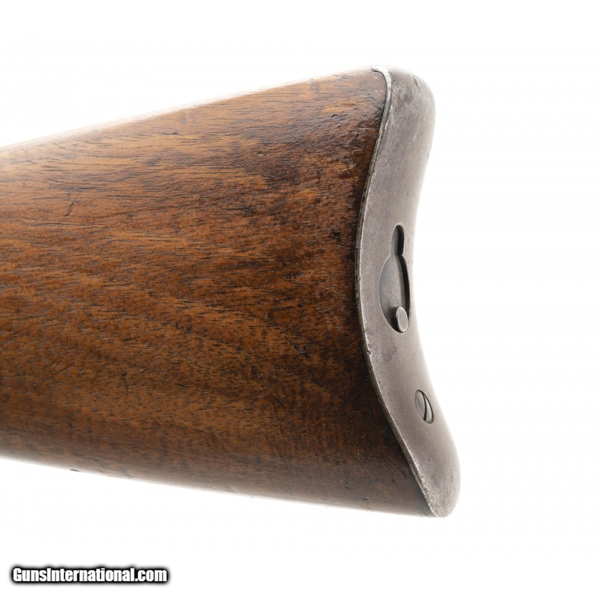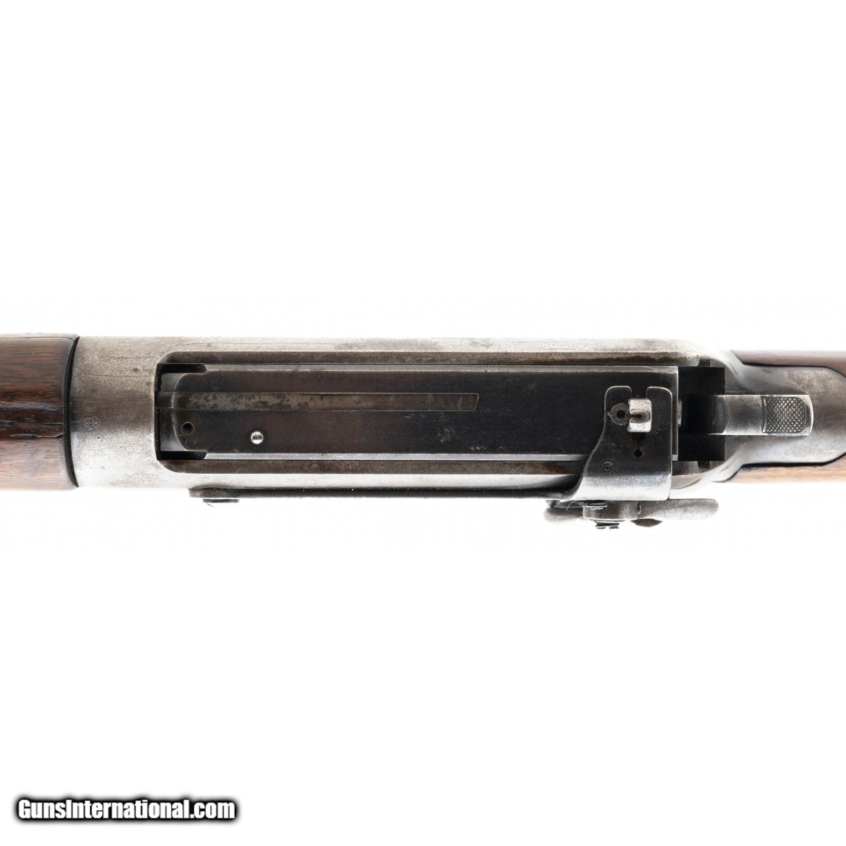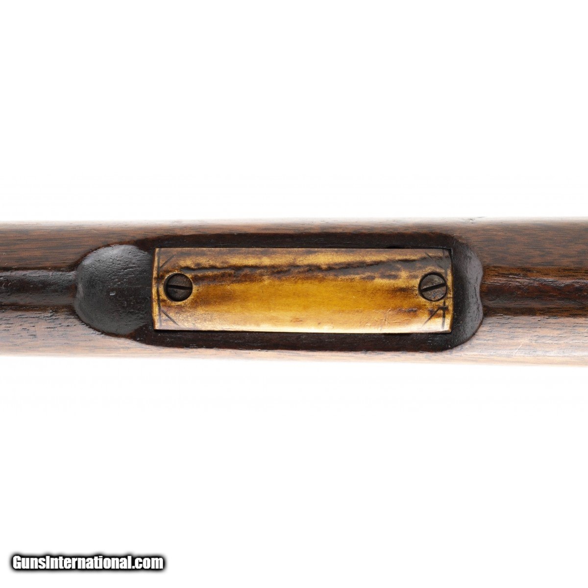 Description: "Serial number 26946. Made in 1900. 30-06 caliber with a 22" barrel. Gun is very good with 70% of the original blue on the barrel. The frame has approximately 50% of the original blue. The wood has had a coat of varnish on both the forearm and the butt stock. The rear sight has been removed and has been replaced with a piece of stag as a filler. The a side sight has been added to the receiver to act as the rear sight. Action works well. Bore is excellent. SOLD Curio/Relic: Yes |