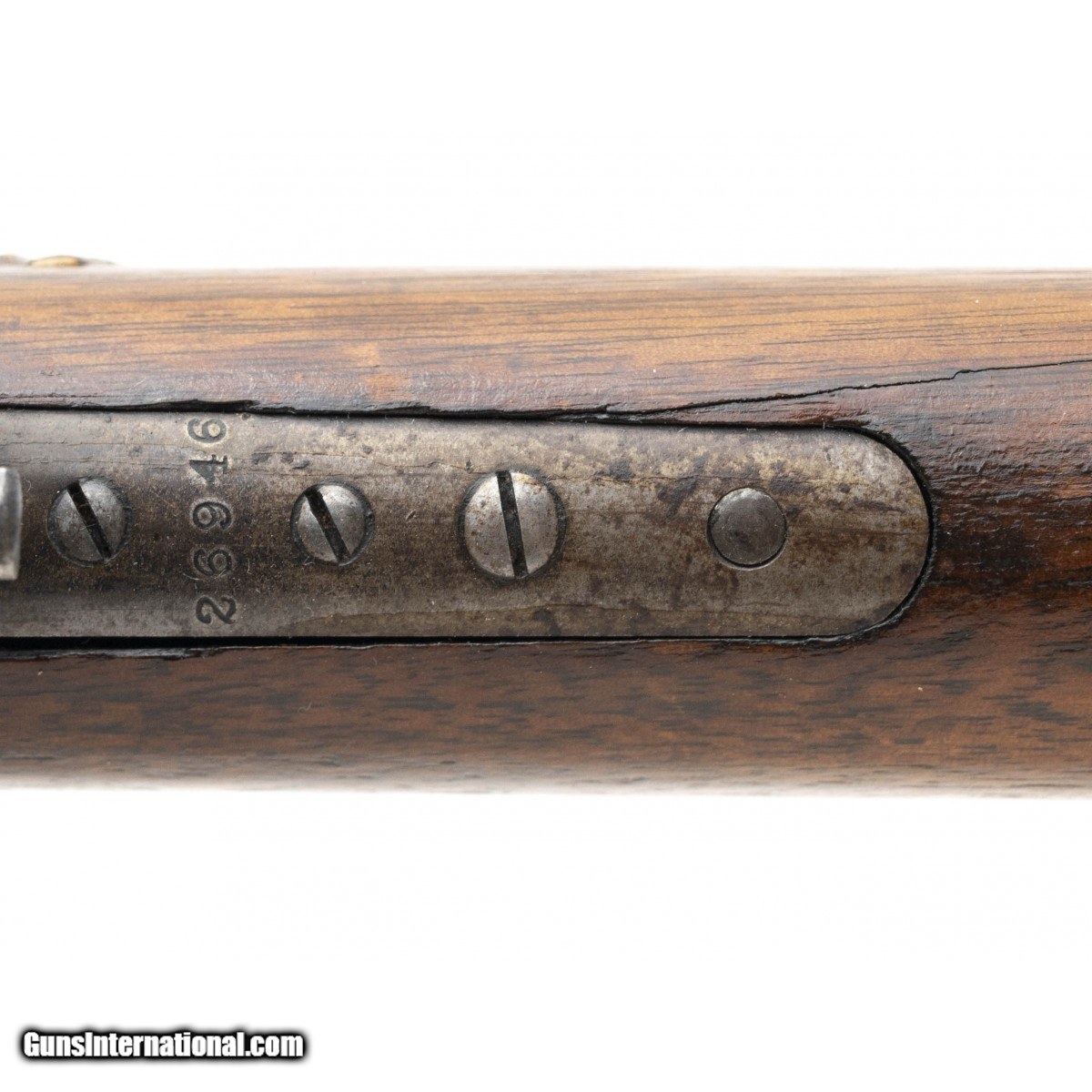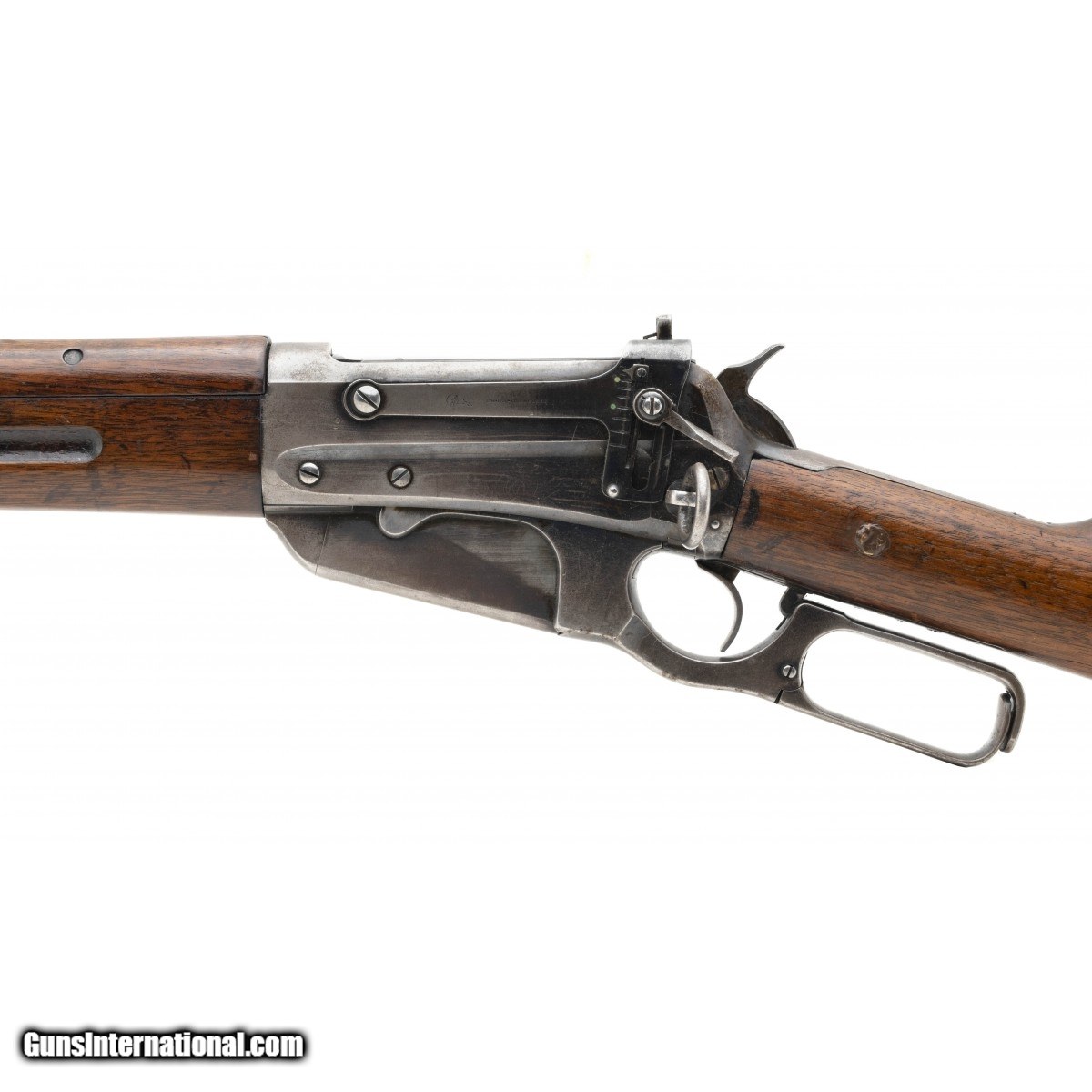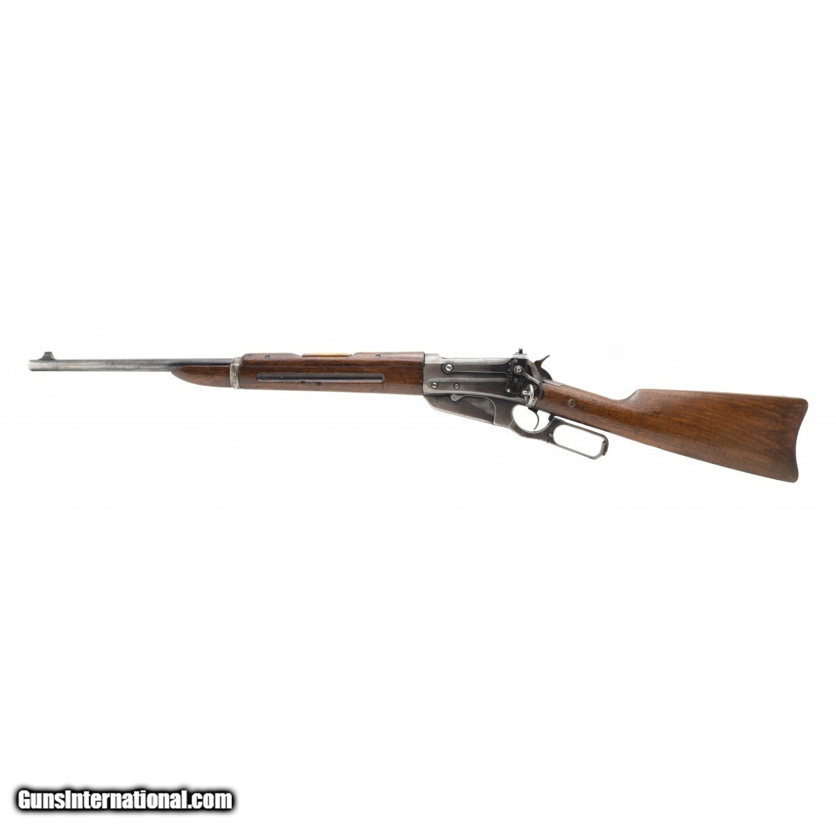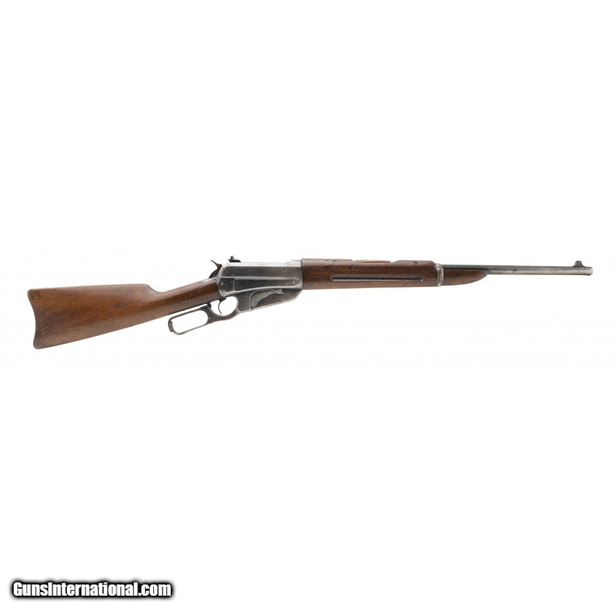 Description: "Serial number 26946. Made in 1900. 30-06 caliber with a 22" barrel. Gun is very good with 70% of the original blue on the barrel. The frame has approximately 50% of the original blue. The wood has had a coat of varnish on both the forearm and the butt stock. The rear sight has been removed and has been replaced with a piece of stag as a filler. The a side sight has been added to the receiver to act as the rear sight. Action works well. Bore is excellent. SOLD Curio/Relic: Yes |
