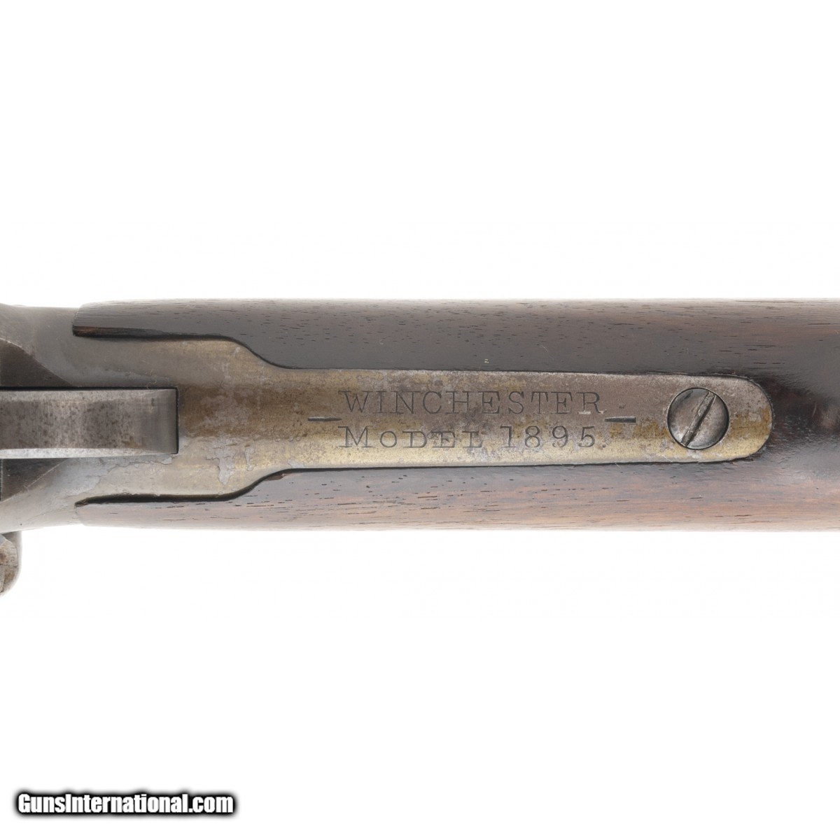 This 30 Government (30-40) Winchester Model 1895 saddle ring carbine is circa 1902. The approx. 22"" round barrel has a good bore with strong rifling and frosting in the grooves. The overall gun has approx. 65% blue with the remainder turning brown. The top of the receiver is marked 30 (for the caliber) and the tang has the standard Winchester markings. This saddle ring carbine is equipped with a Lyman receiver sight. The stocks are very good with no cracks or chips and handling wear including a couple of dents on the right buttstock. The saddle ring is present. The action functions correctly. This nice looking Winchester Model 1895 saddle ring carbine would fit your collection.