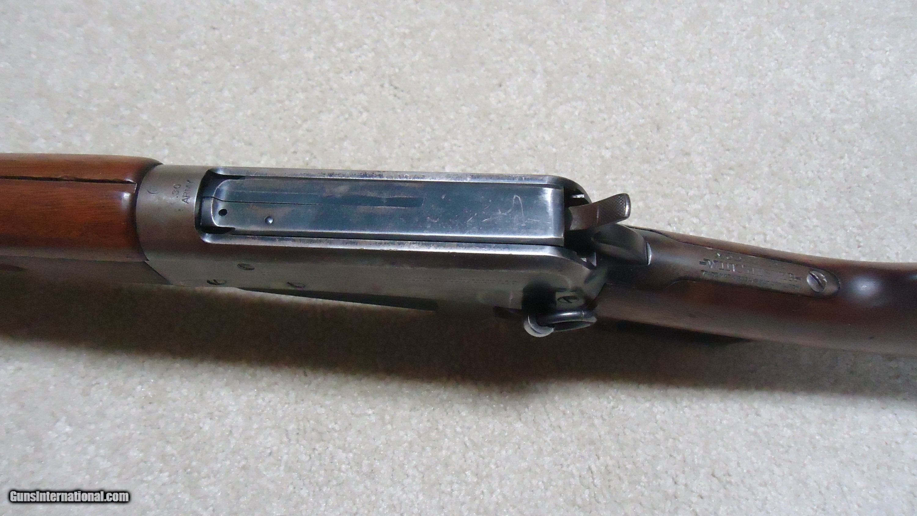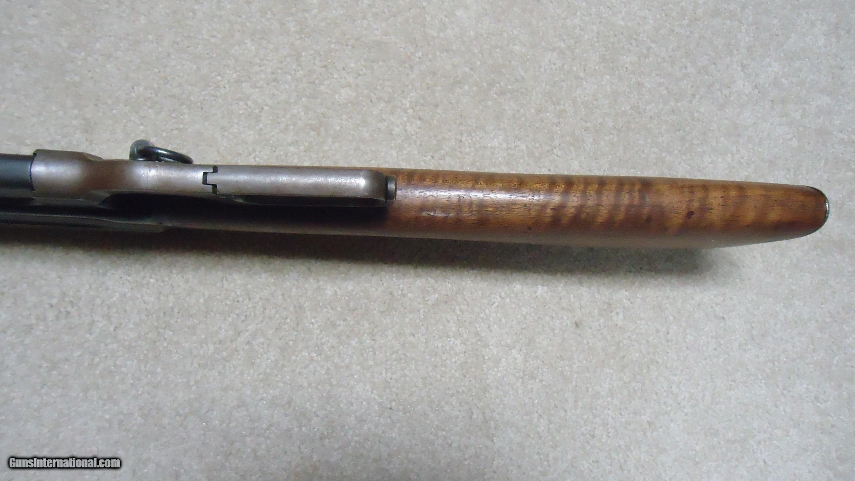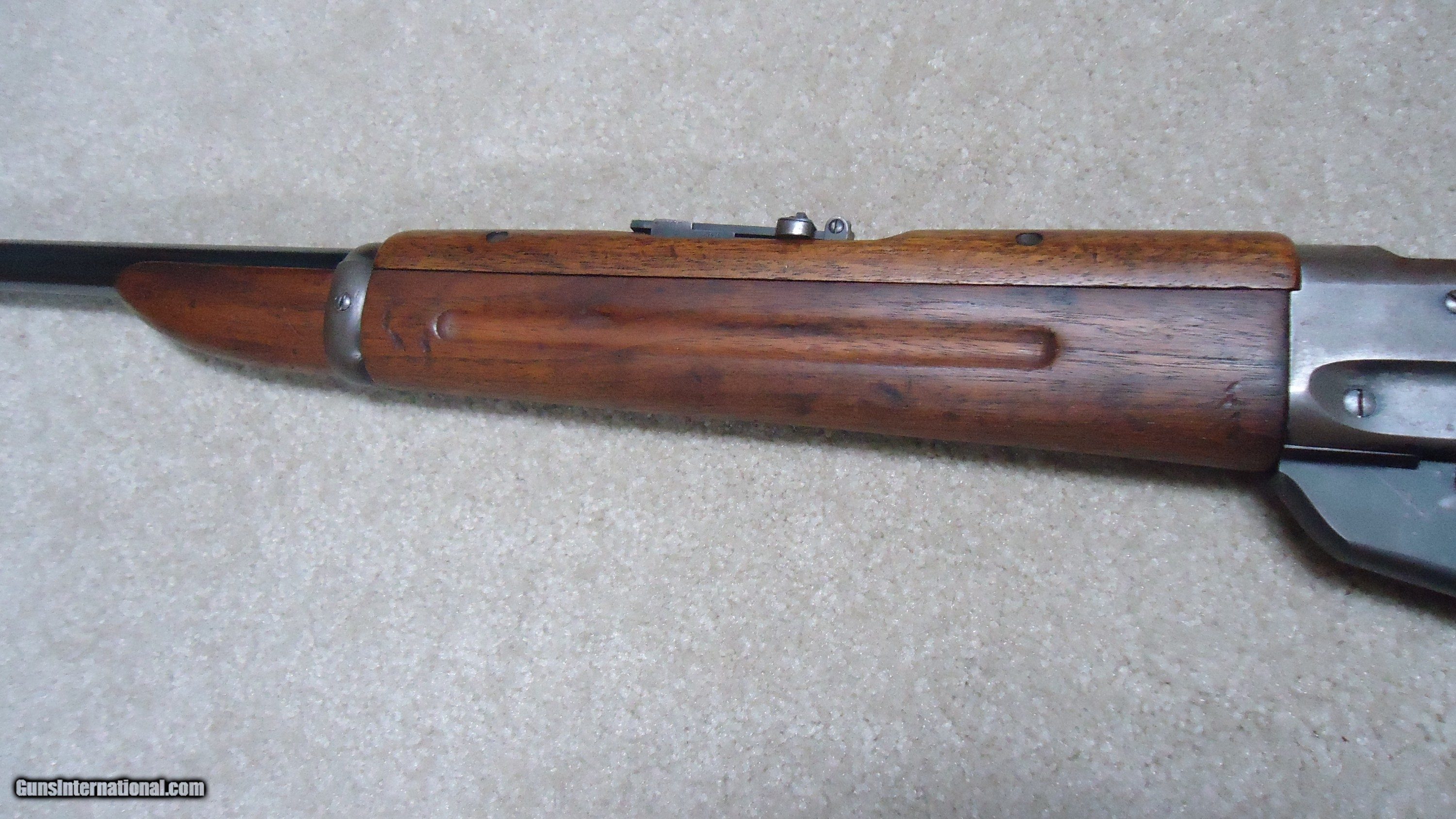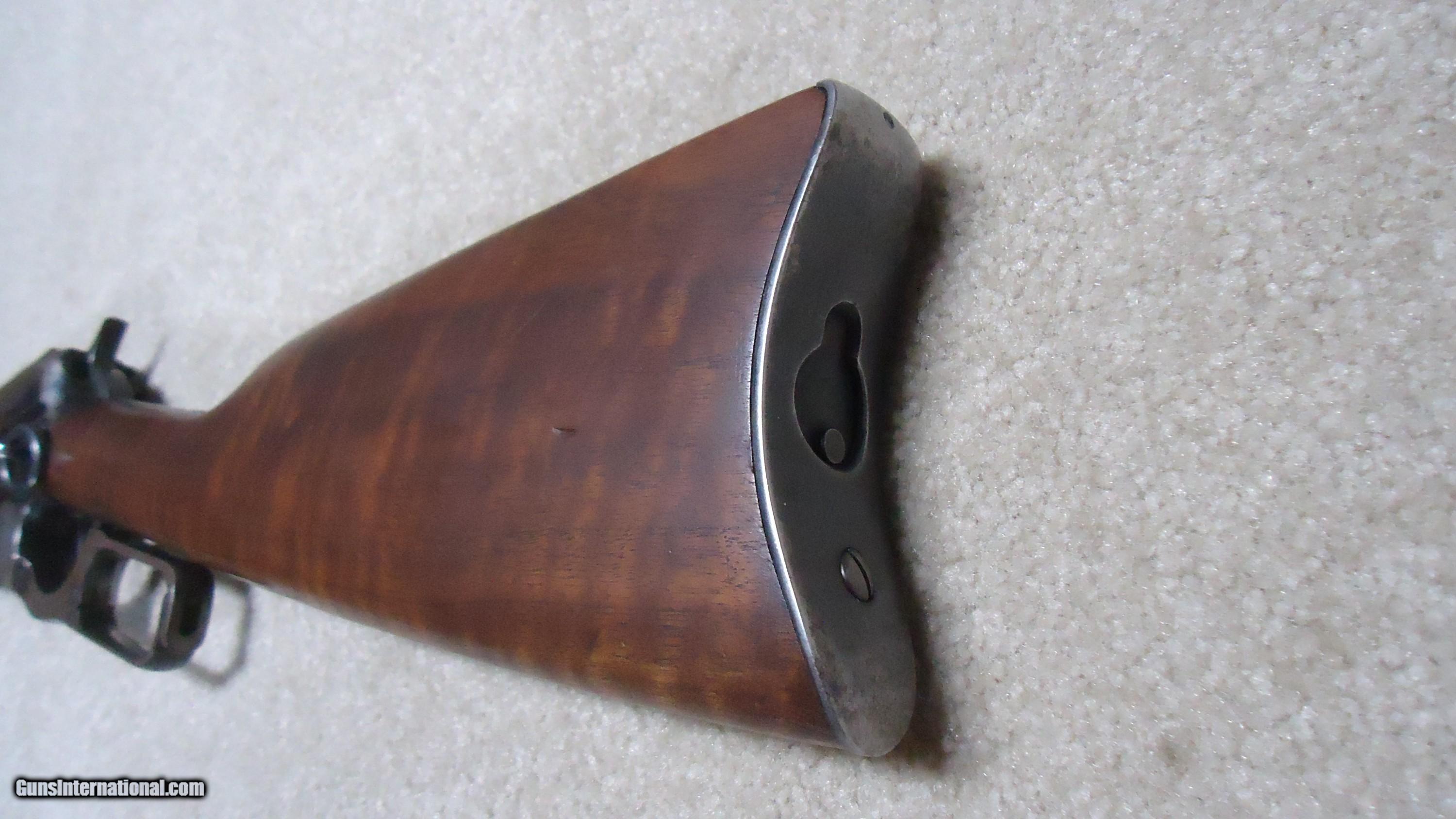 Description: 1895 SADDLE RING CARBINE, .30 ARMY (.30-40 KRAG) CALIBER, #95XXX, MADE 1914. An attractive example with fancier than standard walnut in the butt stock showing some nice fiddle back grain (possibly chosen by a Winchester employee for himself or a friend). The receiver shows good aged blue on the lower portion of the right side and around the saddle ring, as well as dull blue on the magazine. Fine deep blue on most of the bolt, excellent markings on the receiver side and upper tang with no extra holes. The barrel retains most of the orginal deep blue and is fitted with the correct ladder rear sight with small Marble 14 Sheard marked carbine blade front sight. Generally excellent wood with tight wood to metal fit shows light handling only. Correct butt plate with sliding trap door for cleaning rods. Matching handguard has a narrow, well executed, sharp sided square groove behind the rear sight to make sighting easier. So well executed it might be factory done, but no way to tell. Tight action with solid safety half-cock on the hammer. Bore is a little dark with strong rifling all the way through and any corrosion exctremely light and surface. An attractive '95 carbine with unusual wood. These are getting hard to find especially with handguards intact. SOLD Rifle Caliber: .30-40 Krag Manufacturer: WINCHESTER Model: 1895 SADDLE RING CARB. Barrel Length: 22 Condition: FINE Bore Condition: FINE+ |