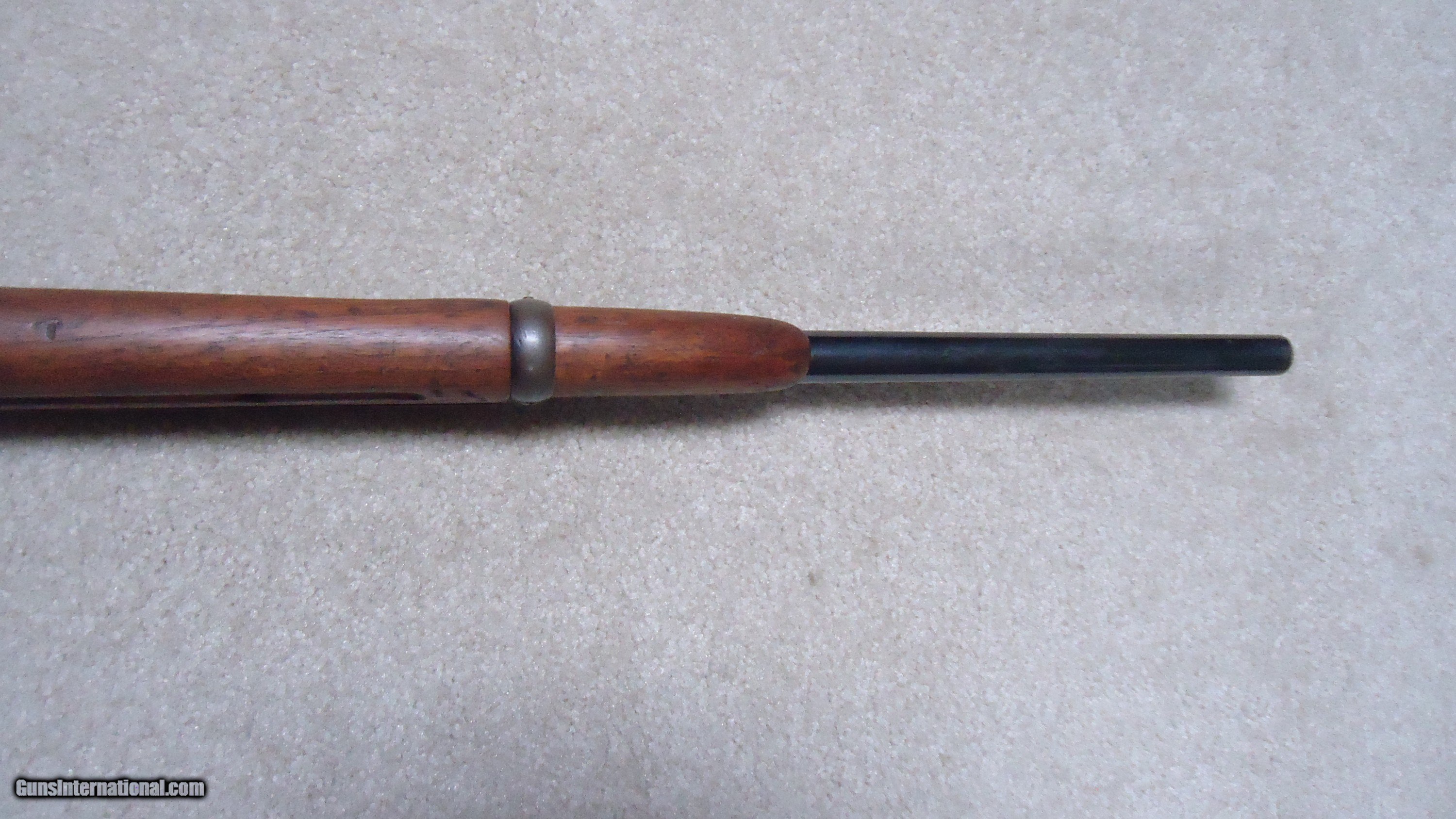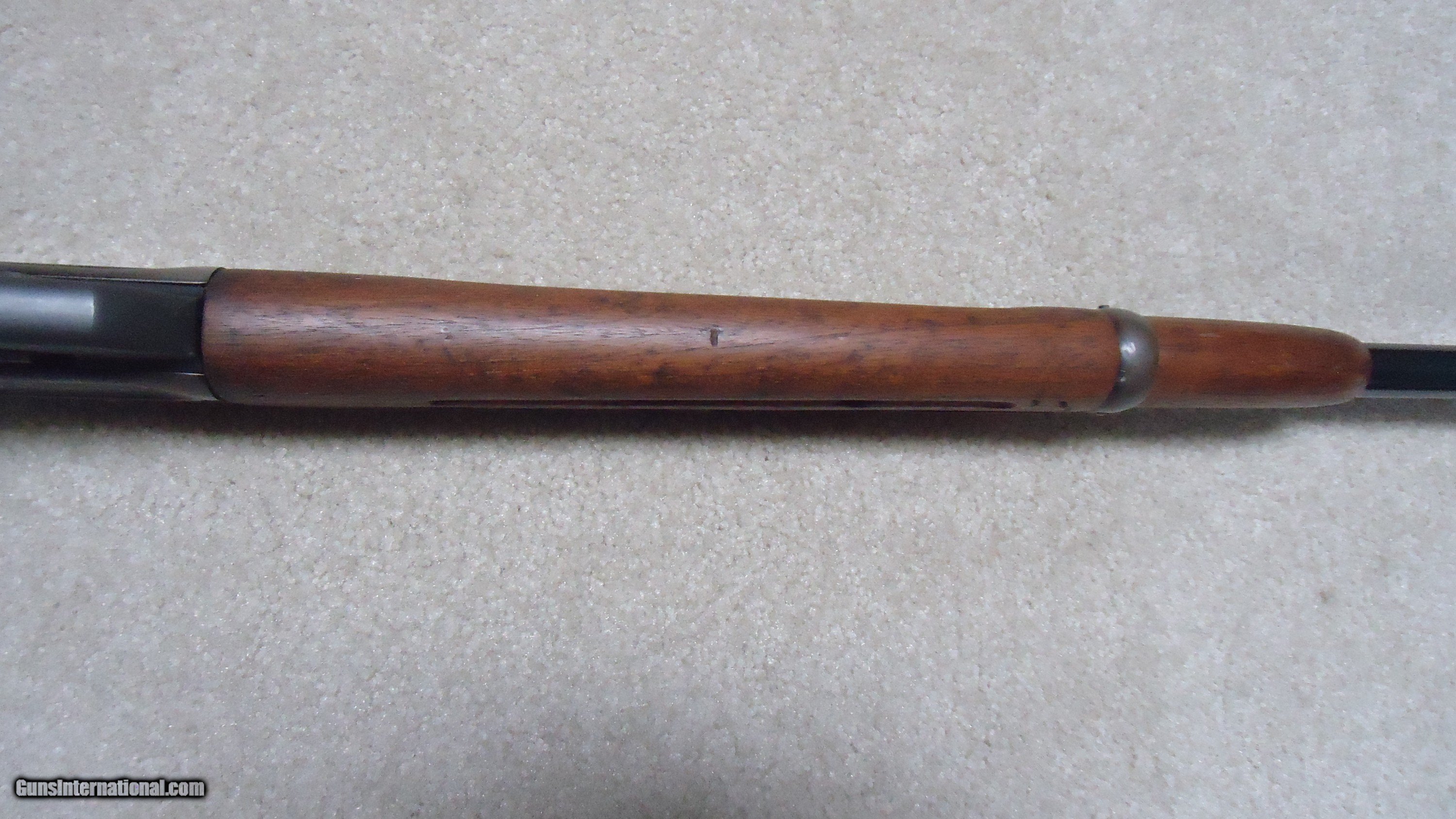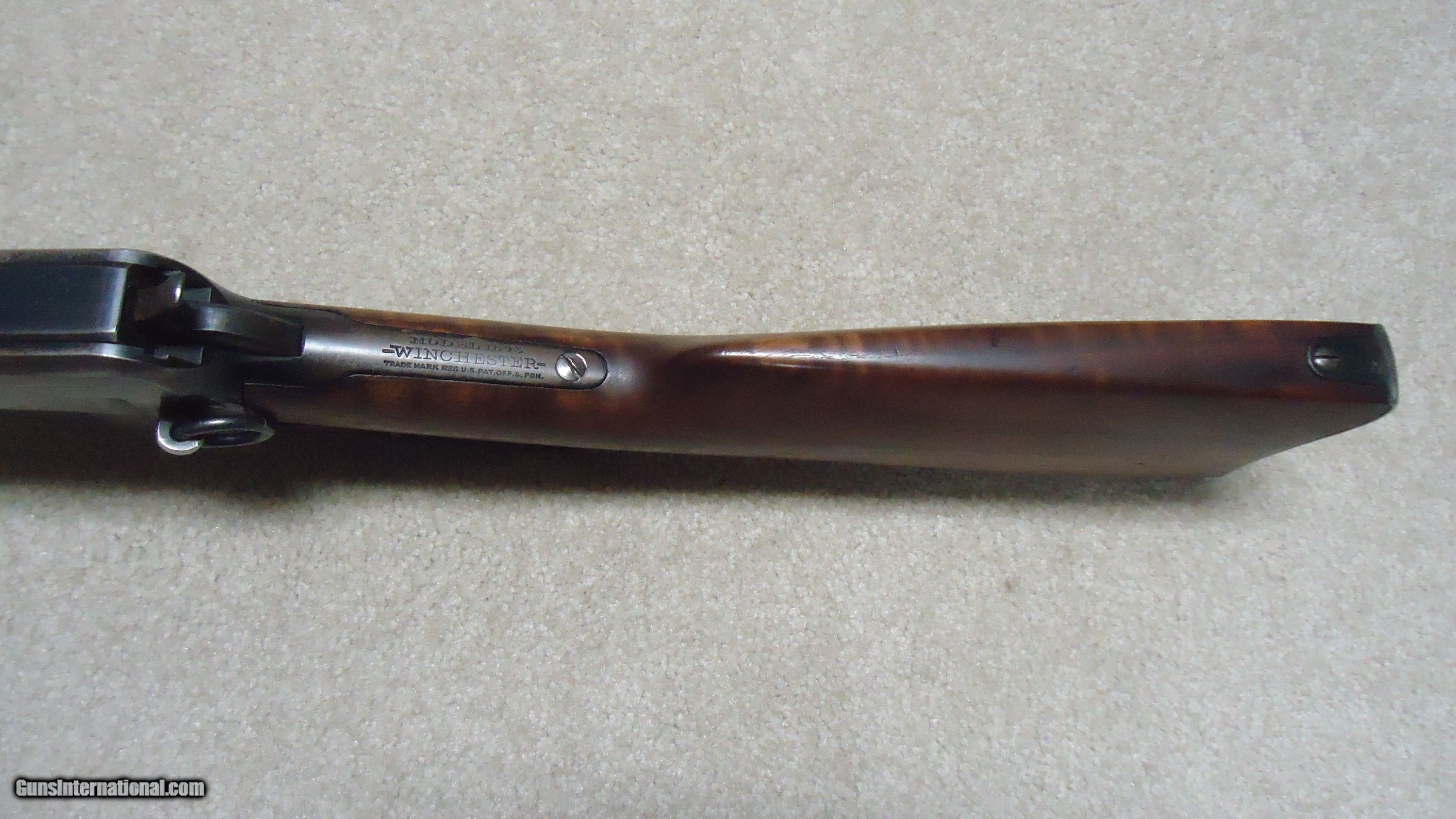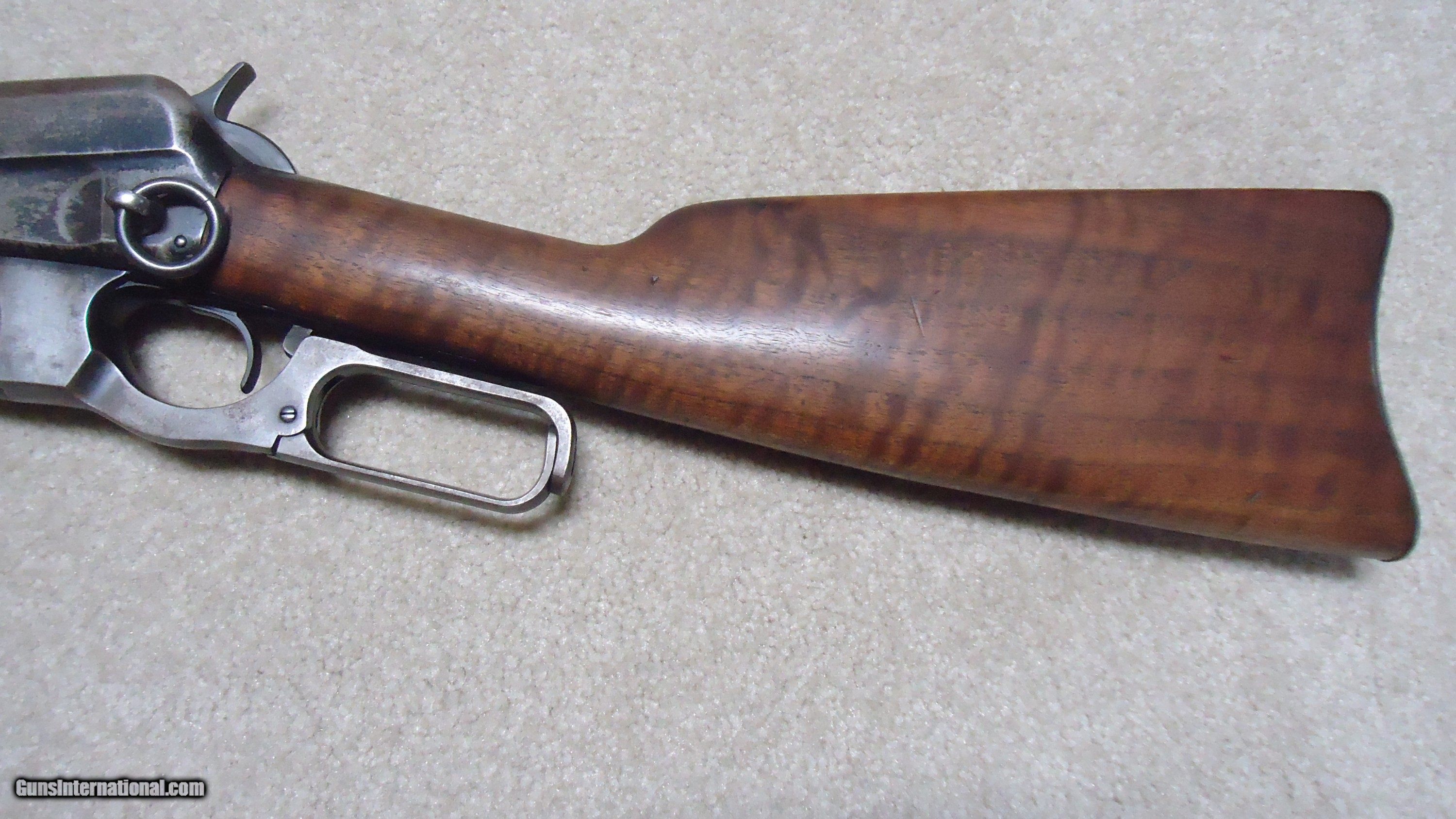 Description: 1895 SADDLE RING CARBINE, .30 ARMY (.30-40 KRAG) CALIBER, #95XXX, MADE 1914. An attractive example with fancier than standard walnut in the butt stock showing some nice fiddle back grain (possibly chosen by a Winchester employee for himself or a friend). The receiver shows good aged blue on the lower portion of the right side and around the saddle ring, as well as dull blue on the magazine. Fine deep blue on most of the bolt, excellent markings on the receiver side and upper tang with no extra holes. The barrel retains most of the orginal deep blue and is fitted with the correct ladder rear sight with small Marble 14 Sheard marked carbine blade front sight. Generally excellent wood with tight wood to metal fit shows light handling only. Correct butt plate with sliding trap door for cleaning rods. Matching handguard has a narrow, well executed, sharp sided square groove behind the rear sight to make sighting easier. So well executed it might be factory done, but no way to tell. Tight action with solid safety half-cock on the hammer. Bore is a little dark with strong rifling all the way through and any corrosion exctremely light and surface. An attractive '95 carbine with unusual wood. These are getting hard to find especially with handguards intact. SOLD Rifle Caliber: .30-40 Krag Manufacturer: WINCHESTER Model: 1895 SADDLE RING CARB. Barrel Length: 22 Condition: FINE Bore Condition: FINE+ |