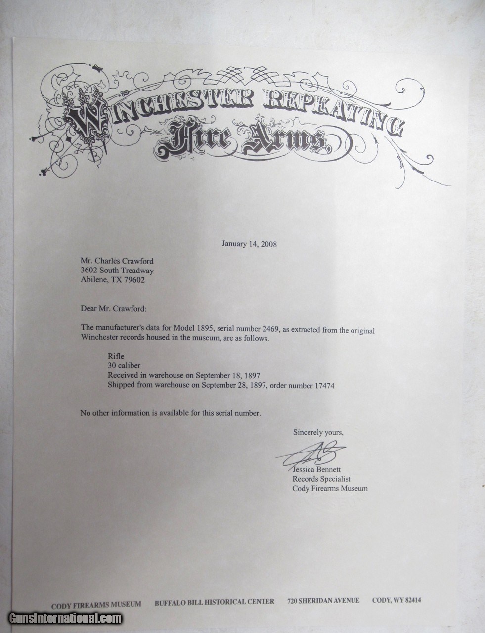 Winchester Model 1895 Lever-Action Rifle; Serial No. 2469; Per Included Factory Letter: Rifle in 30 U.S. Caliber (30-40 Krag); Shipped September 28, 1897; 28” Round Barrel; Rare Flat Side Antique Model 1895; Most of the Original Metal and Wood Finish Remains; Perfect Action and Bore; Beautiful Original 128 Year-Old Winchester; Probably the Finest in Existence; See All Photos for Condition; No Texts; Call (254)541-5765 or Email Only; PERSONAL PROPERTY of Harold Wieser;NOTICE: We Do Not Do Any Consignments - All Items Listed are Owned by Us - NO SALES to New Jersey or New York City - Antiques Only to Massachusetts and California;NOTE: All Modern Firearms Must Go to FFL Dealer who will Accept From Individual with Texas Driver License; Price: $12,975 + $100 S&H; Payment Address: Harold Wieser - 1466 U.S. Hwy 77 - Rosebud, TX 76570; SEND PAYMENTS VIA USPS PRIORITY MAIL;BEWARE of SCAMS!!! - DO NOT SEND MONEY or CORRESPONDENTS ELECTRONICALLY UNLESS YOU HAVE SPOKEN to HAROLD WIESER FIRST! (254)541-5765