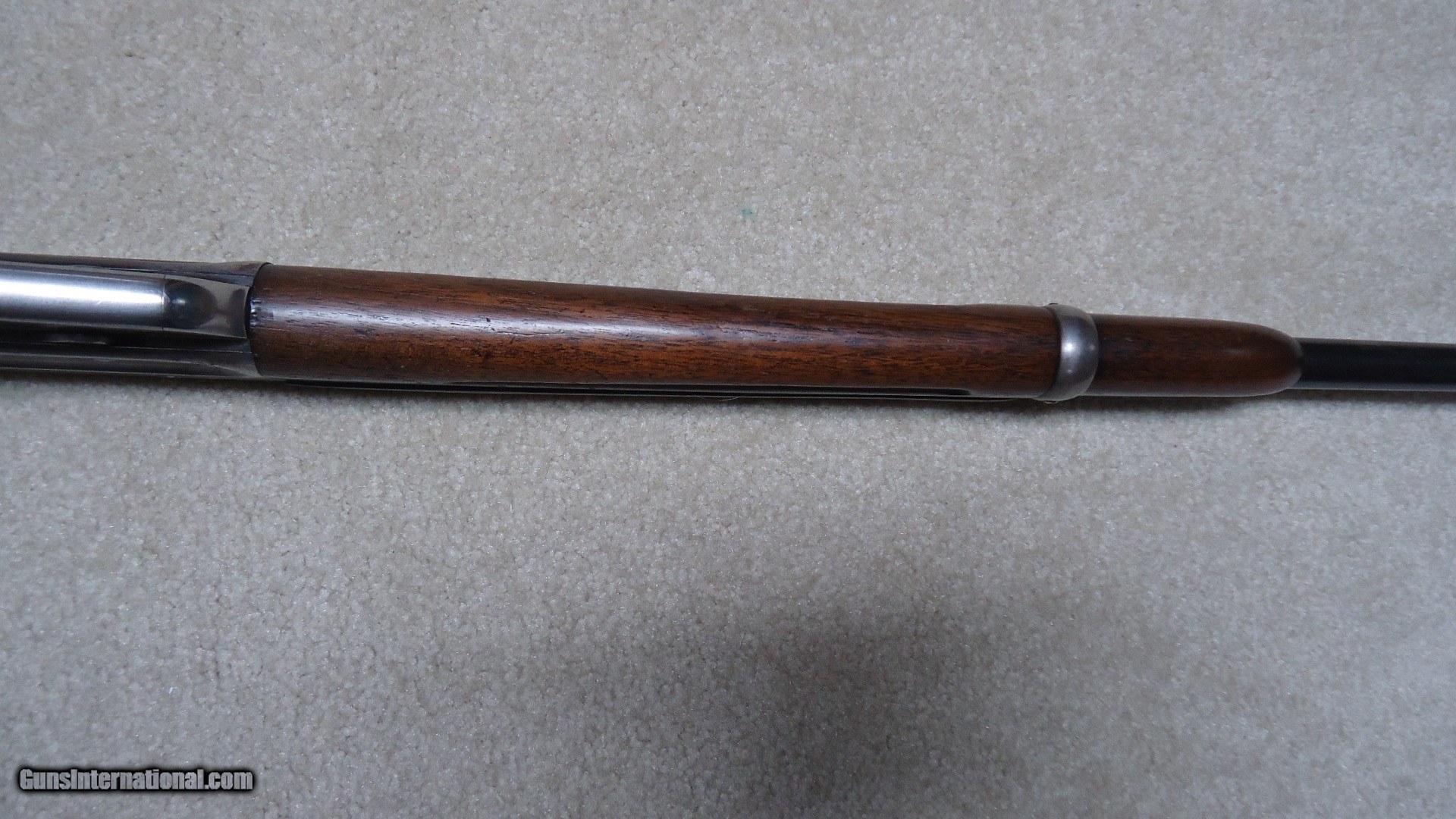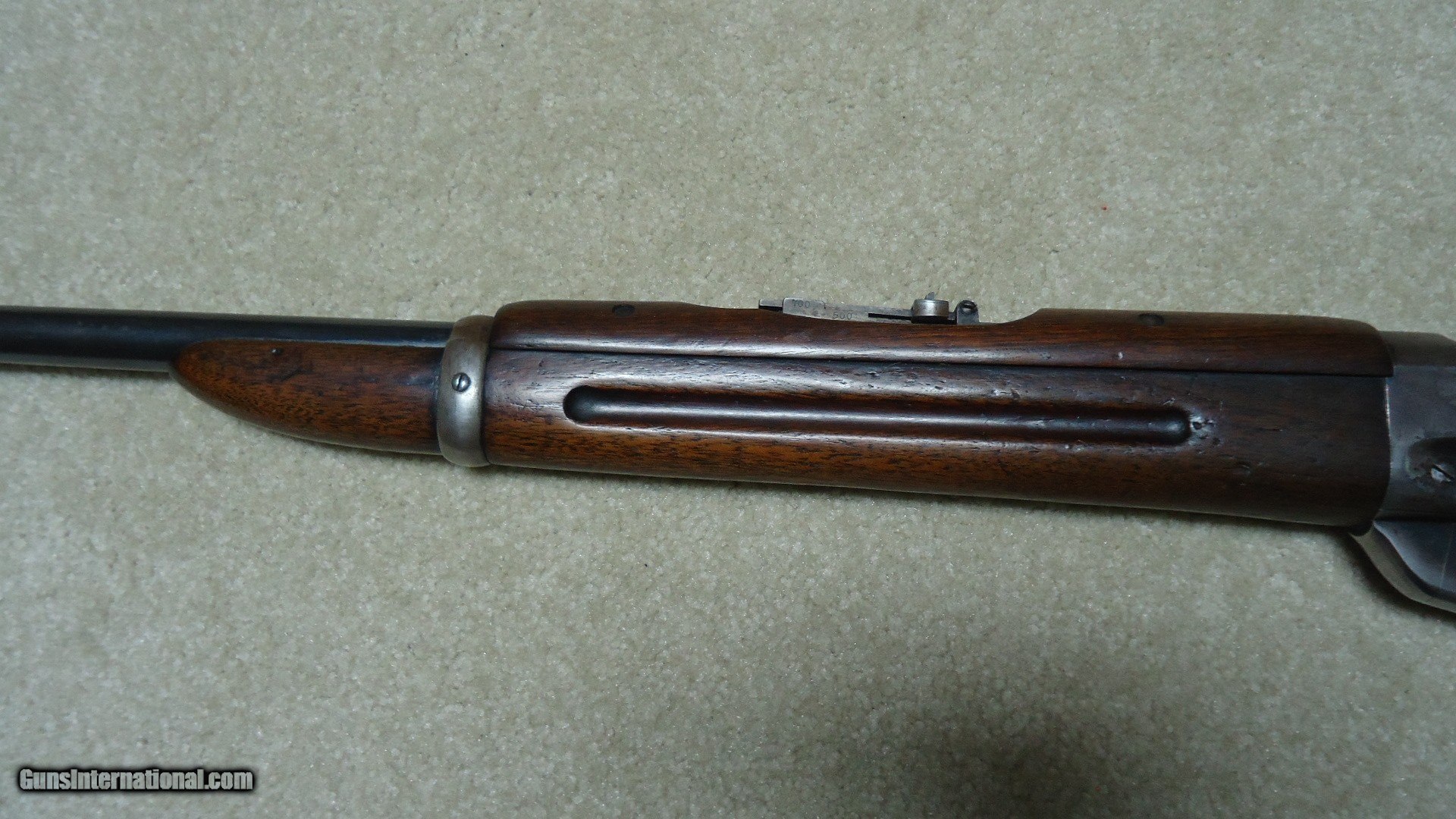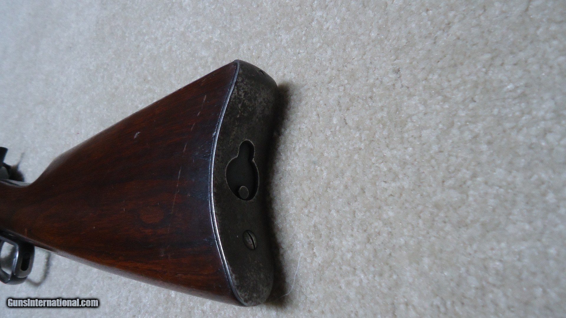 Description: EARLY 1895 SADDLE RING CARBINE, .30-40 KRAG CALIBER, #27XXX, WITH FACTORY LETTER SHOWING SHIPMENT IN AUGUST OF 1900. These were especially popular with the Arizona and Texas Rangers during this time. This is a fine example that still shows fine barrel blue with only a couple of small spots of minor scuffs. Front sight is a pinned blade/bead in the original ramp along with the original long ladder rear sight. The receiver and bolt show good and thinning blue in the more protected areas of the receiver and magazine with the balance ageing/mixing gray. The action is tight and the bore is sharp and excellent. All markings are sharp. The butt stock is generally excellent with only light handling and tight wood to metal fit. The forend also shows light handling. The matching handguard (these almost always missing) has a thin crack coming forward from the receiver ring to the right corner by the rear sight. The forend is tight and fits properly. A fine and early example. SOLD Rifle Caliber: .30-40 Krag Manufacturer: Winchester Model: 1895 CARBIINE Serial Number: 27XXX Barrel Length: 22 Condition: FINE Bore Condition: EXCELLENT |