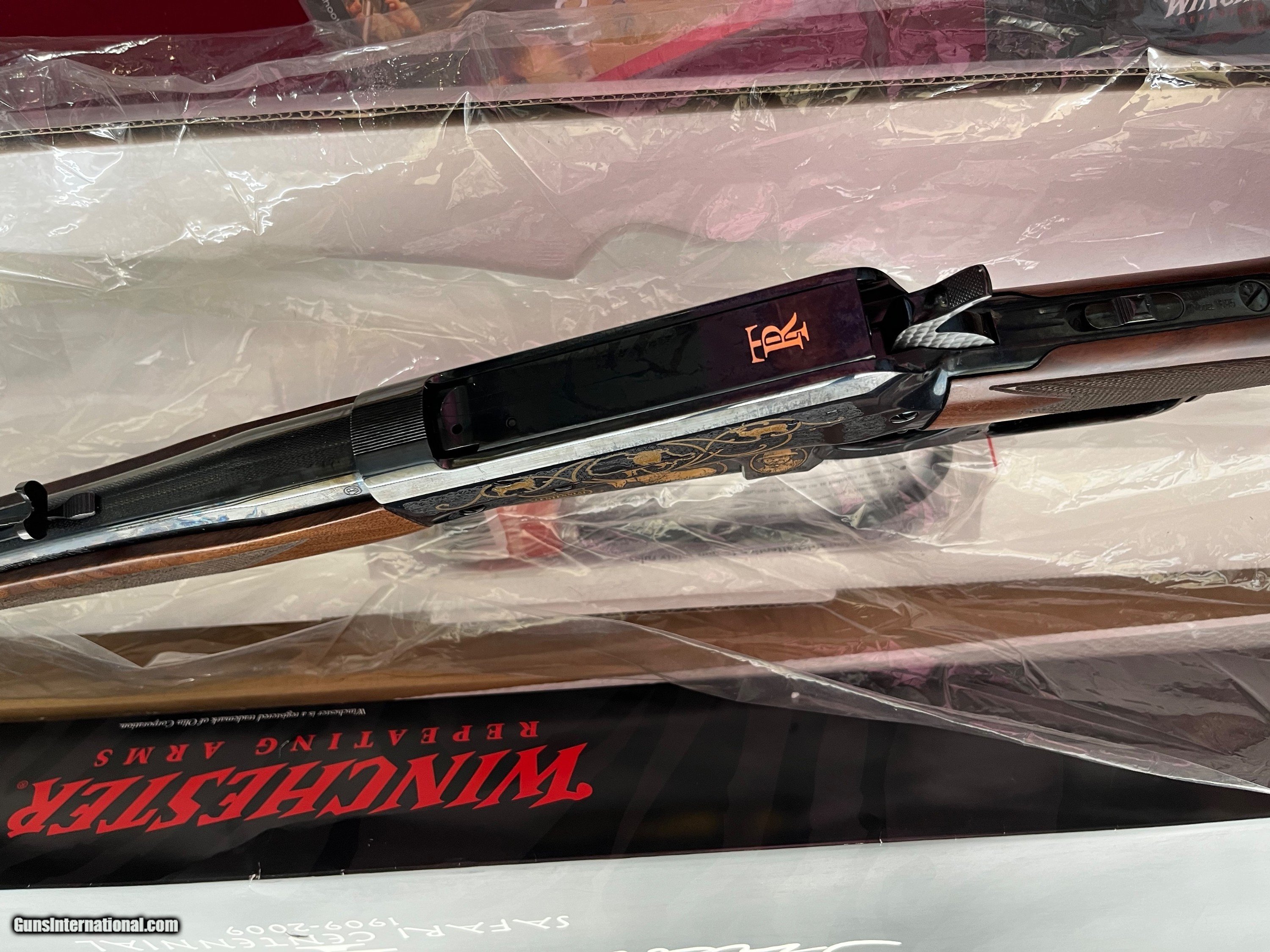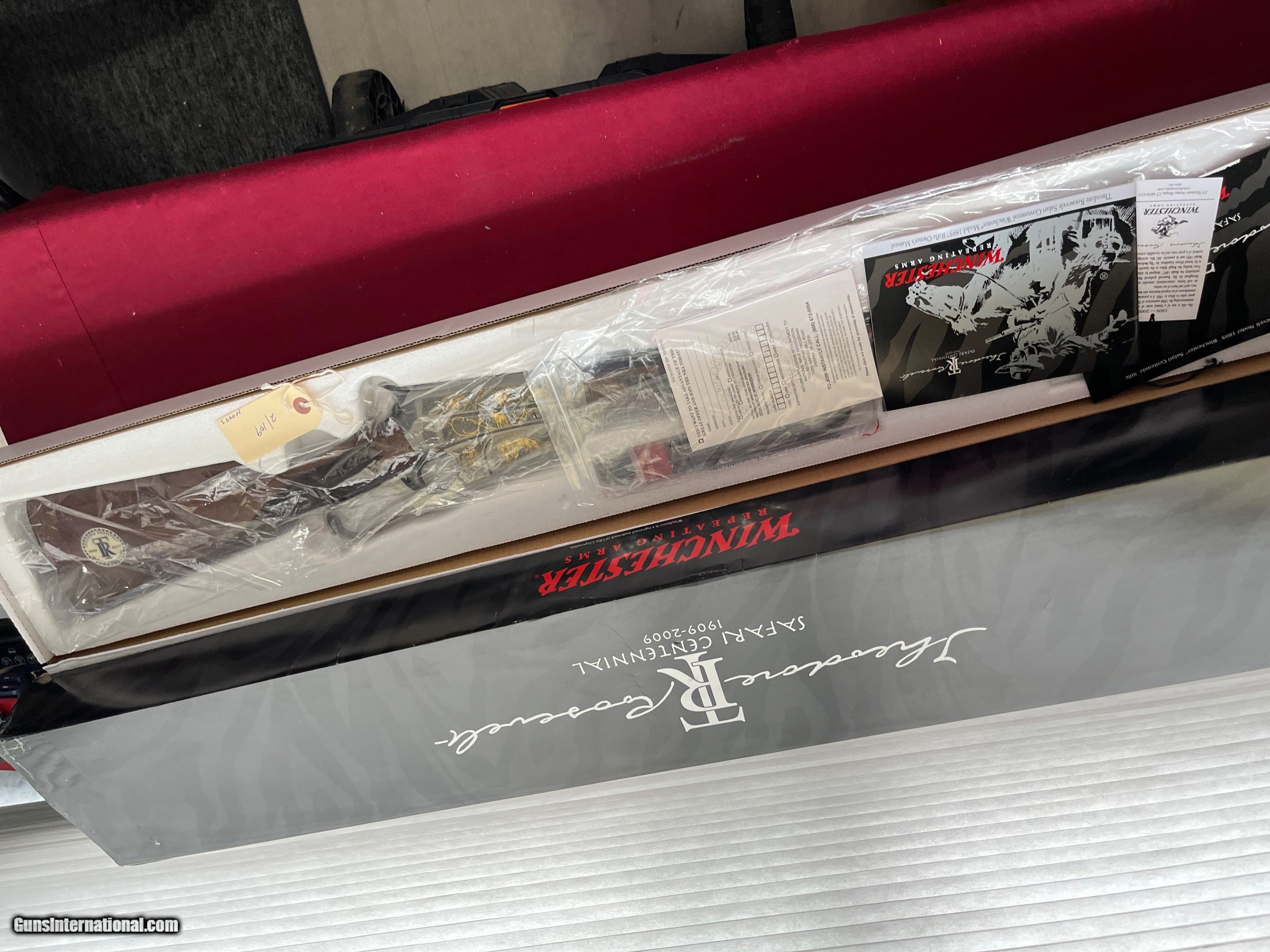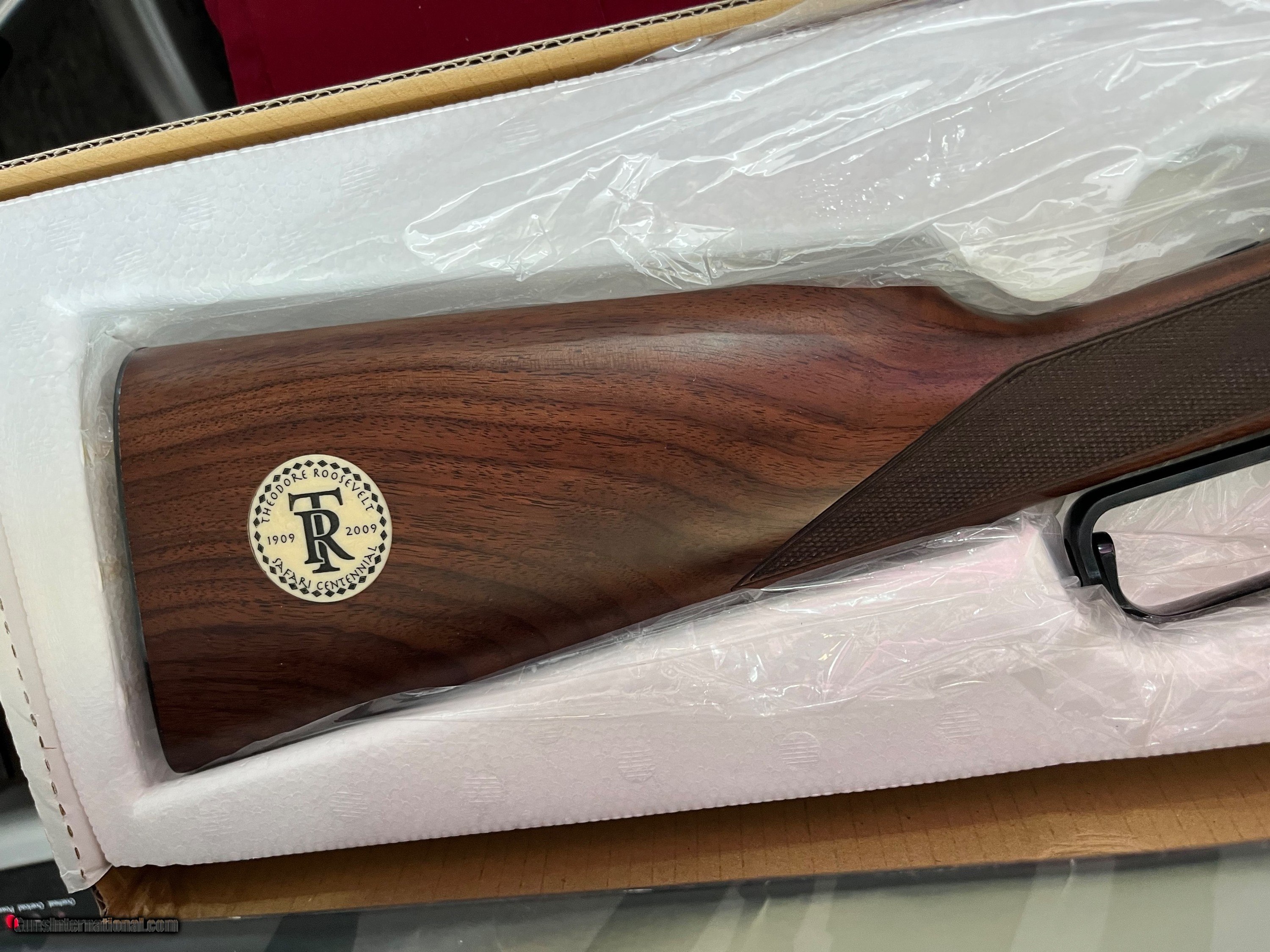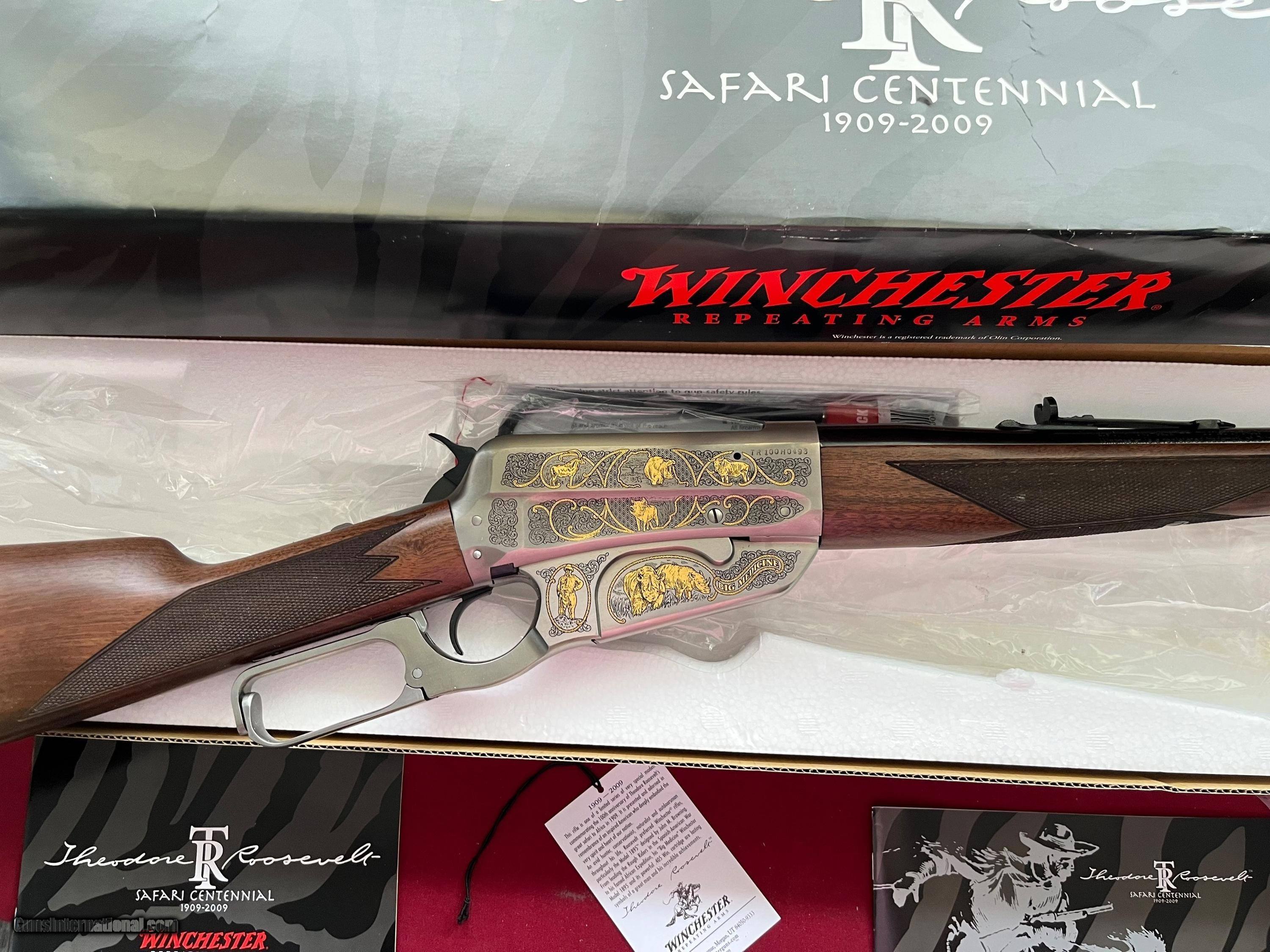 Description: Winchester Model 1895 Engraved Limited Edition Roosevelt Safari High Grade Lever Action Rifle 405 Win THIS SALE IS FOR A SET OF TWO RIFLES . RIFLE 1, serial #TR100H0493, 405 Win., 24” round barrel with a mint bore. This rifle is one of only 1000 two gun sets manufactured in 2009 to commemorate the 100th anniversary of President Roosevelt’s African safari. The barrel retains 99% plus original blue with factory label still affixed to underside of barrel. The bolt, hammer and trigger retain 99% plus original blue as well and the top of the bolt has gold intertwined “TR” initials. The silver nitride action is engraved with scroll and gold accented African game and the President standing with rifle on both sides. The right side of the magazine shows “BIG MEDICINE” in riband while the left side shows “THEODORE / ROOSEVELT / SAFARI / CENTENNIAL” and “1909 / 2009” in matching ribands. The bottom of triggerguard has facsimile Theodore Roosevelt signature. The checkered grade II/III walnut straight grip buttstock and schnabel forend retain all their satin oil finish, the right side of the buttstock has inlaid faux ivory centennial medallion. Rifle is sighted with a Marble’s gold bead front sight and Buckhorn rear sight. Included with the rifle is the original factory cardboard box with outer sleeve, manual, instruction sheet, hang tag and lock. I also have a Winchester Safari High Grade rifle with matching serial number to the rifle listed. RIFLE 2 - serial #TR100C0493, 405 Win., 24” matted round barrel with a mint bore. This rifle is one of only 1000 two gun sets manufactured in 2009 to commemorate the 100th anniversary of President Roosevelt’s African safari. The metal surfaces retain 99% plus original high luster blue, the muzzle is accented with a braided gold band while the top of the bolt has gold intertwined “TR” initials and the bottom of the triggerguard has facsimile Theodore Roosevelt signature. The action is engraved with scroll and gold accented African game and the President standing with rifle on both sides. The right side of the magazine shows “BIG MEDICINE” in riband while the left side shows “THEODORE / ROOSEVELT / SAFARI / CENTENNIAL” and “1909 / 2009” in matching ribands. The hammer and some of the internal action parts have a bright jeweled finish. The checkered grade III/IV walnut straight grip buttstock and schnabel forend retain all their satin oil finish, the right side of the buttstock has inlaid faux ivory centennial medallion. Rifle is sighted with a Marble’s gold bead front sight and Buckhorn rear sight. Included with the rifle is a lightly worn original factory cardboard box with separated end flap, outer sleeve, manual, instruction sheet and lock. A lovely Safari Custom Grade rifle with matching serial number to the rifle EASTERN BRANCH FIREARMS ADD 75.00.00 SHIPPING –2 LONG GUNS USPS PRIORTY MAIL OPTIONAL INSURANCE IS AVAILABLE AT 1.25 PER 100.00 SORRY NO MORE UPS SHIPPING – THERE POLICY NOT TO SHIP GUN AS OF 8/29/2022 Questions e-mail or call Glen at Eastern Branch Firearms 207-215-5021 TERMS – PLEASE READ BEFORE I DO NOT HAVE A LAYAWAY OPTION ( WE ACCEPT CREDIT CARDS ) -- I GET ALOT OF REQUEST FOR TRADES, I WOULD PERFER NOT TO DO TRADES ON MY INTERNET LISTINGS PAYMENT OPTIONS- We accept money orders, cashier’s checks , bank checks. sorry no personal checks. We accept all major credit cards please add 3% to the ’s cash discount price.(Shipping within the state of Florida - Florida Residents must pay sales tax) .Handguns and long guns do need to be shipped separate. PLEASE do not send payment via FED EX . USPS & UPS are fine. Thank you. We include a signed copy of our FFL with each firearm shipped. SAFTY NOTICE- Buyer is solely responsible for determining that a used gun is safe to shoot. The firearms offered have not been test fired but have been given a visual inspection only for purposes. It is a requirement that every used firearm is inspected by a qualified gunsmith before firing. By , the buyer agrees to hold seller harmless against damages, injury, or death caused by defective merchandise. RETURN POLICY- All firearms come with a 3-day non firing , non messing with ( turning srews ,taking apart,removing parts, scoping. firing, cleaning or messing with in anyway) inspection/return privilege.Inspection is based on a visual review of the gun to confirm the gun is in the condition stated. In the case of a return, buyer pays all shipping charges & if paid for with a credit card buyer absorbs the 3% credit card charges . So please ask questions BEFORE you bid. Thanks for Looking and Good Luck!! U.S. sales only, no exports…this includes antiques. I will ship to third party for exporting SOLD |
