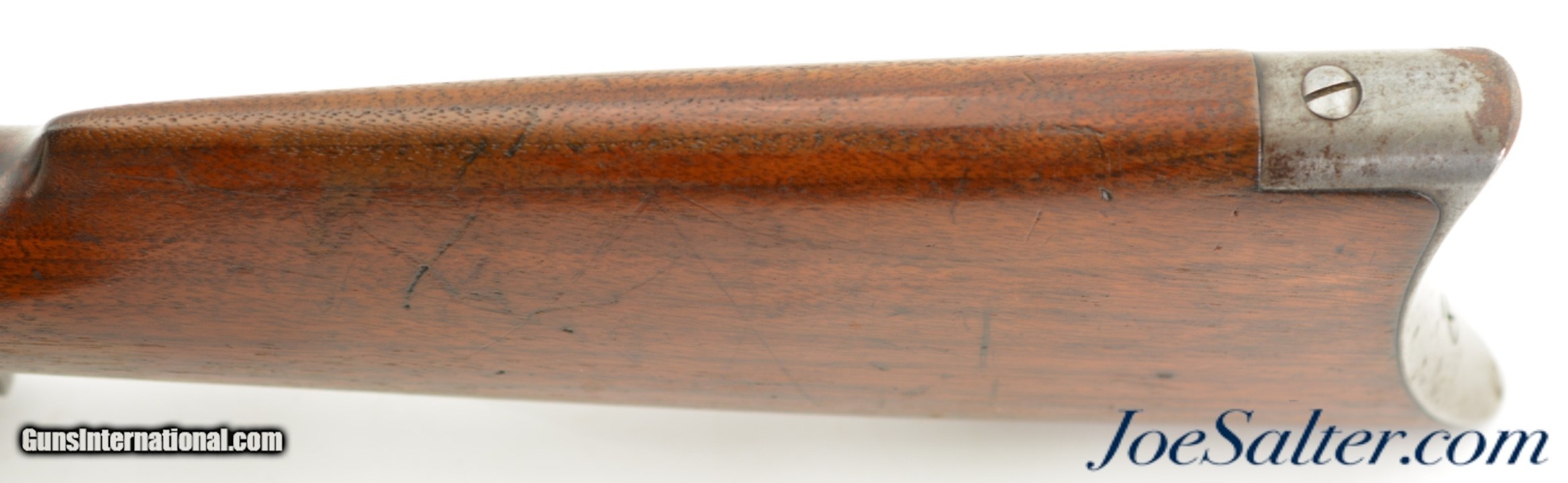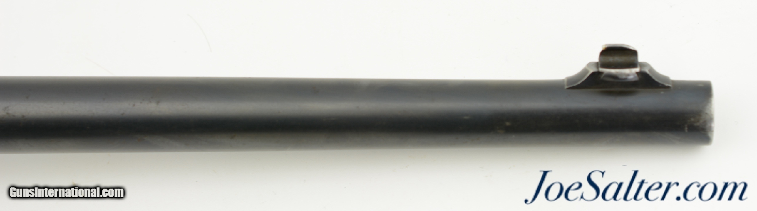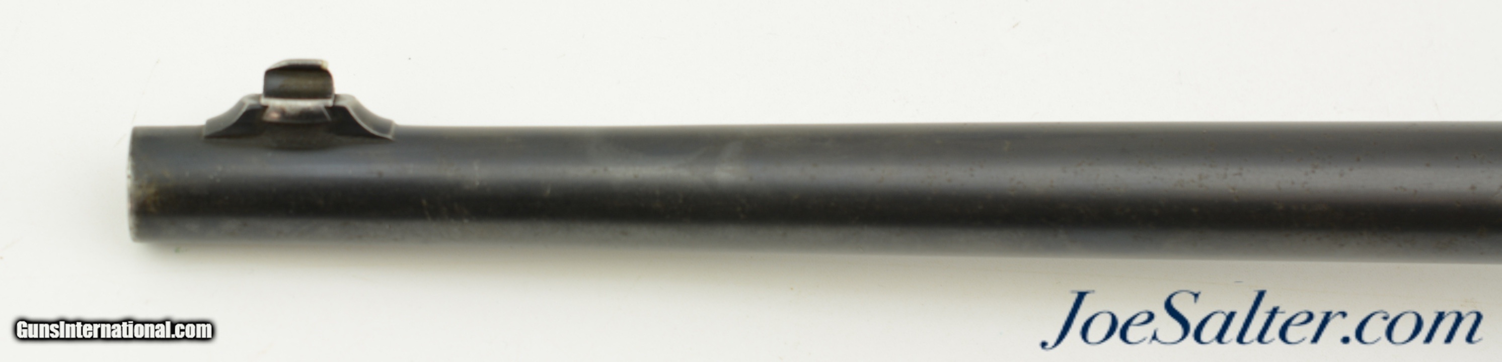 Description: Serial #84445, .30-03 US, 24" barrel with a fine, bright bore that has minor freckling within the grooves. This is a 1914-made rifle that has 80-85% of the original blue remaining on the barrel, with spots of plum-brown freckling along its length, as well as silvering at the muzzle and some impact marks on either side of the rear sight dovetail. The frame has a mostly pewter gray patina with more brown freckling, but retains some of the original blue on the sides of the magazine and lever. A Lyman 21 climbing rear sight was once installed on the left side of the receiver, with a more recent sporting type rear sight fitted into the barrel dovetail. The walnut forend and buttstock have small handling marks and surface blemishes throughout an old, added oil finish. This is a very nice example of a Winchester Model 1895, and chambered in one of Teddy Roosevelt’s favorite cartridges. FFL or C&R SOLD Curio/Relic: Yes |